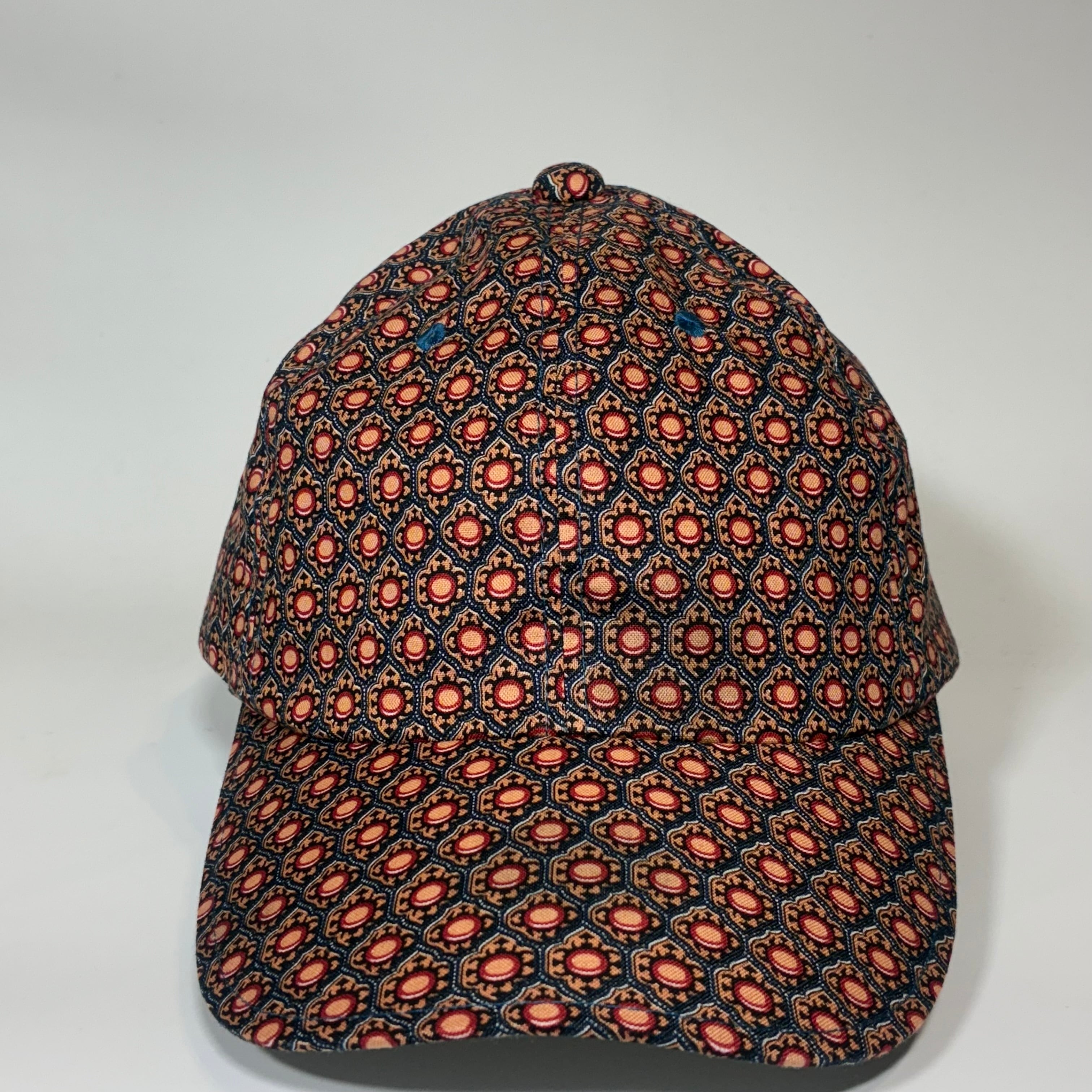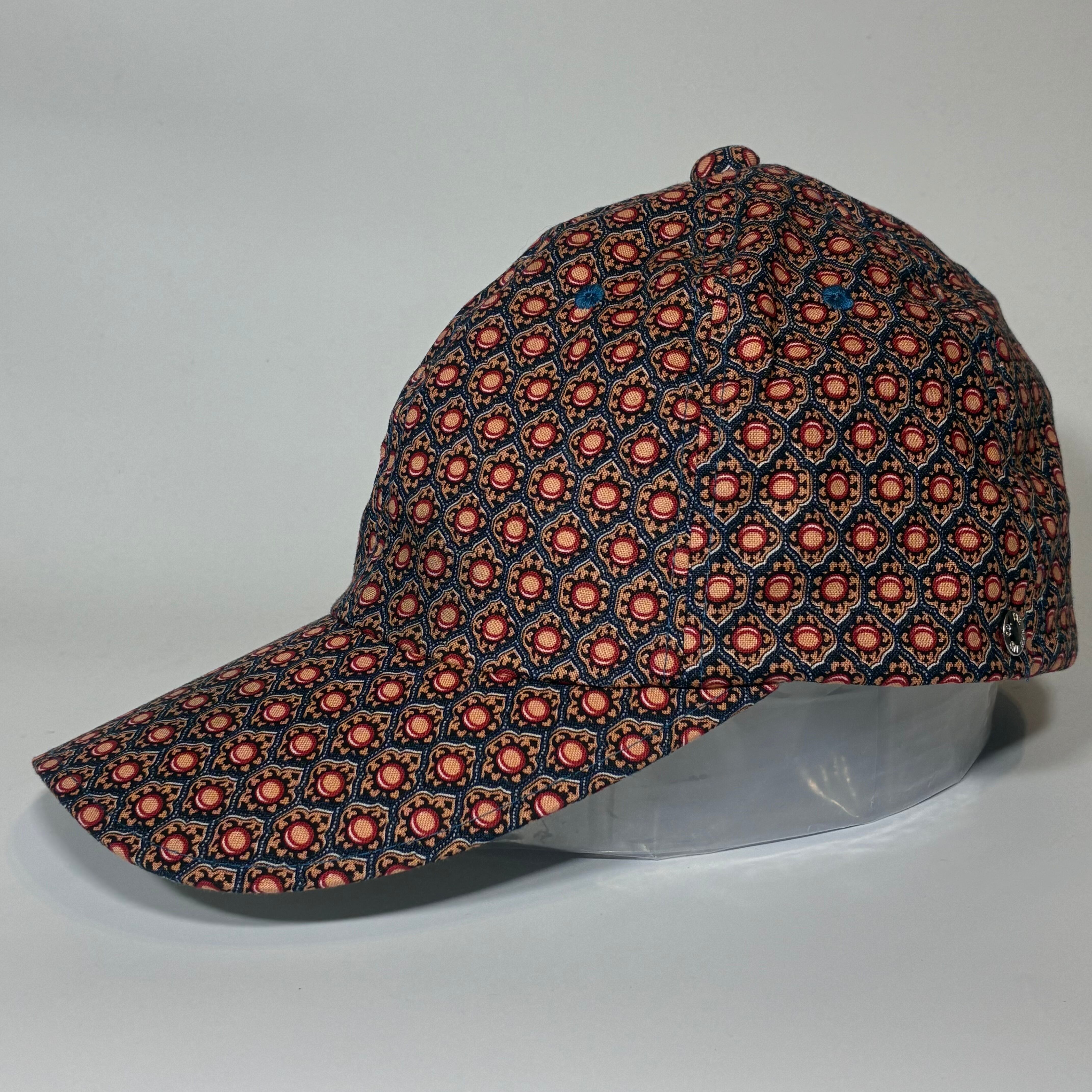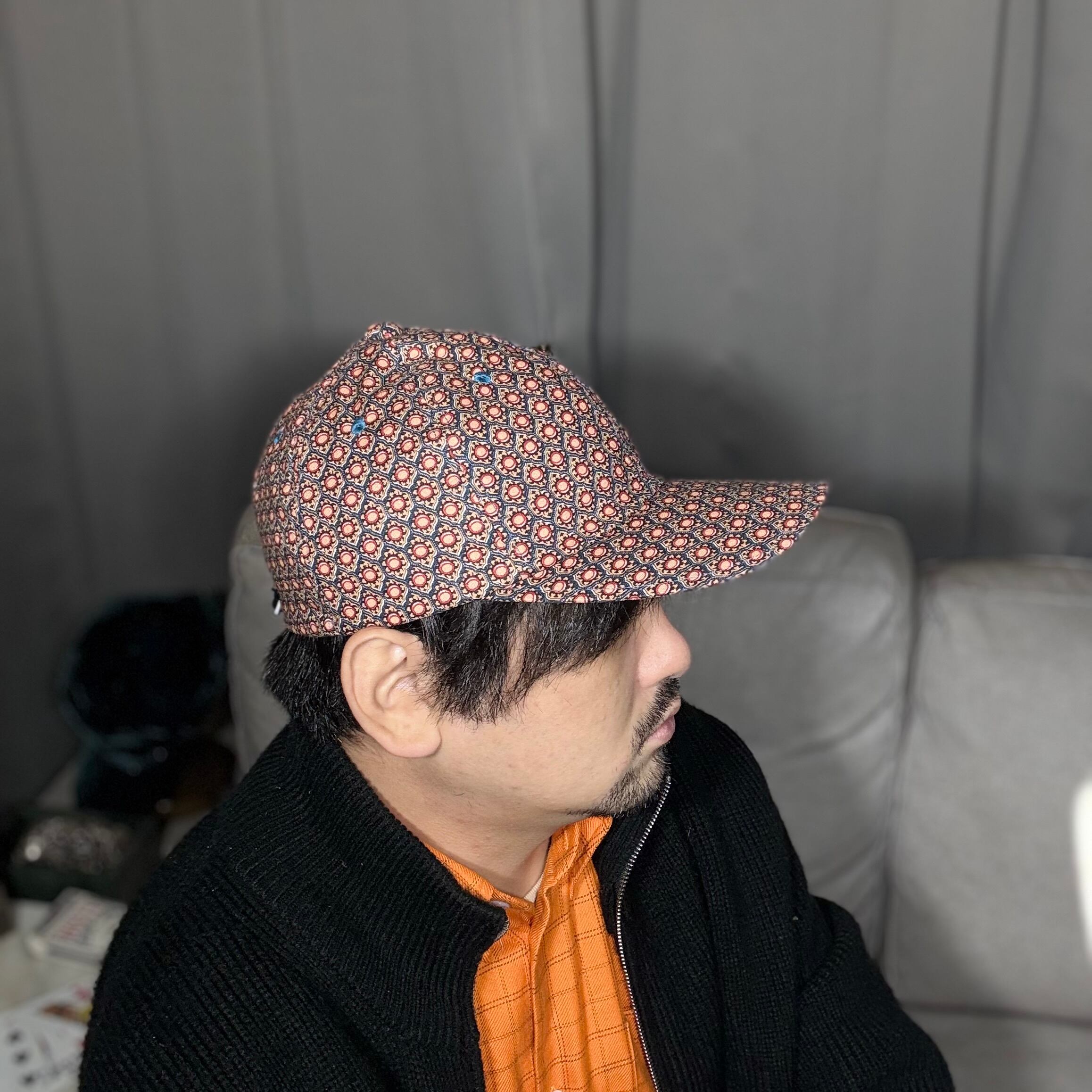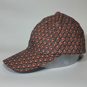 小振りな規則正しく並べられた模様がプリントされた帽子になります。