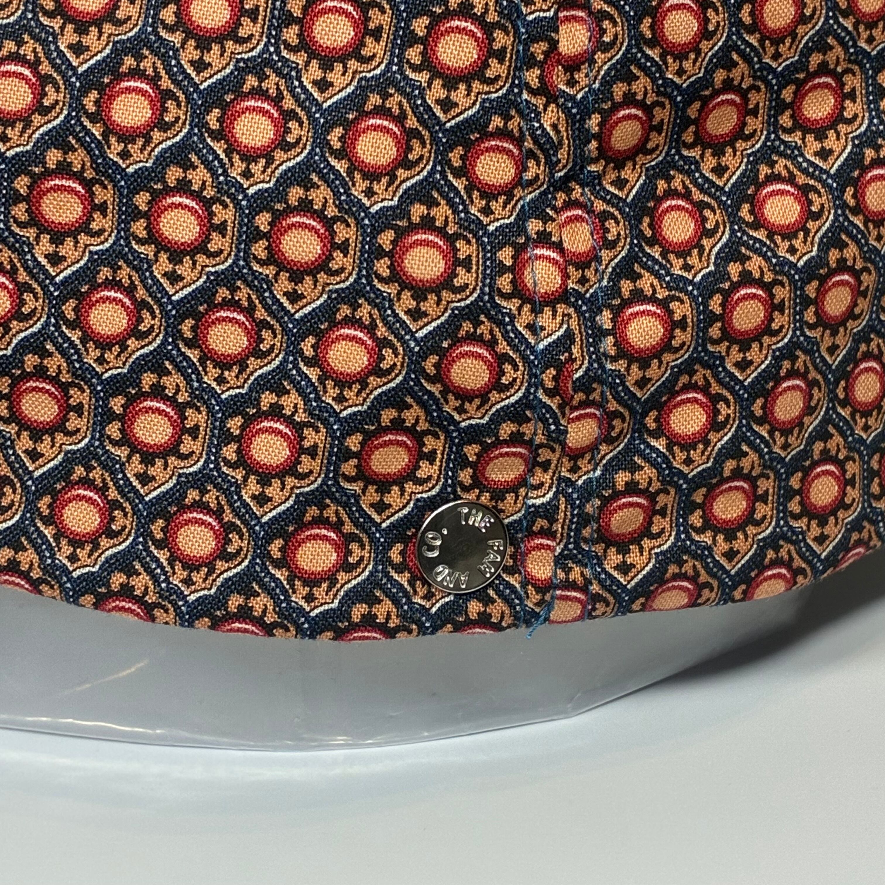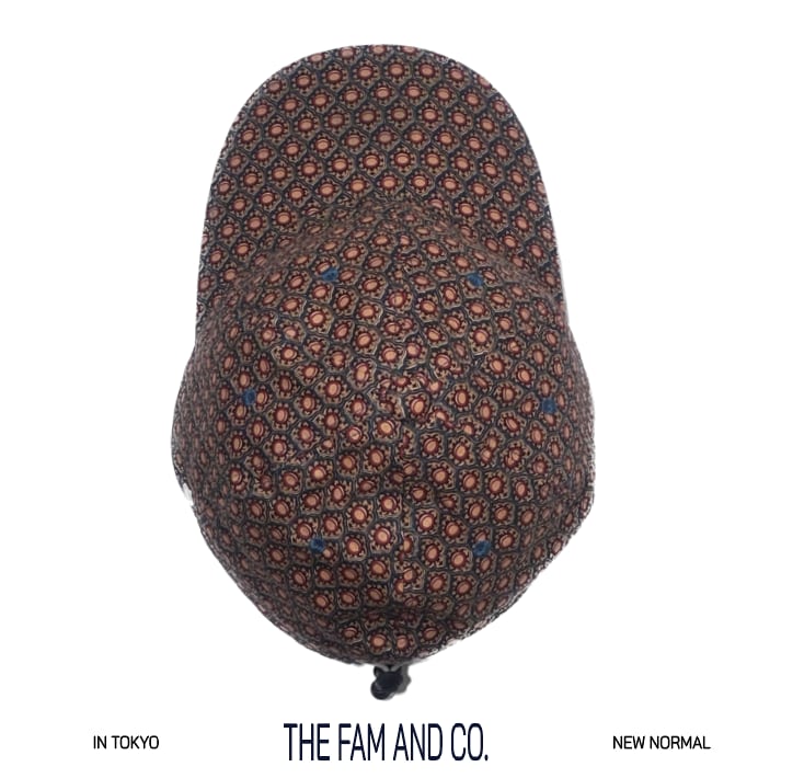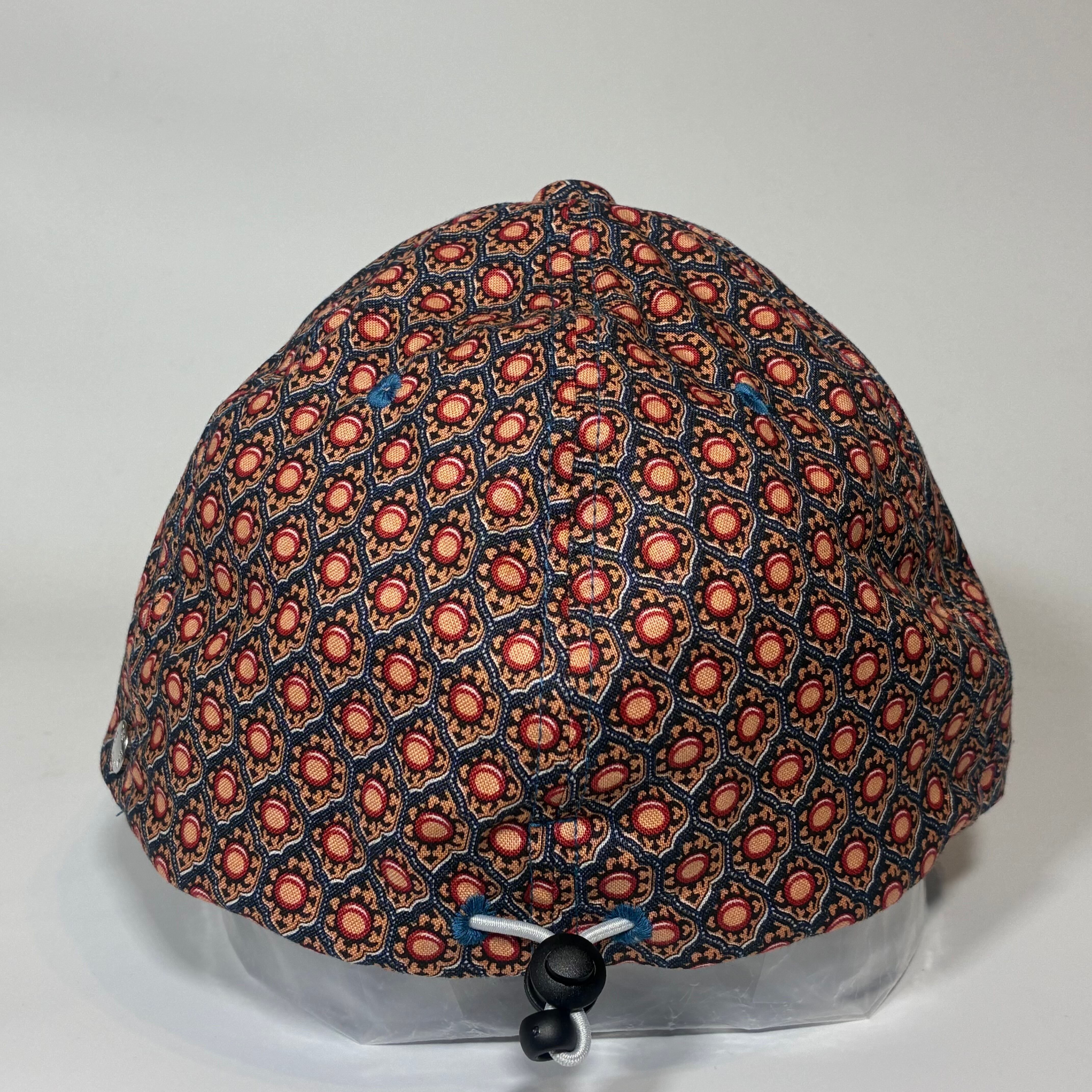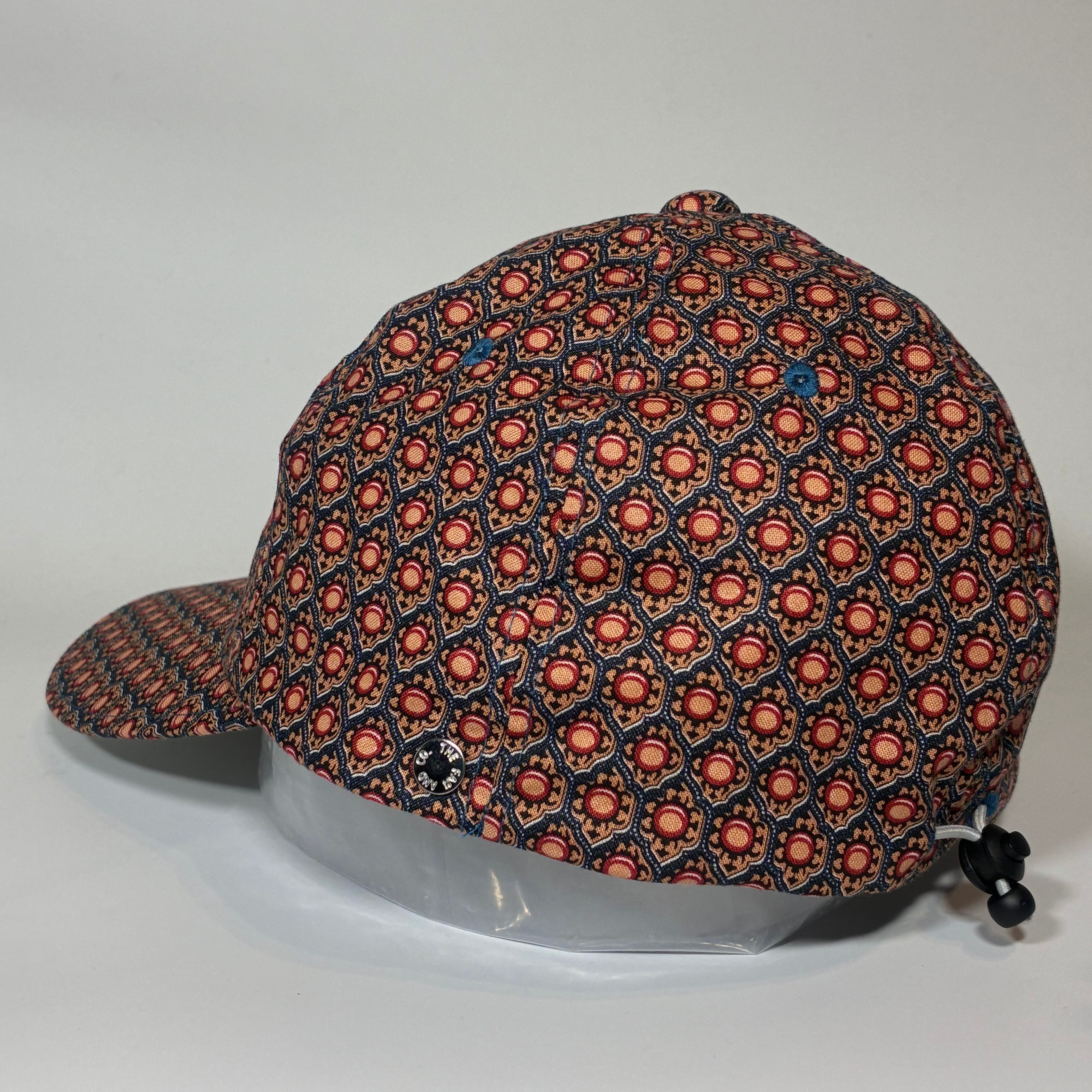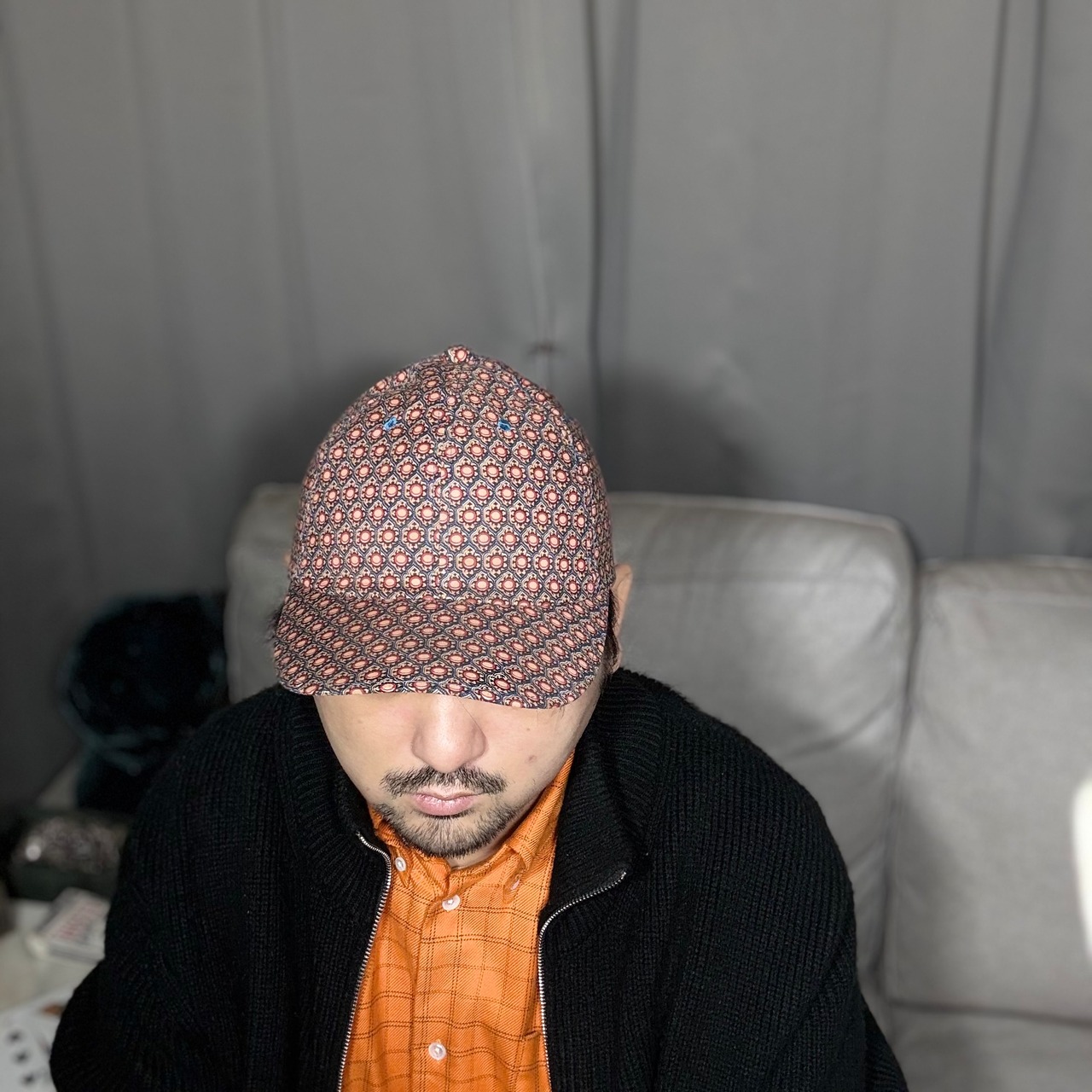 小振りな規則正しく並べられた模様がプリントされた帽子になります。