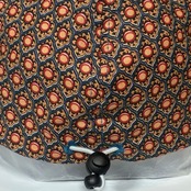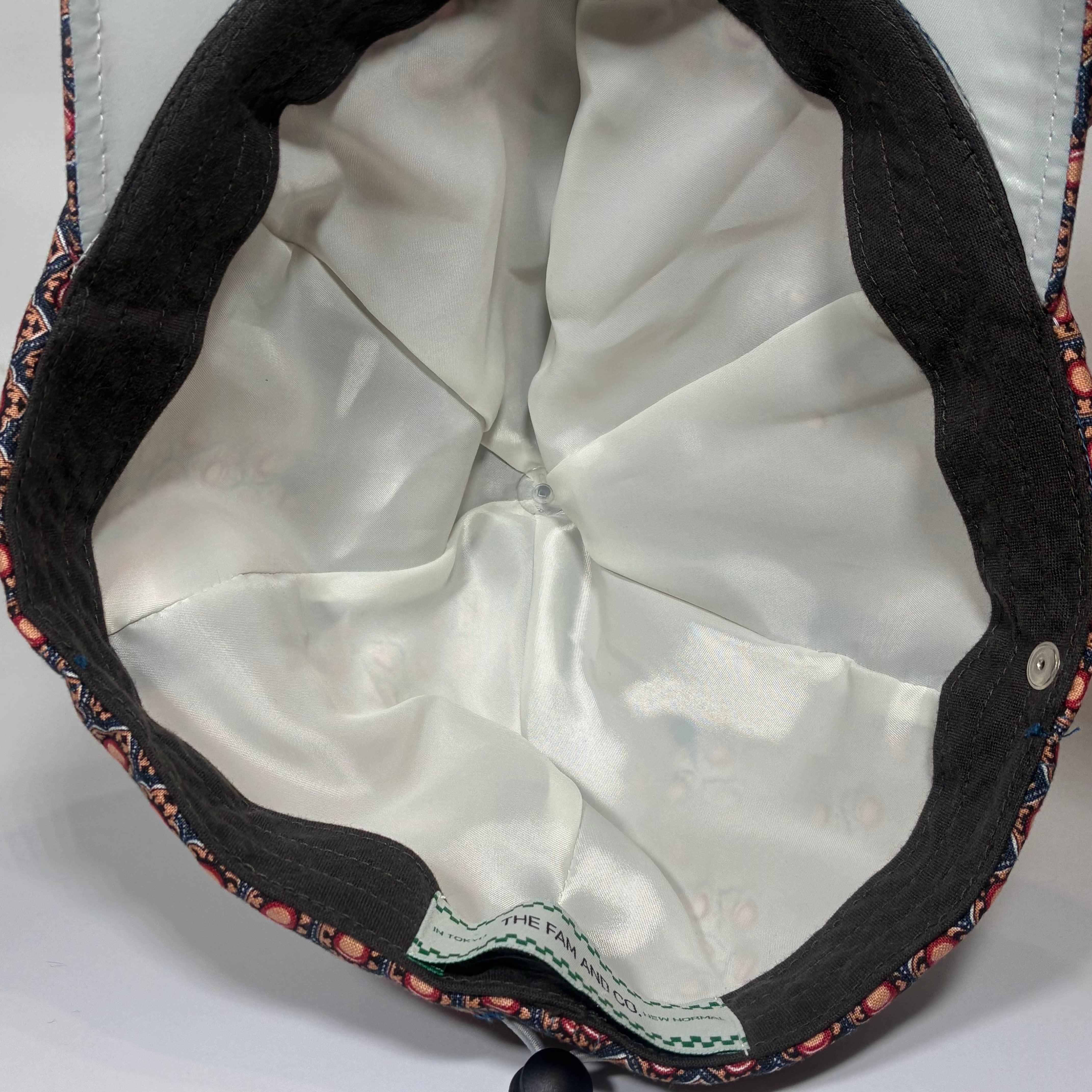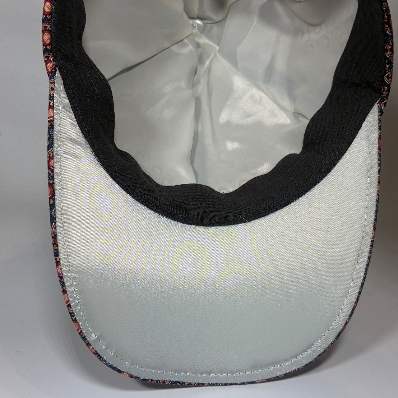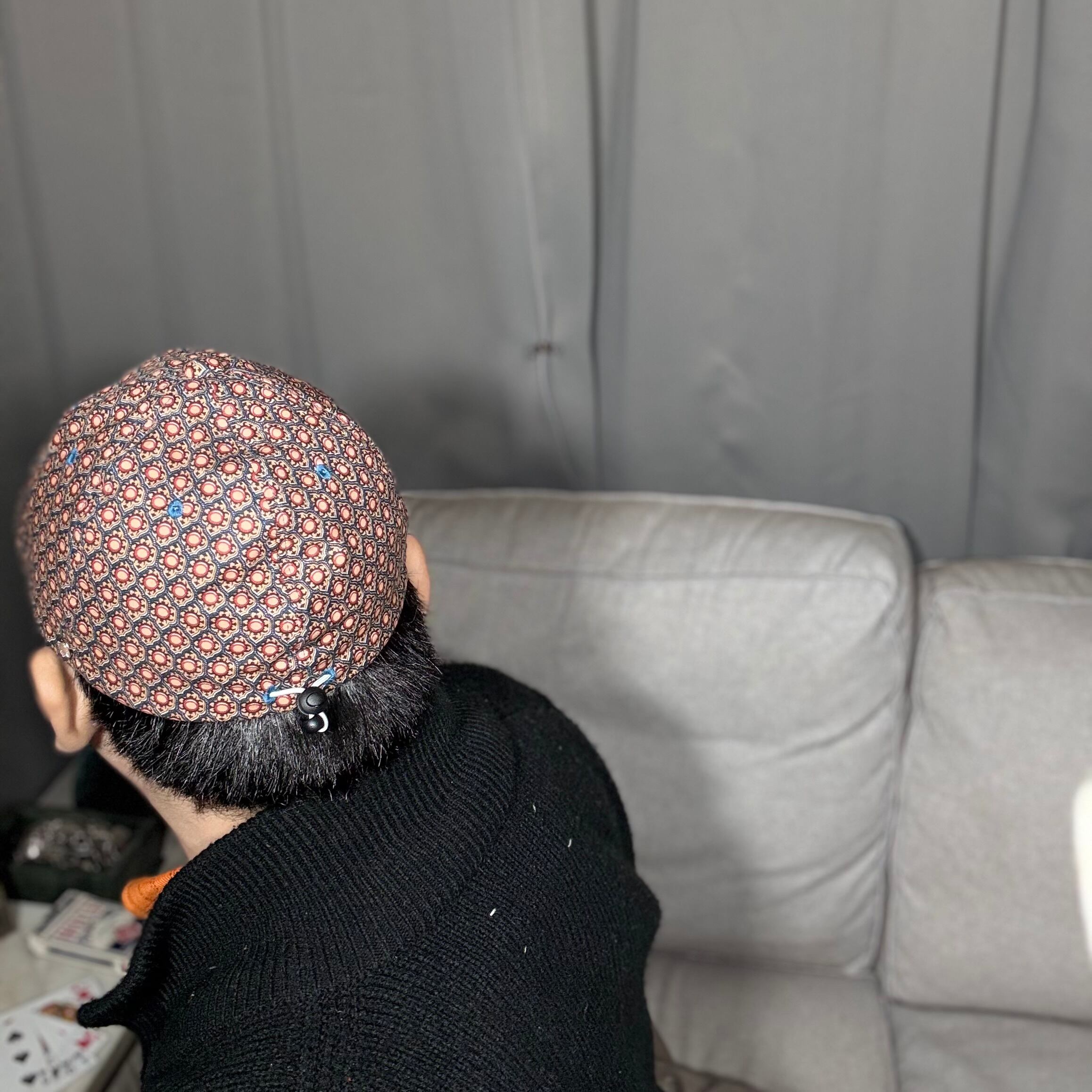 小振りな規則正しく並べられた模様がプリントされた帽子になります。