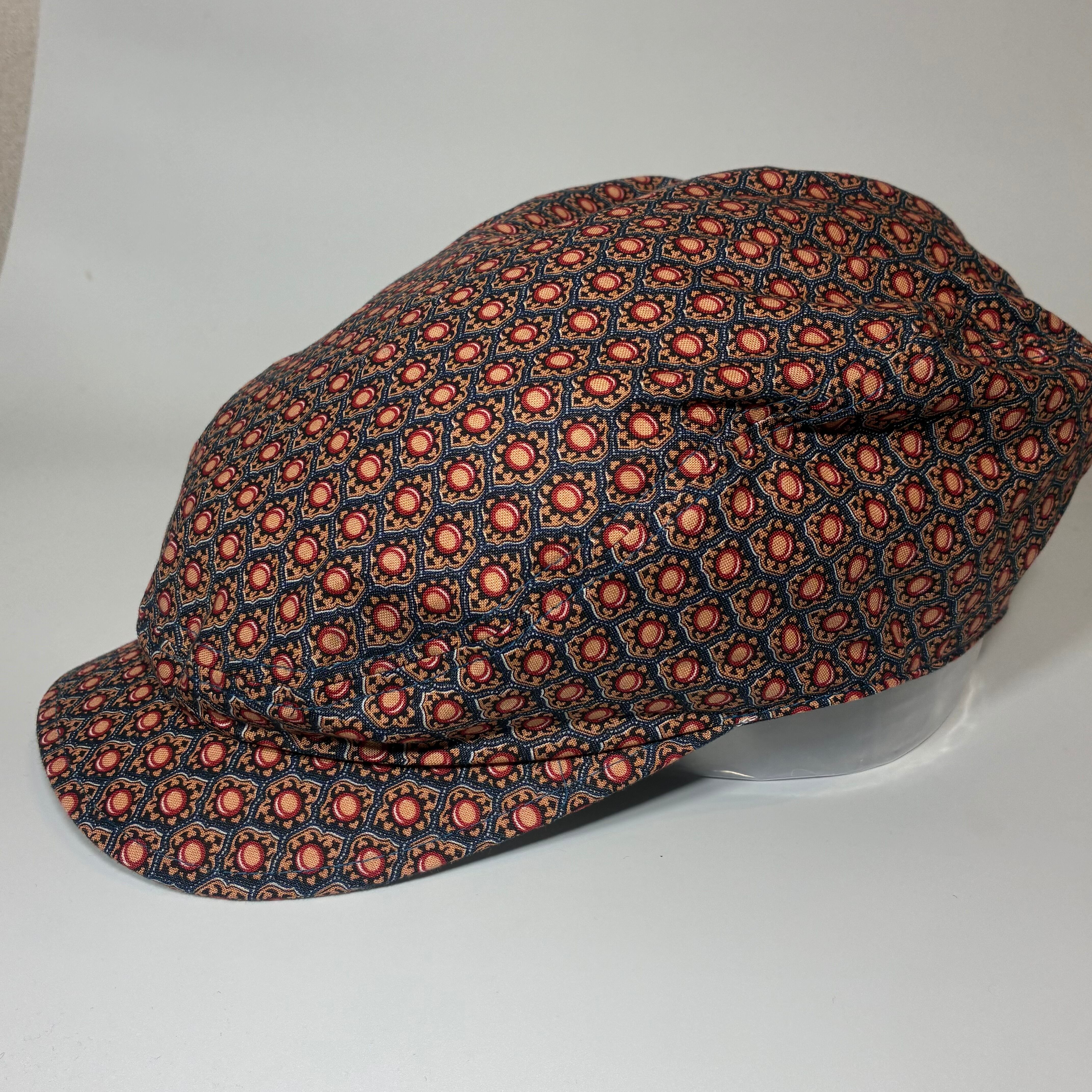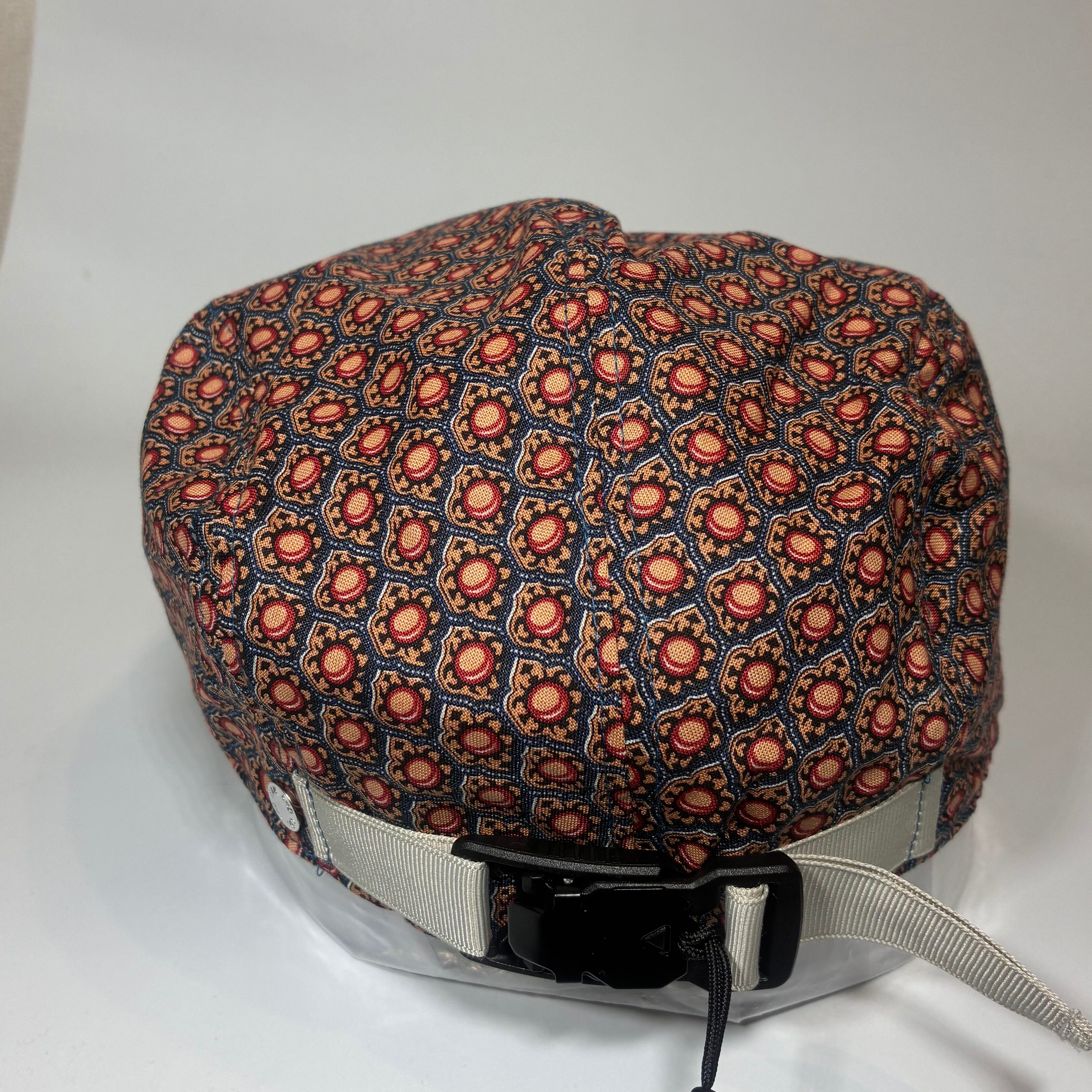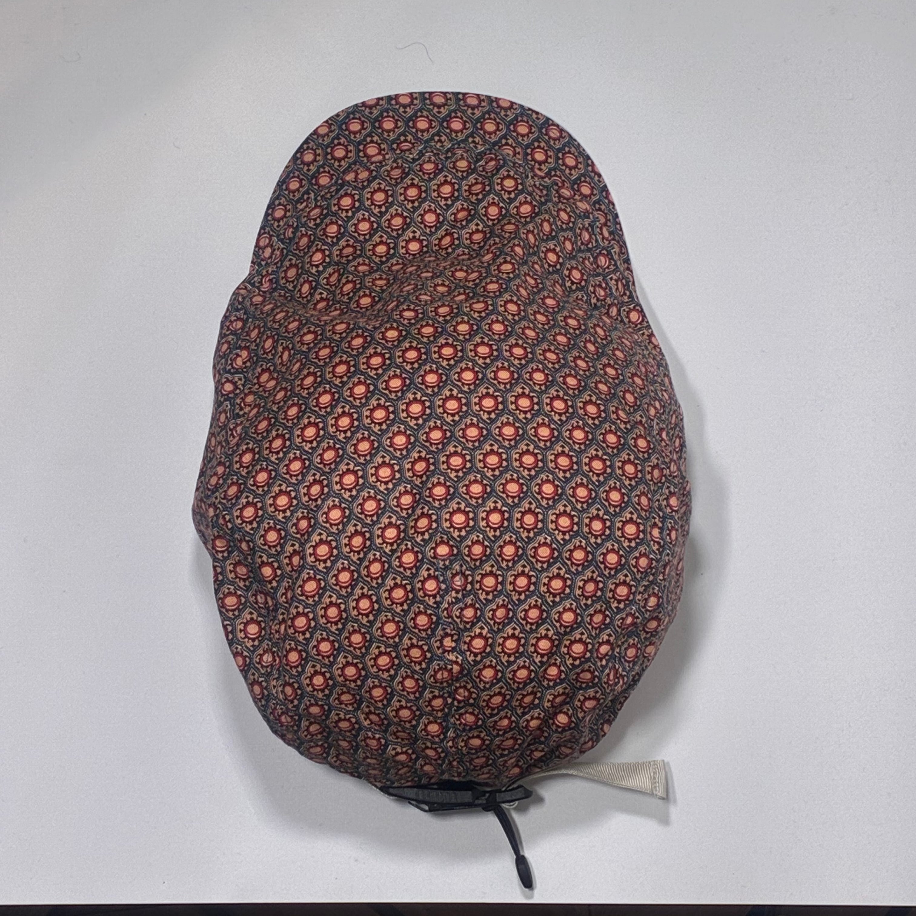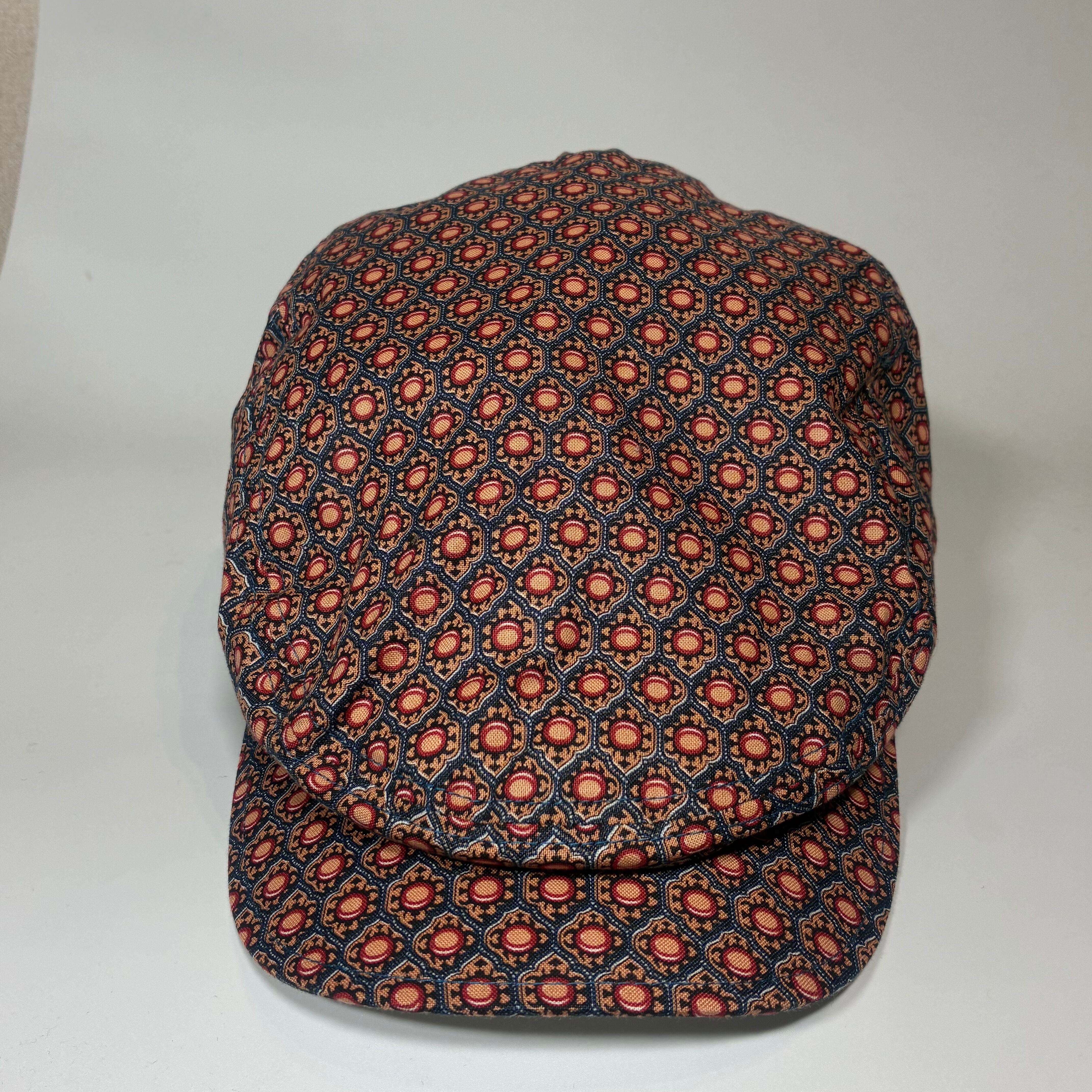 小振りな規則正しく並べられた模様がプリントされたハンチングキャップになります。