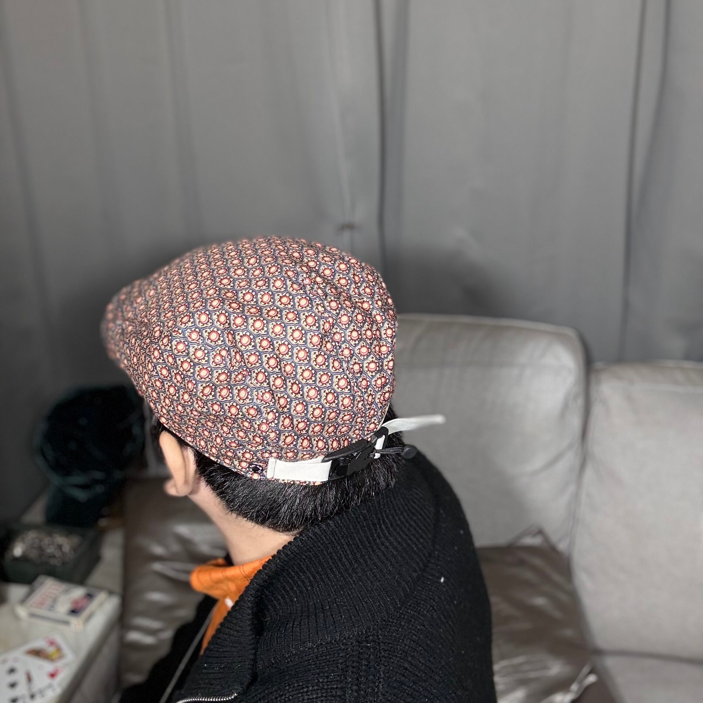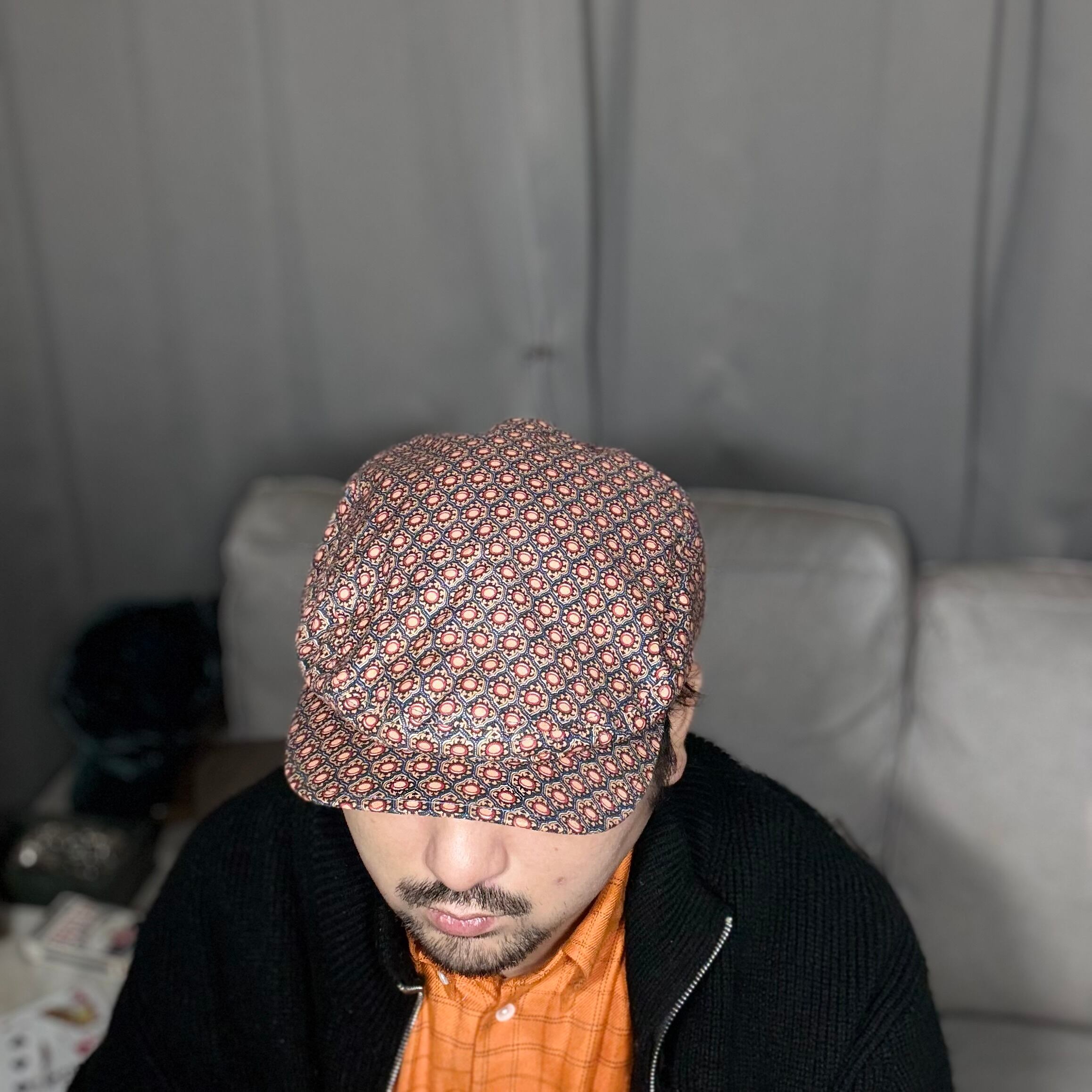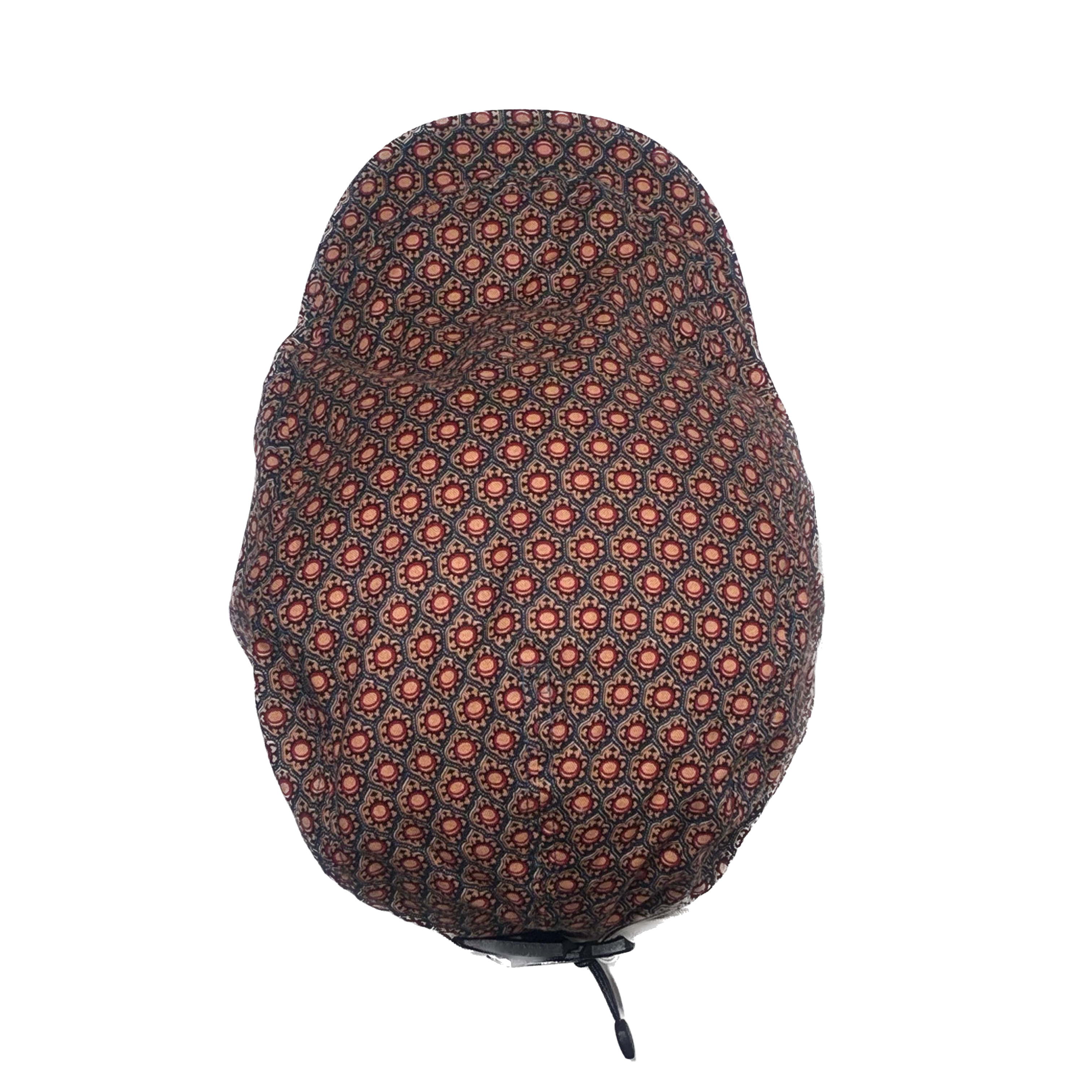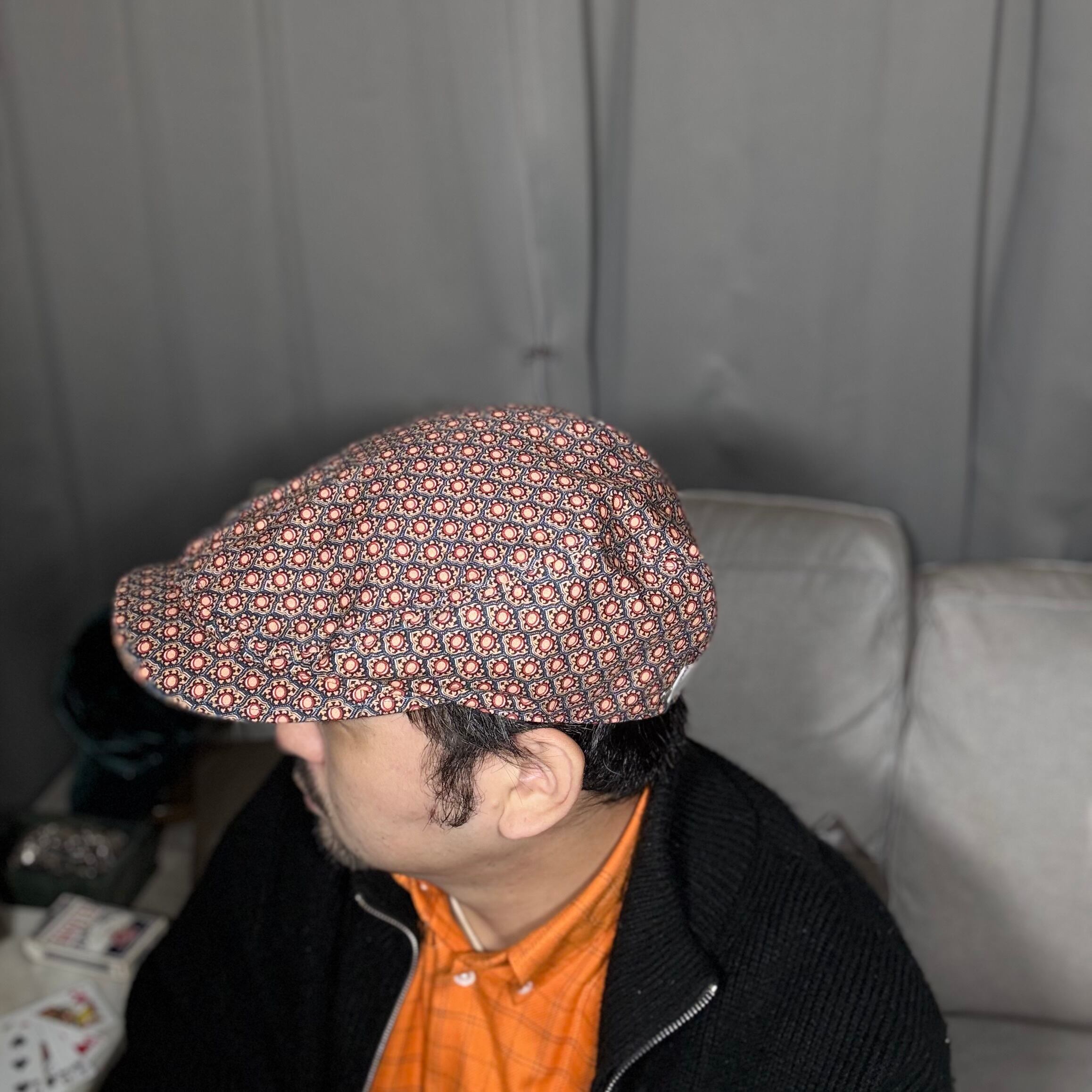 小振りな規則正しく並べられた模様がプリントされたハンチングキャップになります。