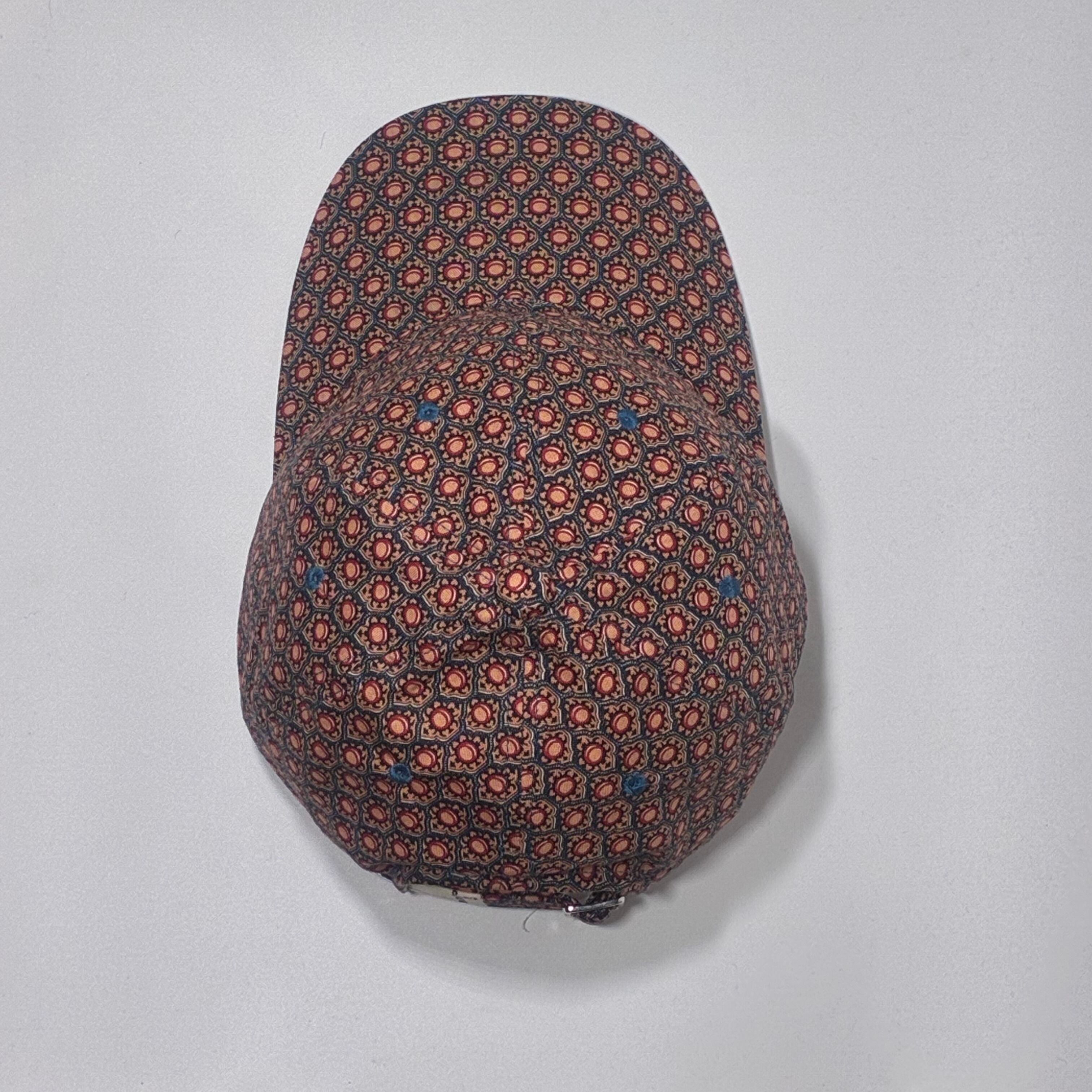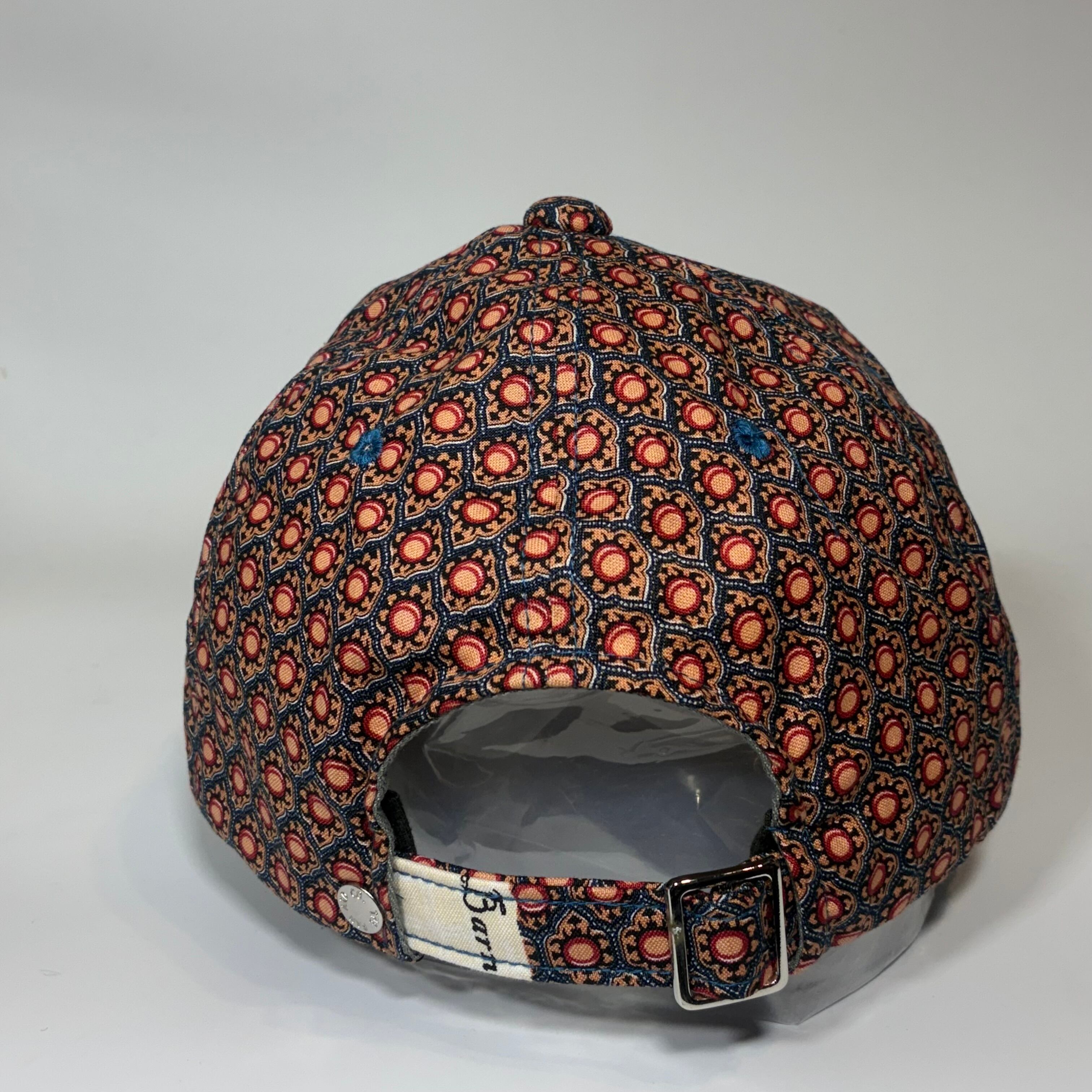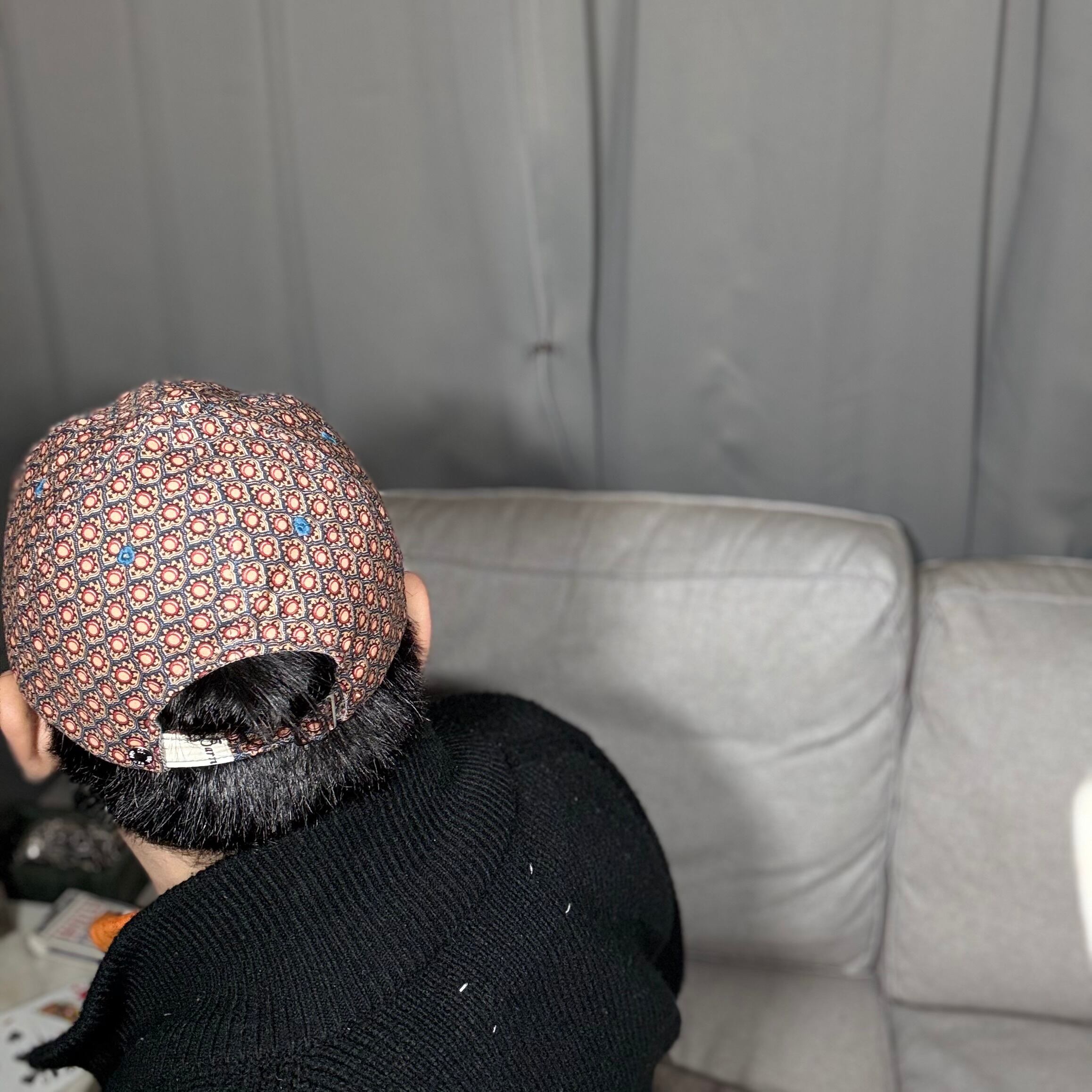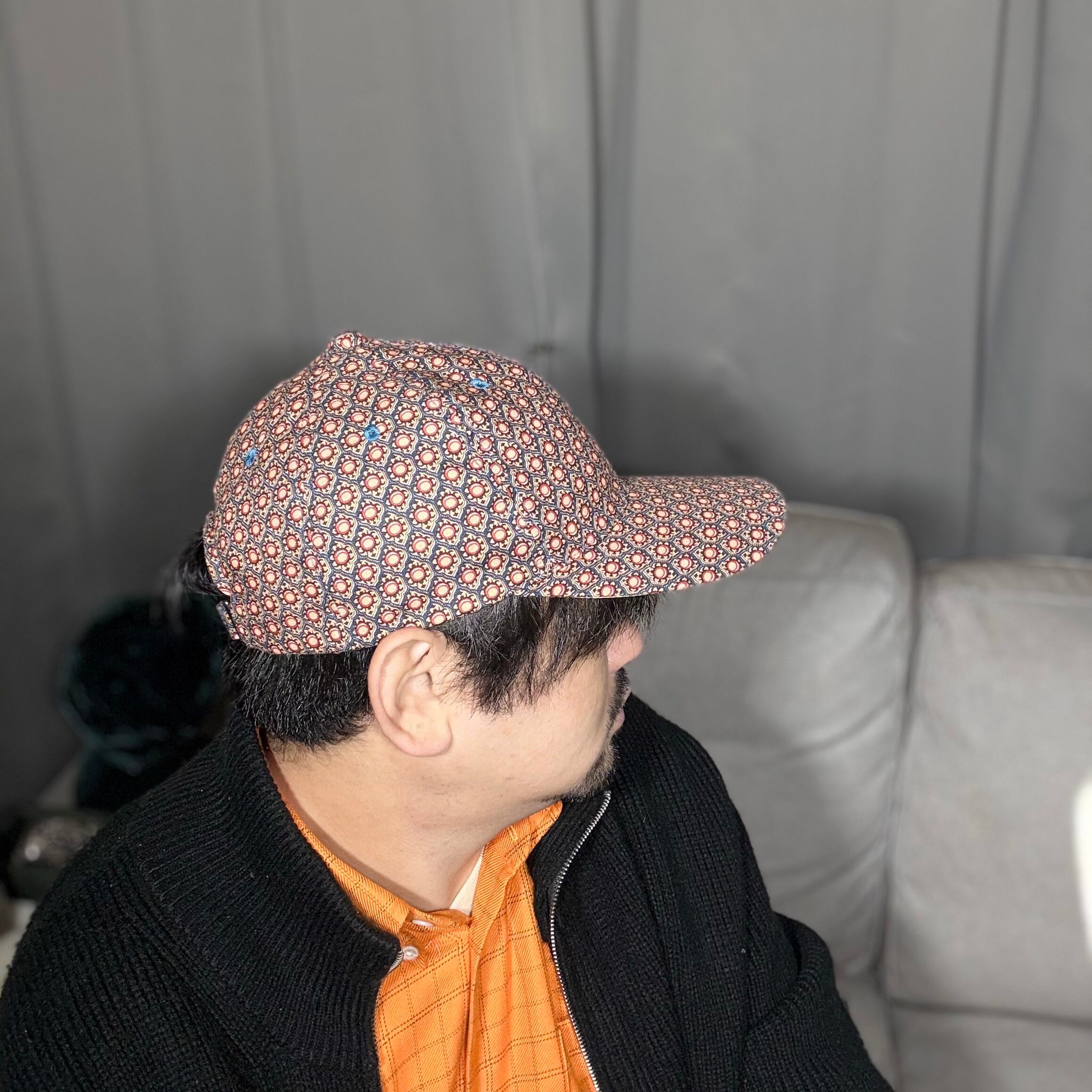小振りな規則正しく並べられた模様がプリントされた帽子になります。