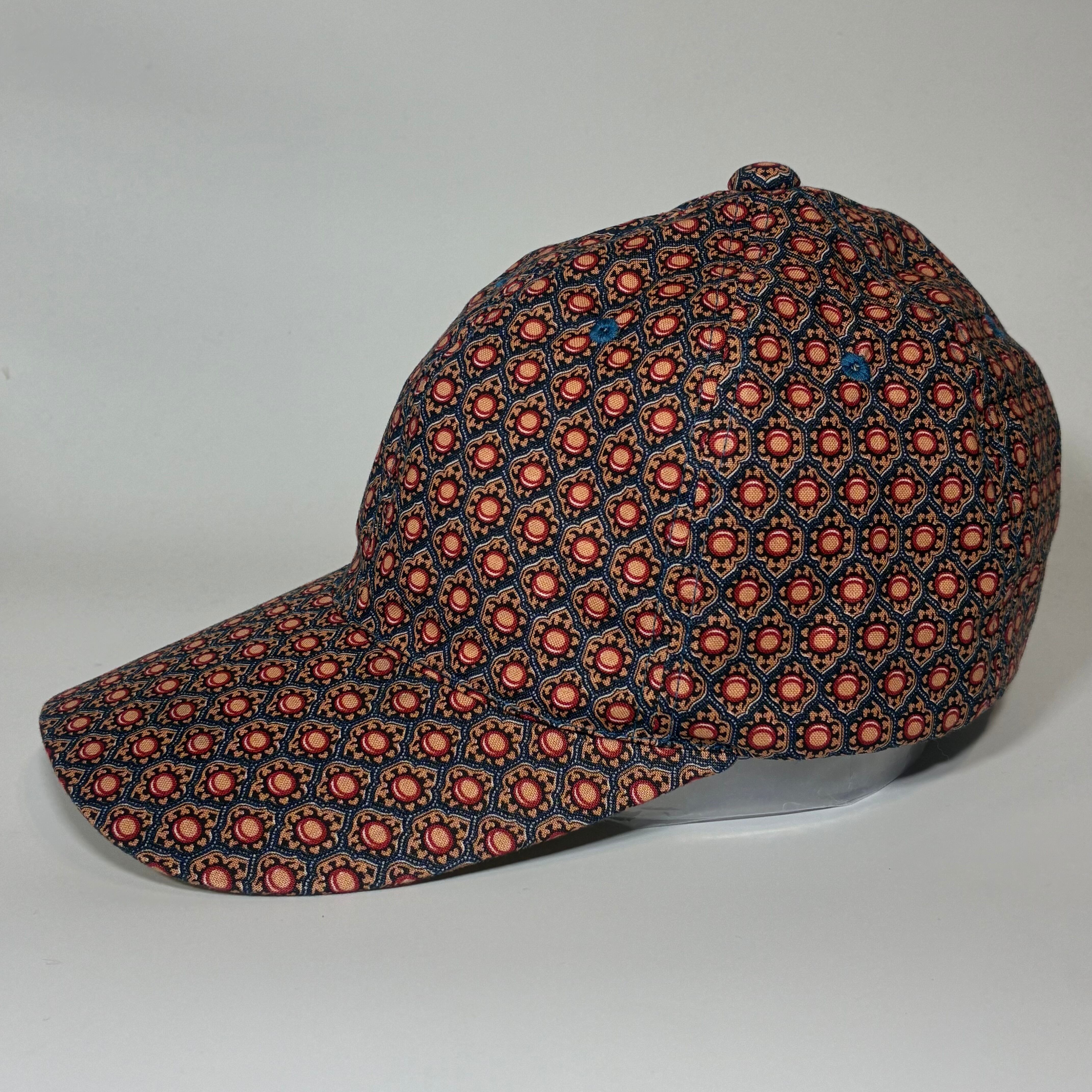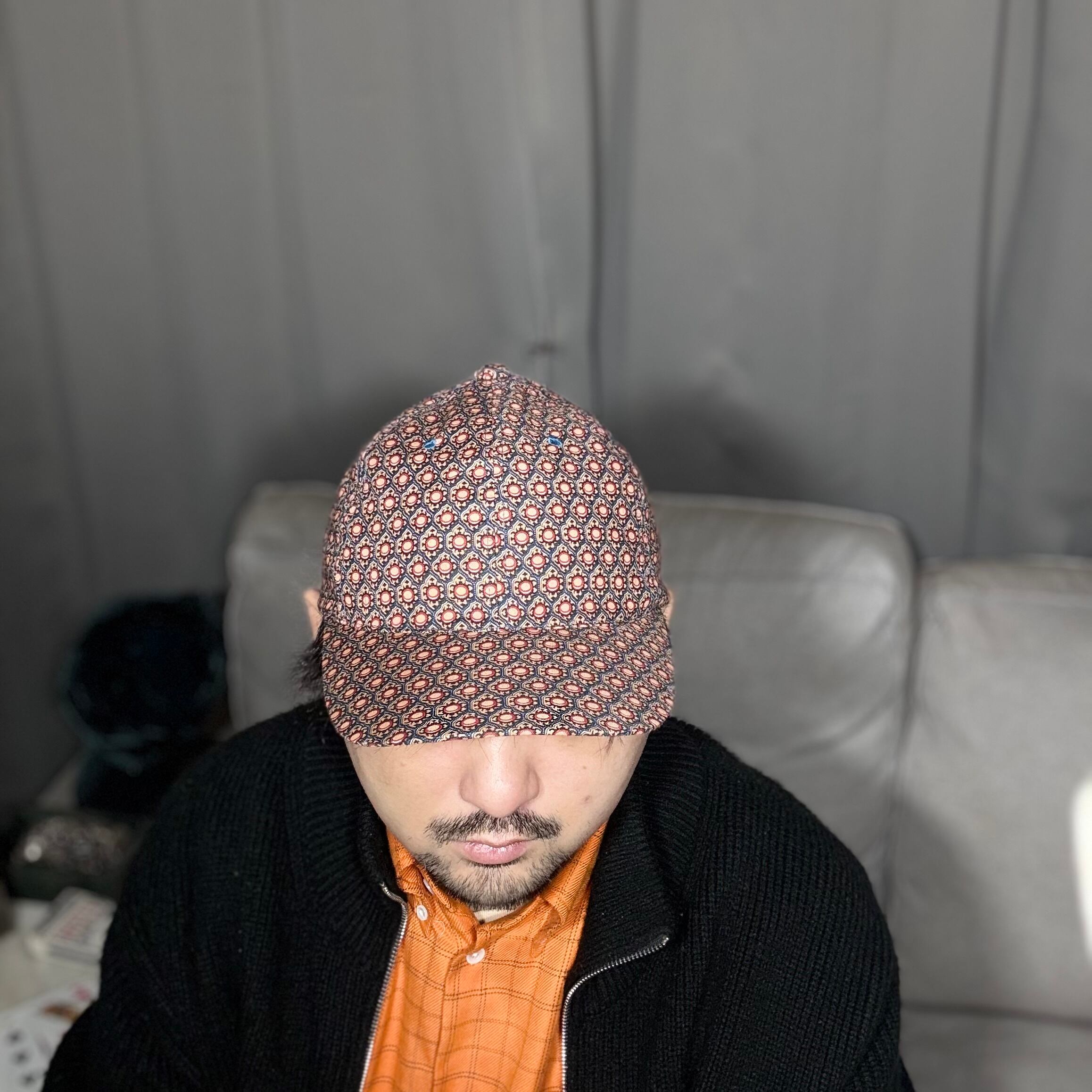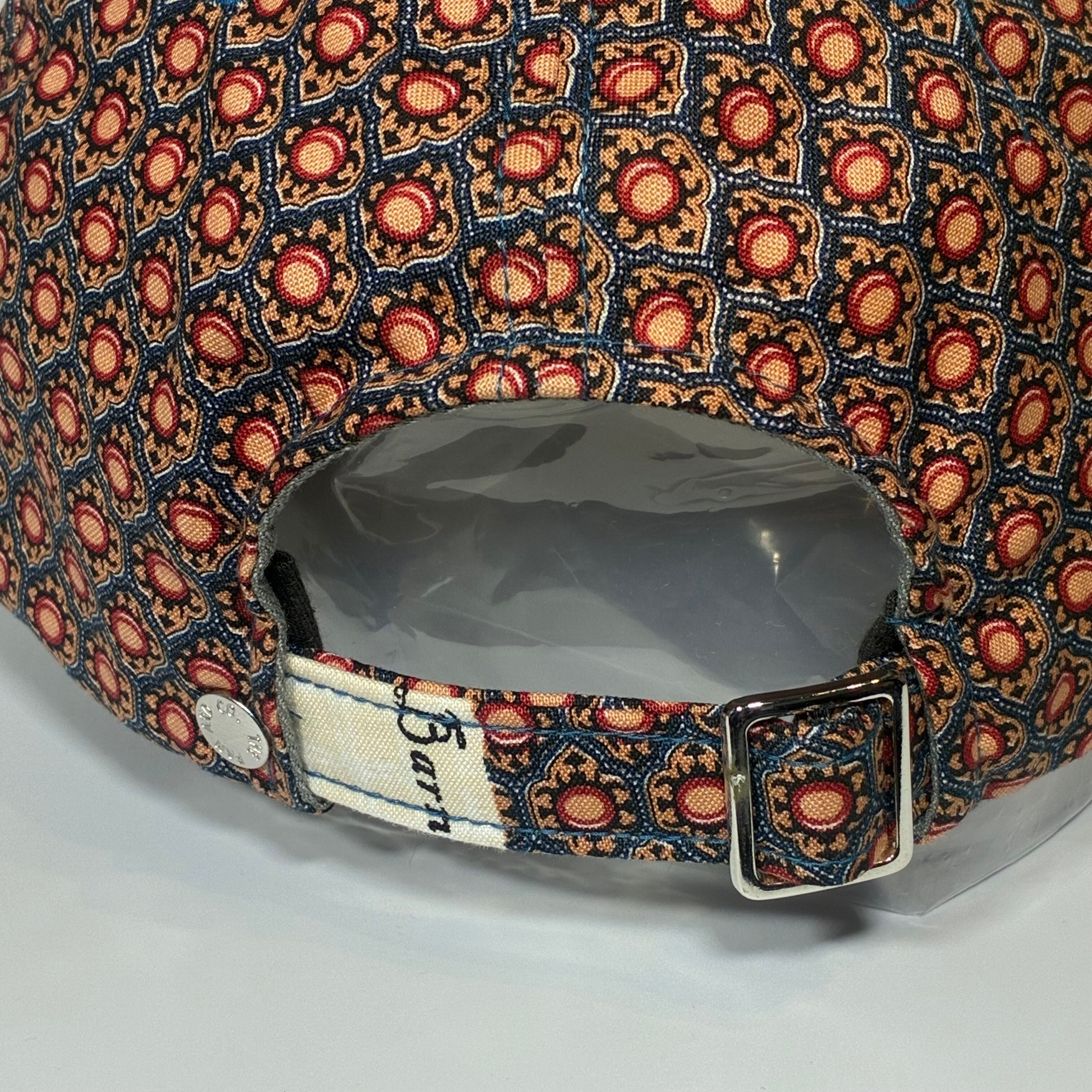 小振りな規則正しく並べられた模様がプリントされた帽子になります。