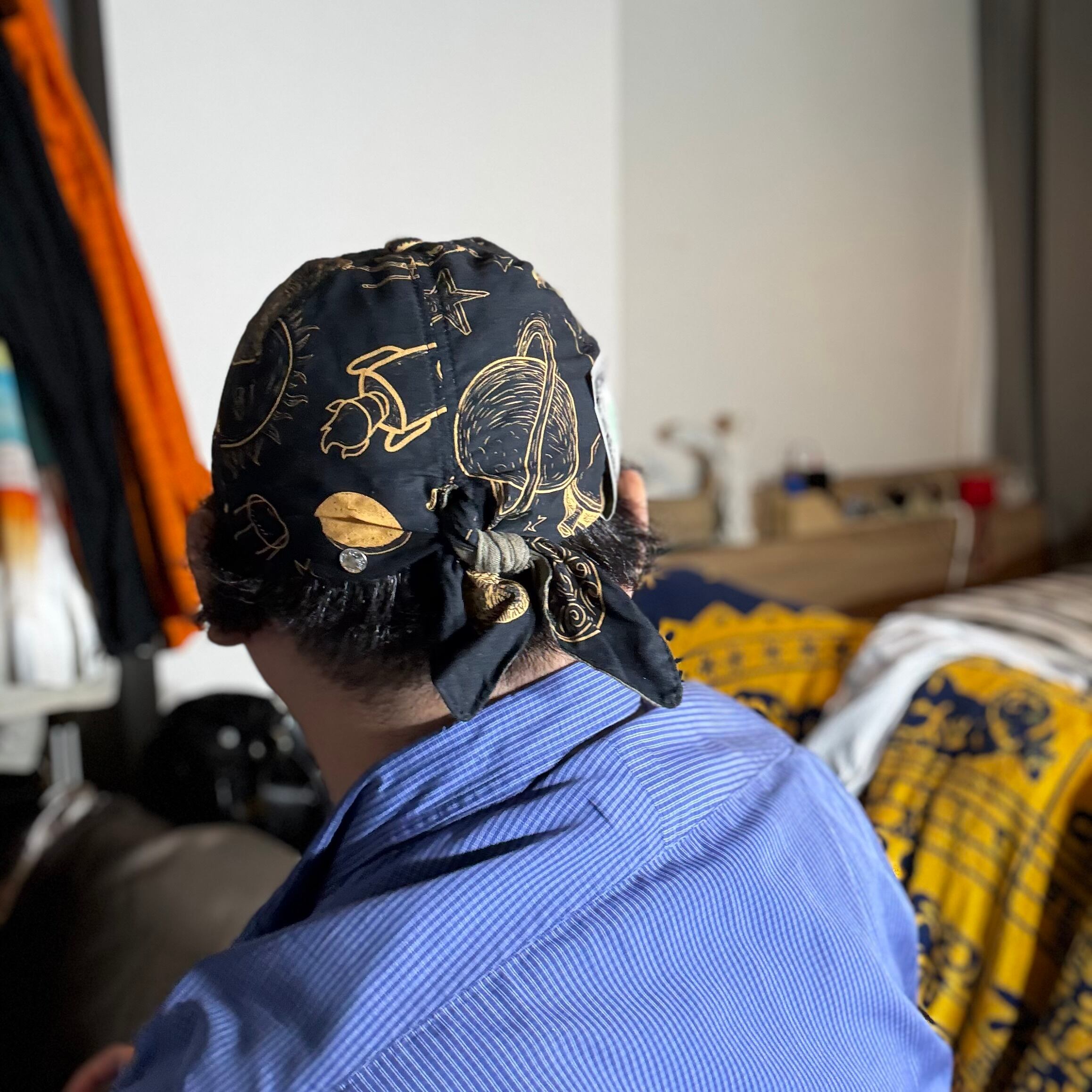 バンダナのように縛ることで被った時の結び目がポイントになります。
