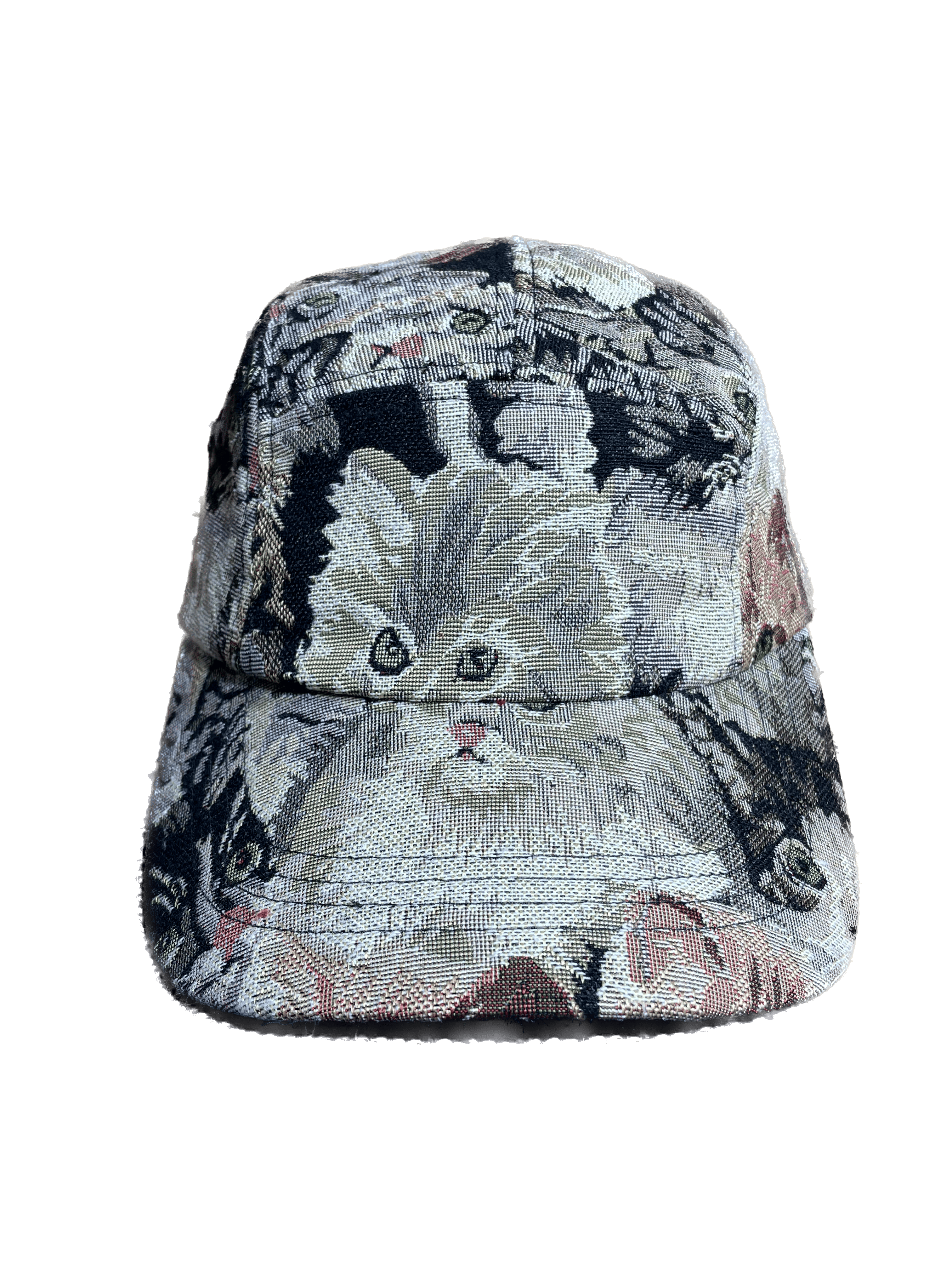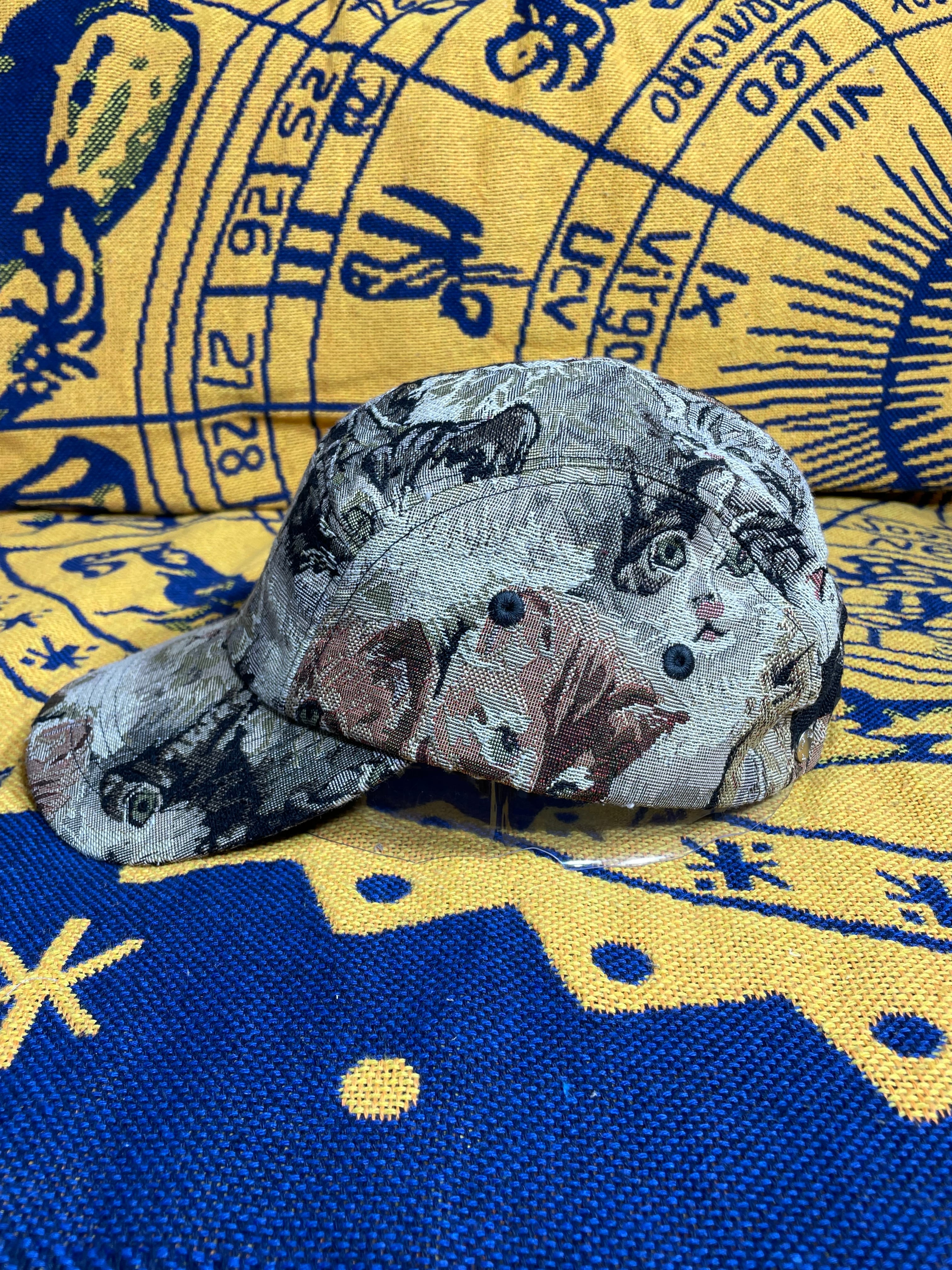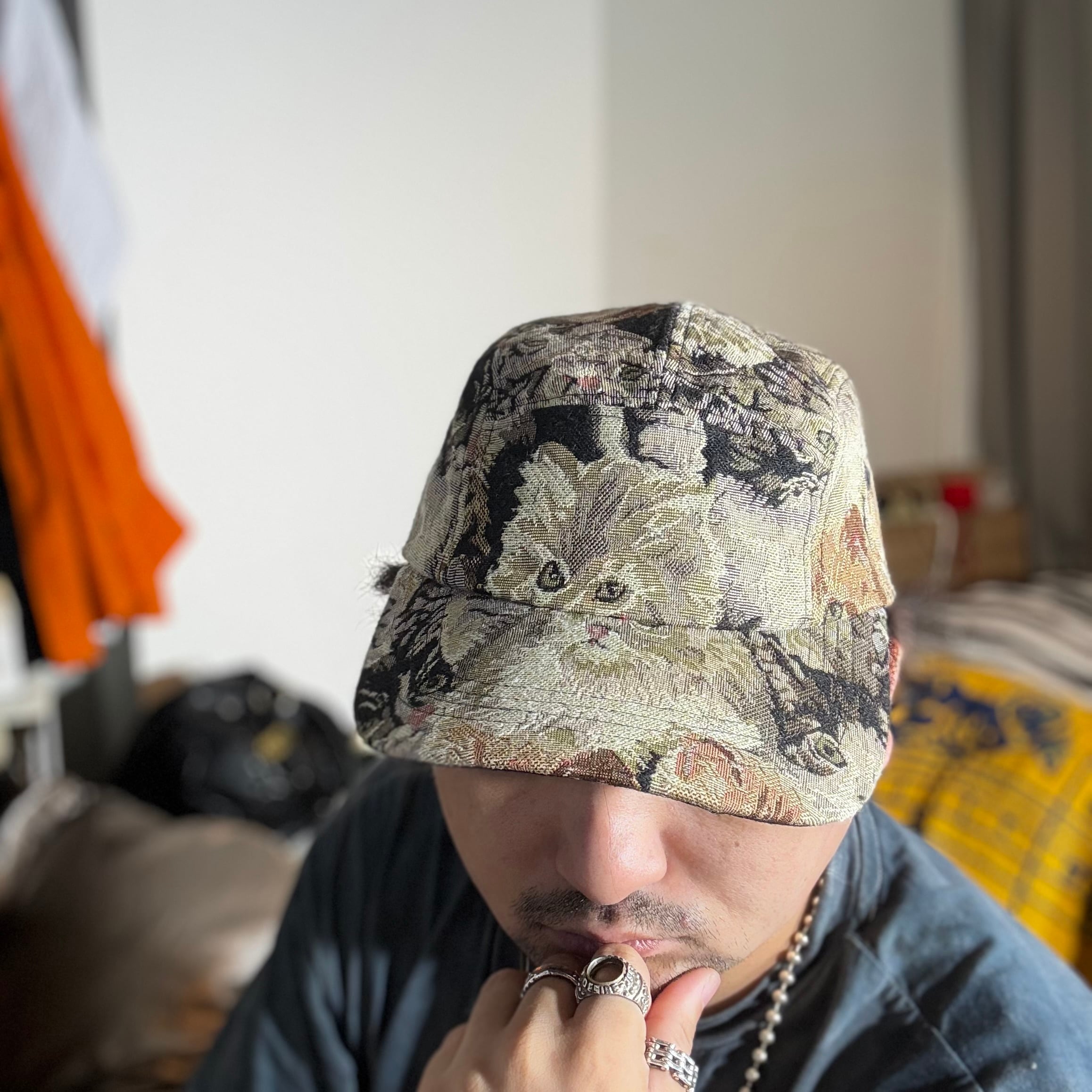 様々な猫が集まっている柄生地で仕立て上げられたジェットキャップになります。