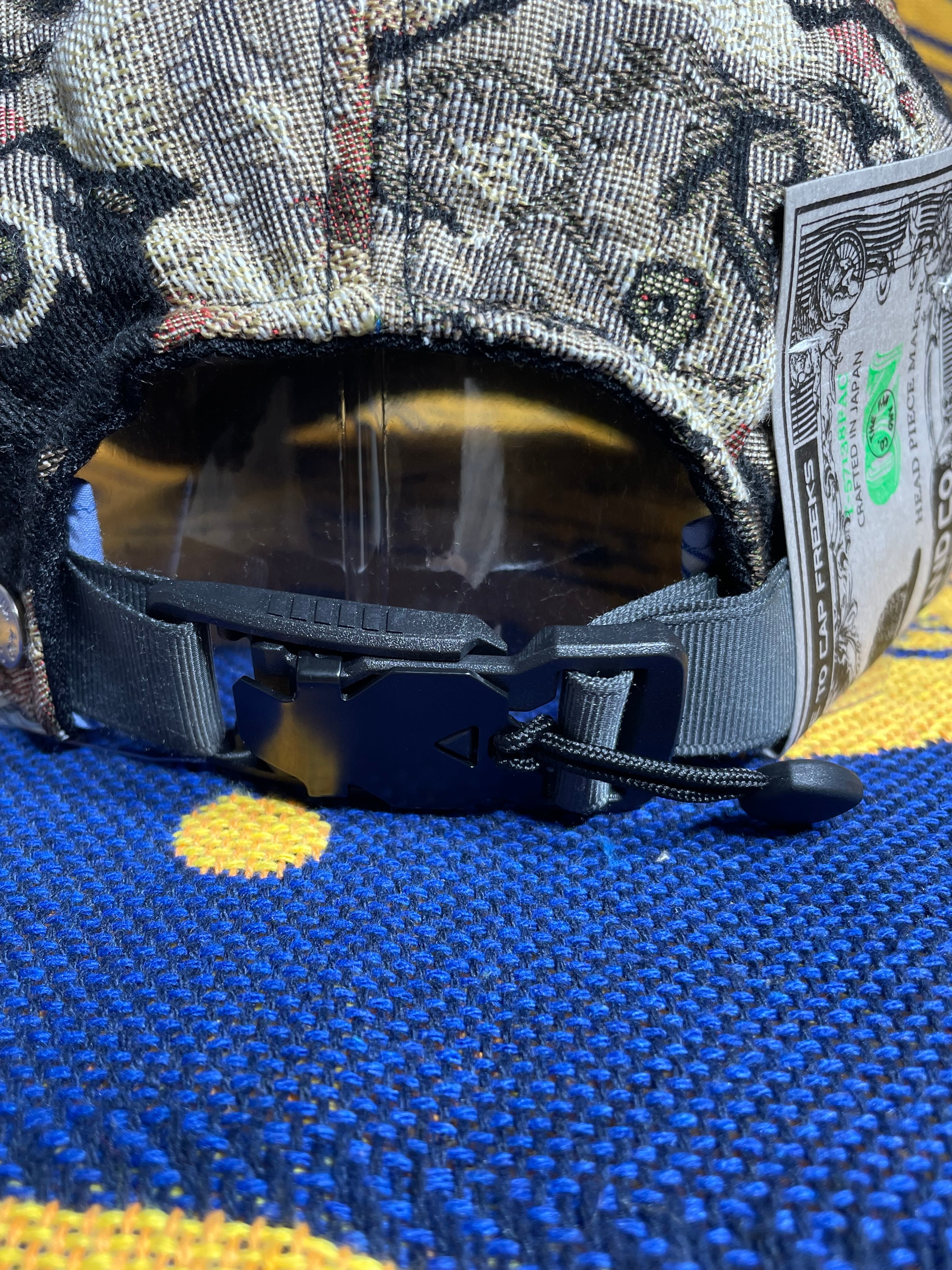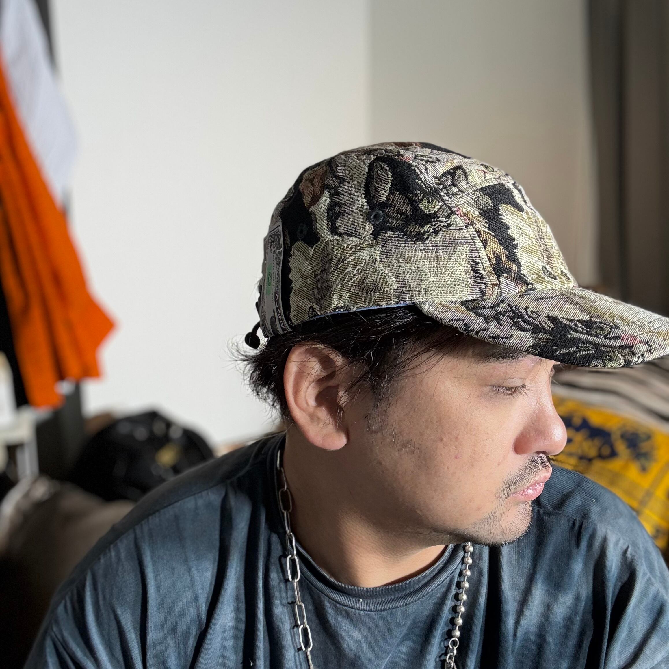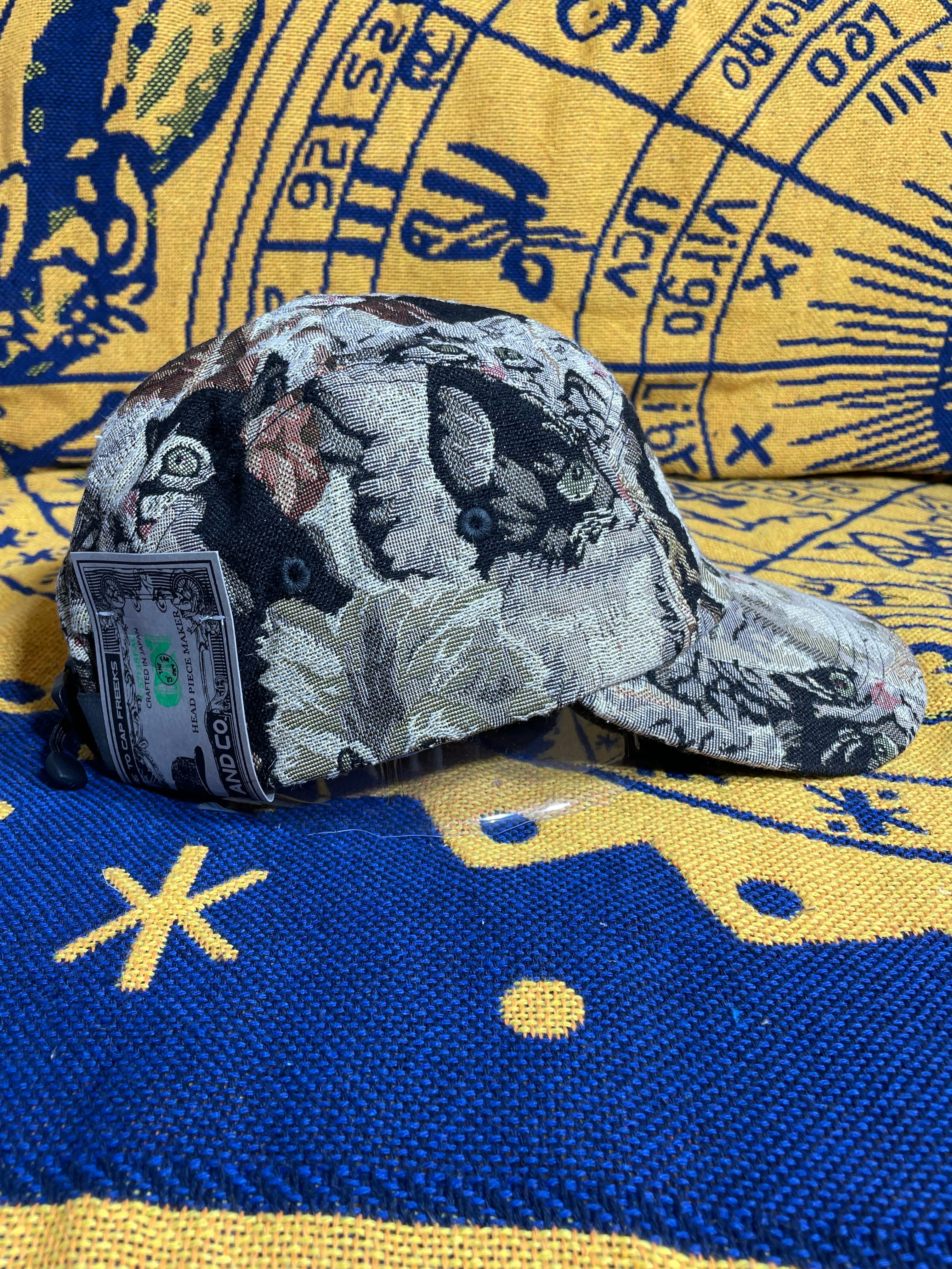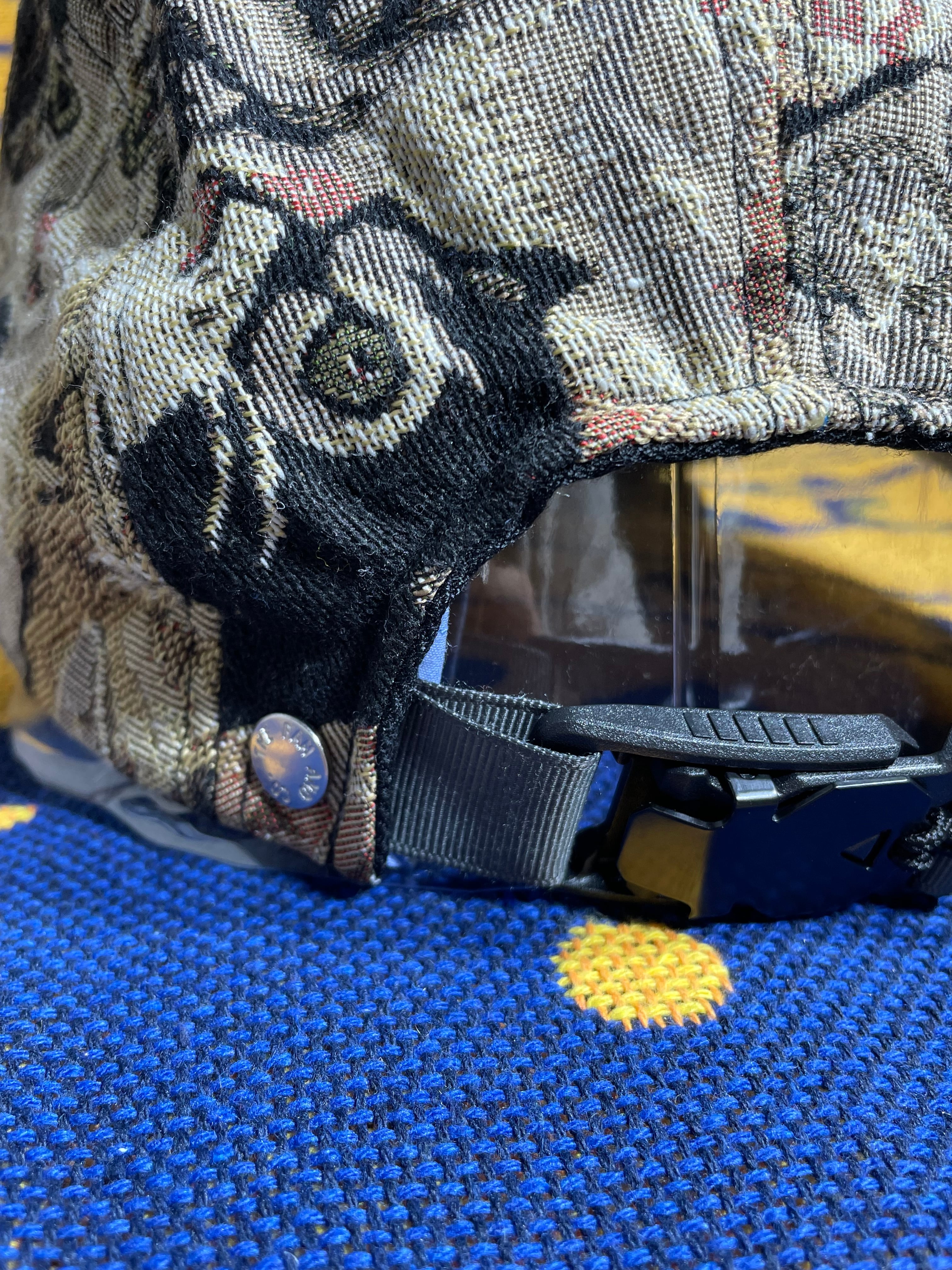 様々な猫が集まっている柄生地で仕立て上げられたジェットキャップになります。