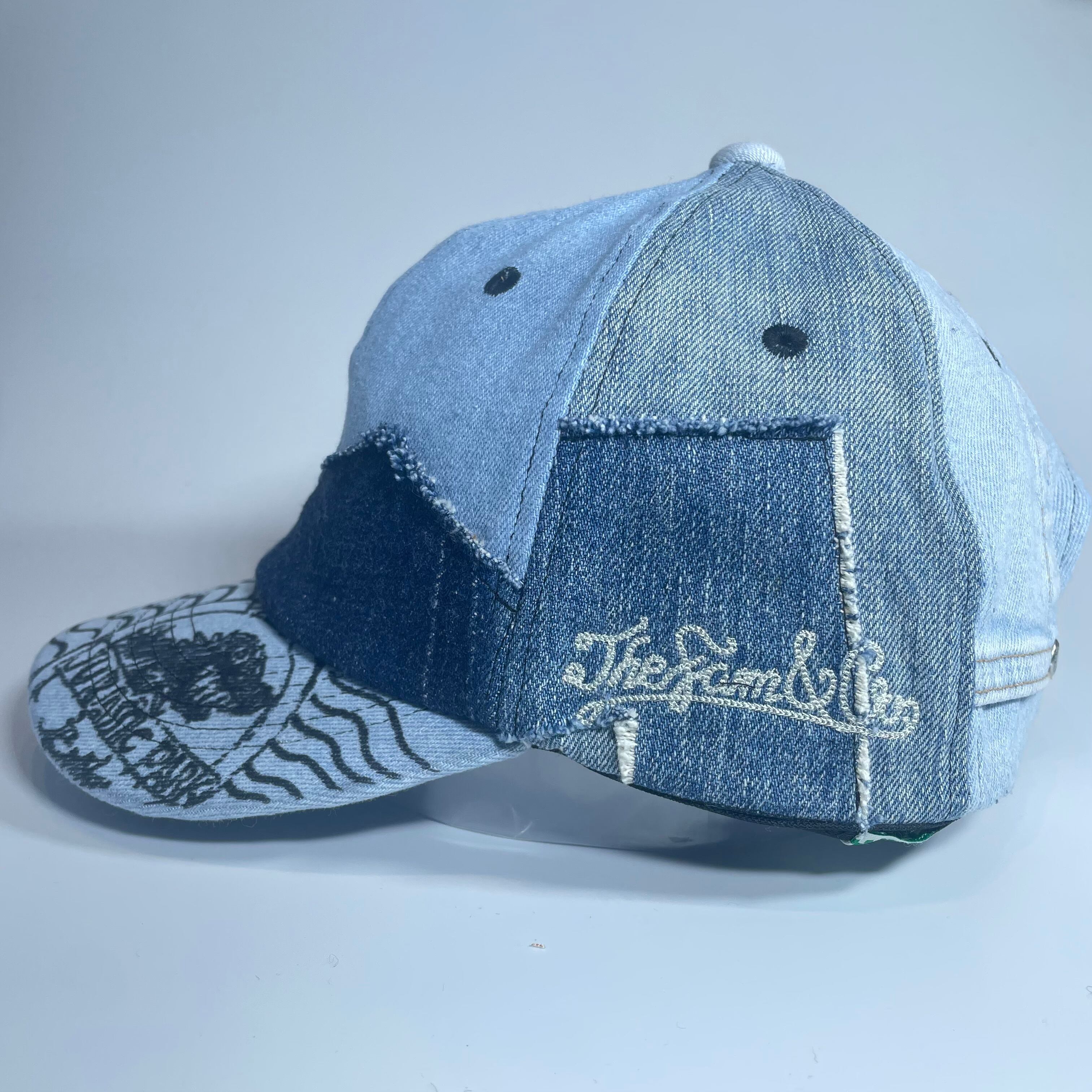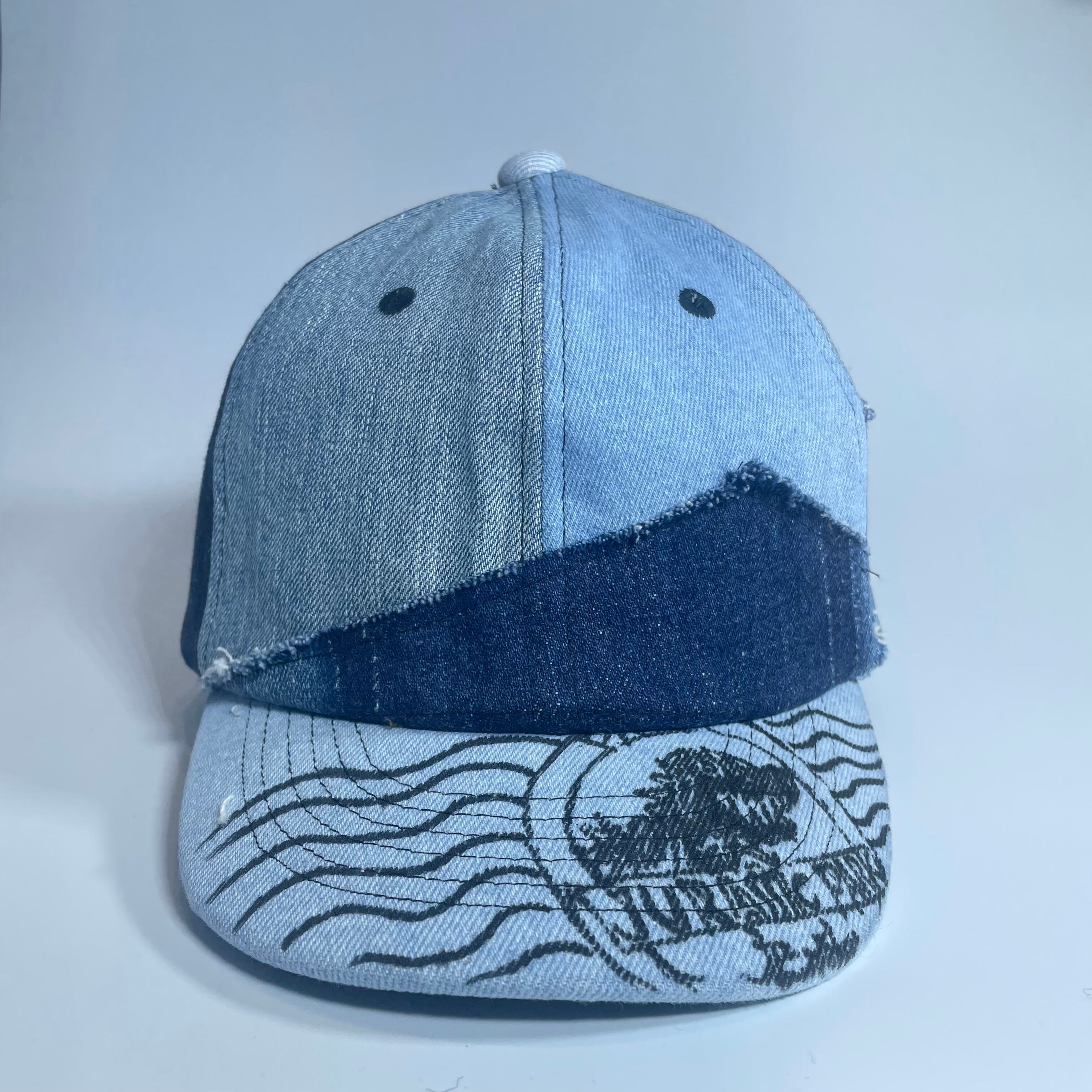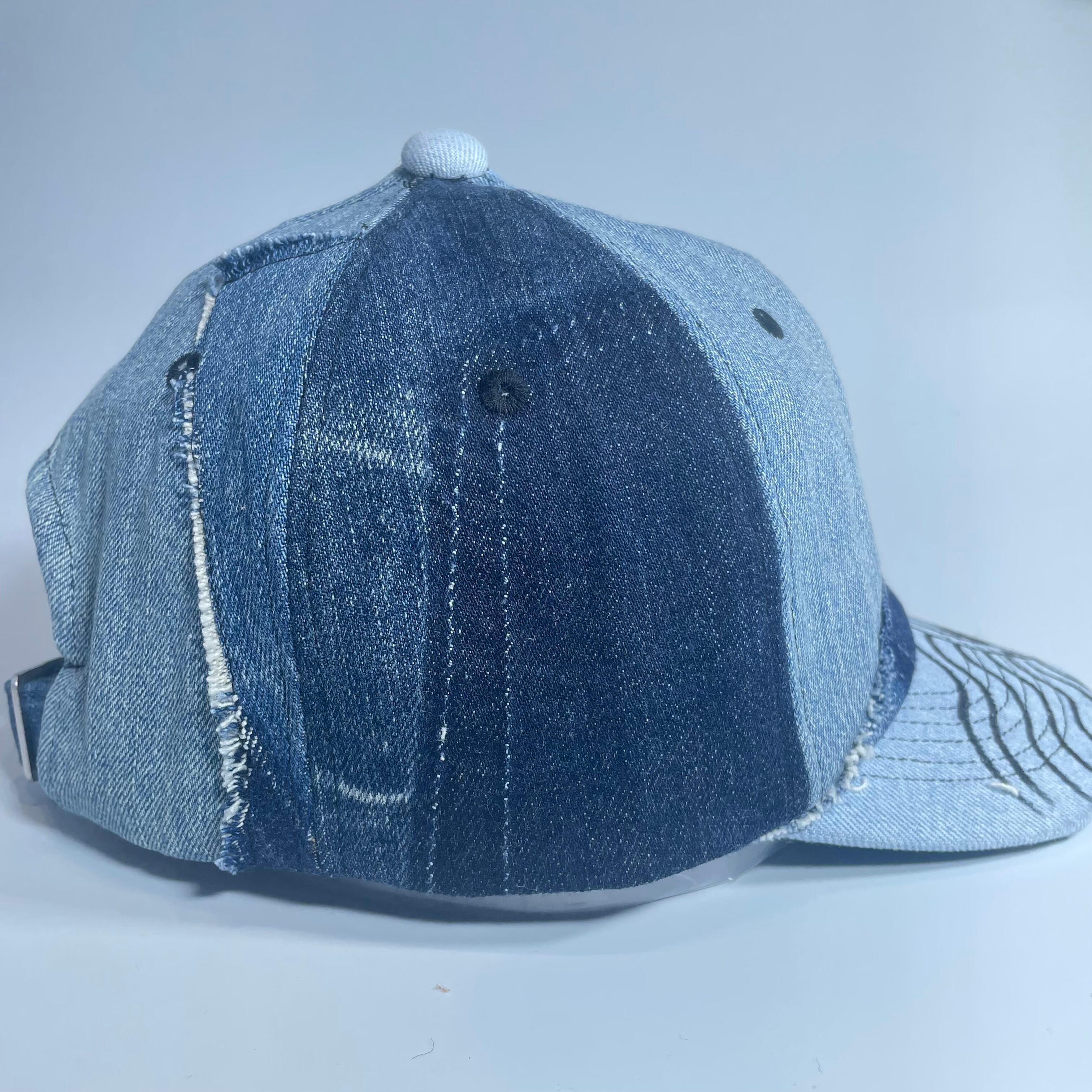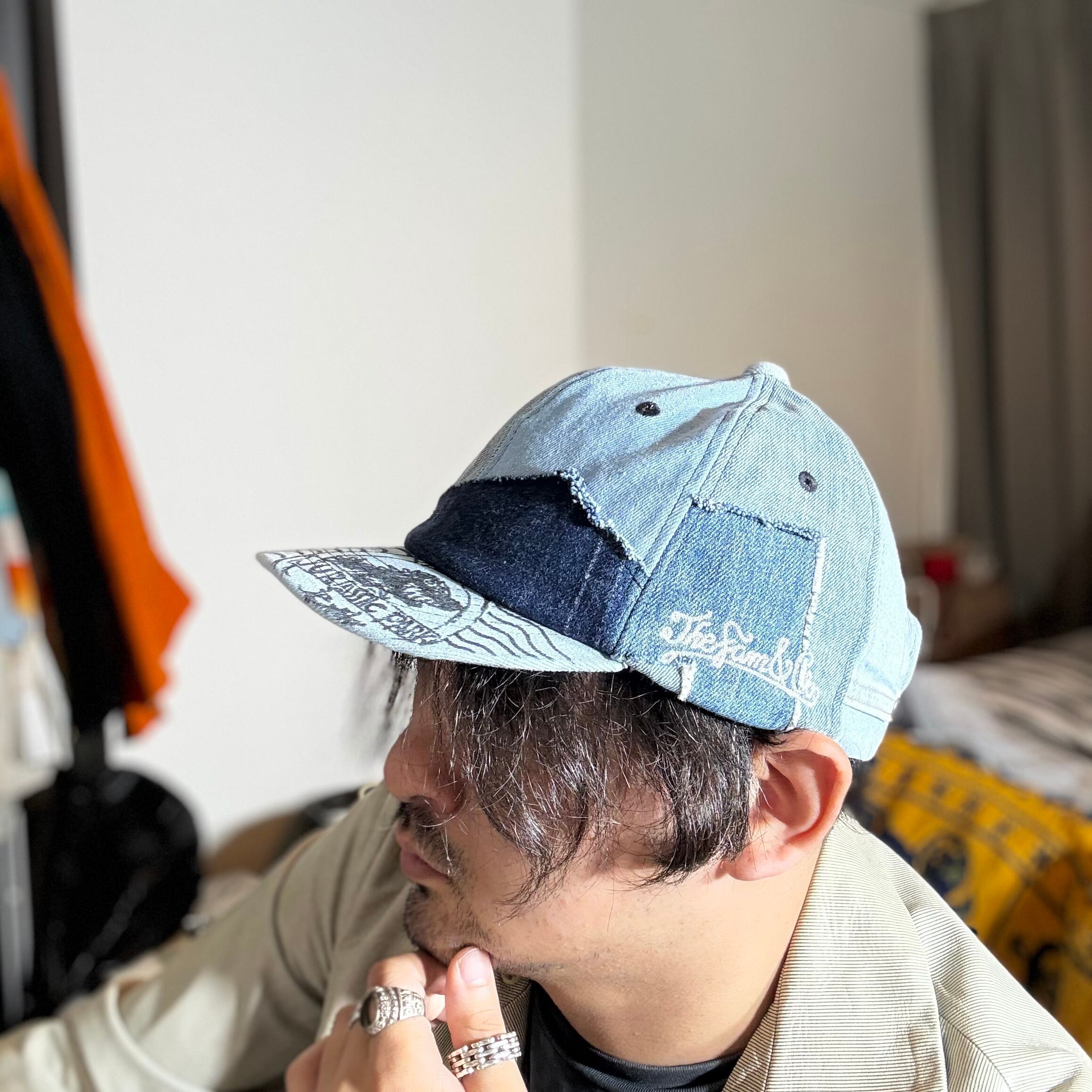 古着のデニムより解体されたパーツをランダムに組み合わせたベースボールキャップです。