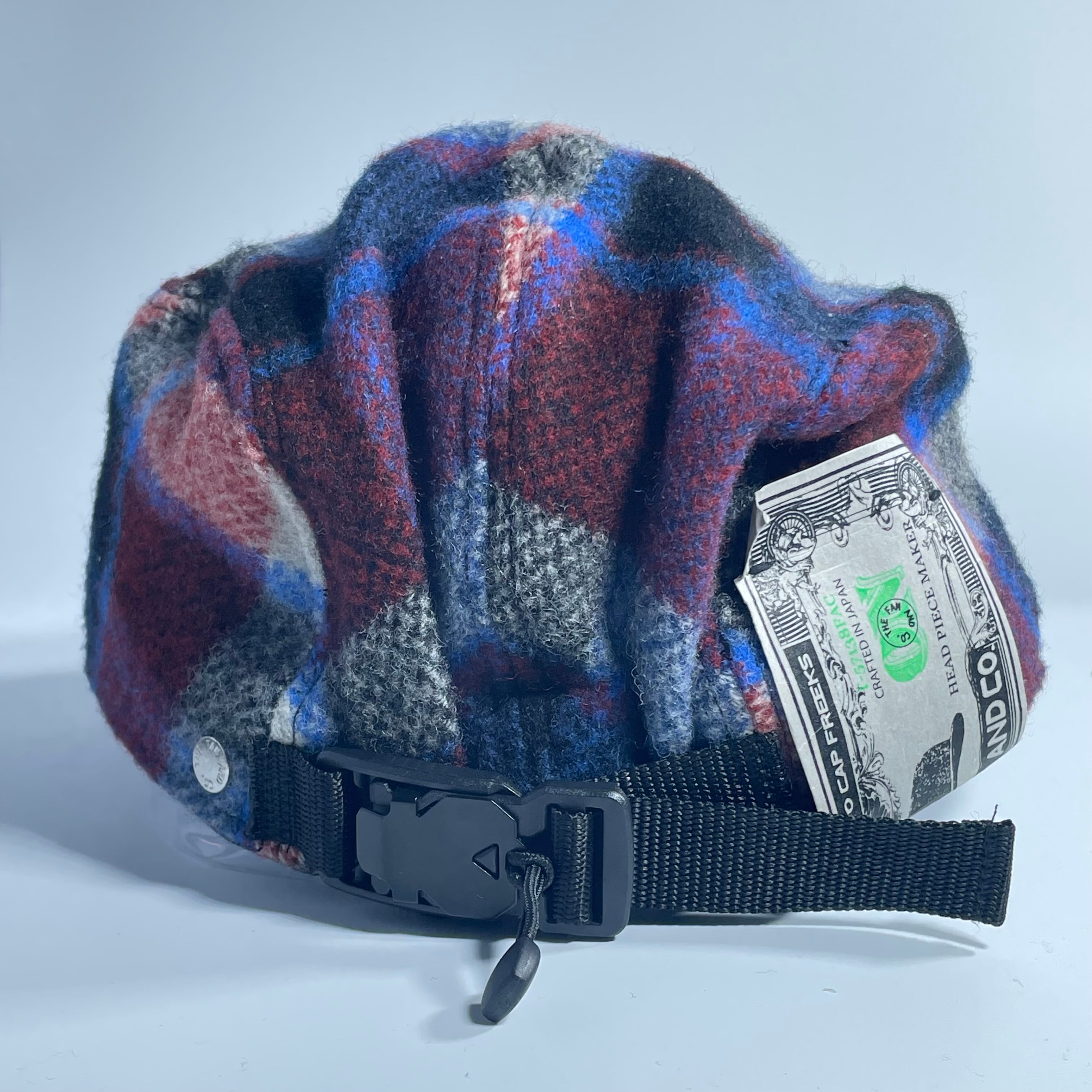 ゆったりとしたサイズ感で後部アジャスターで絞って被るデザインとなります。