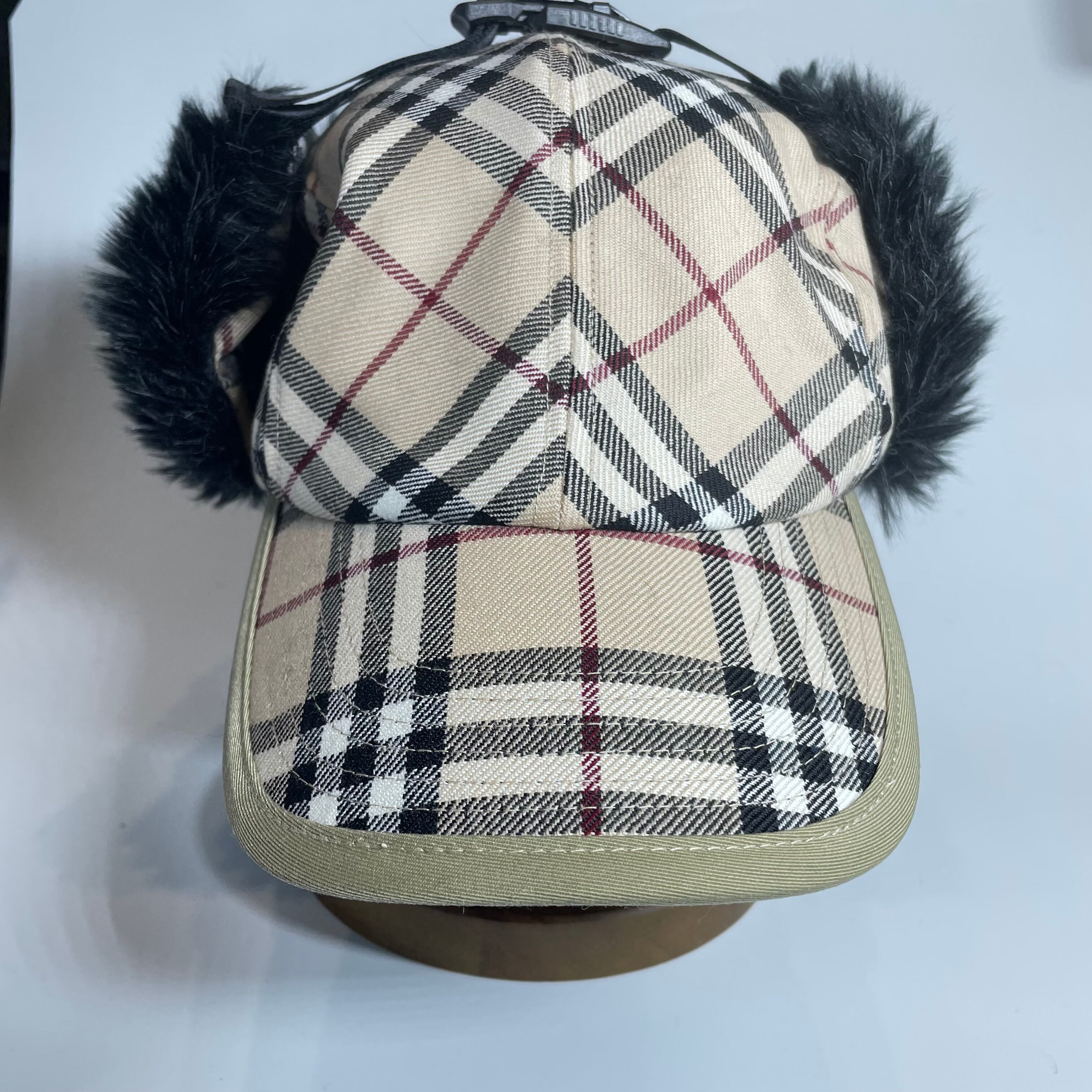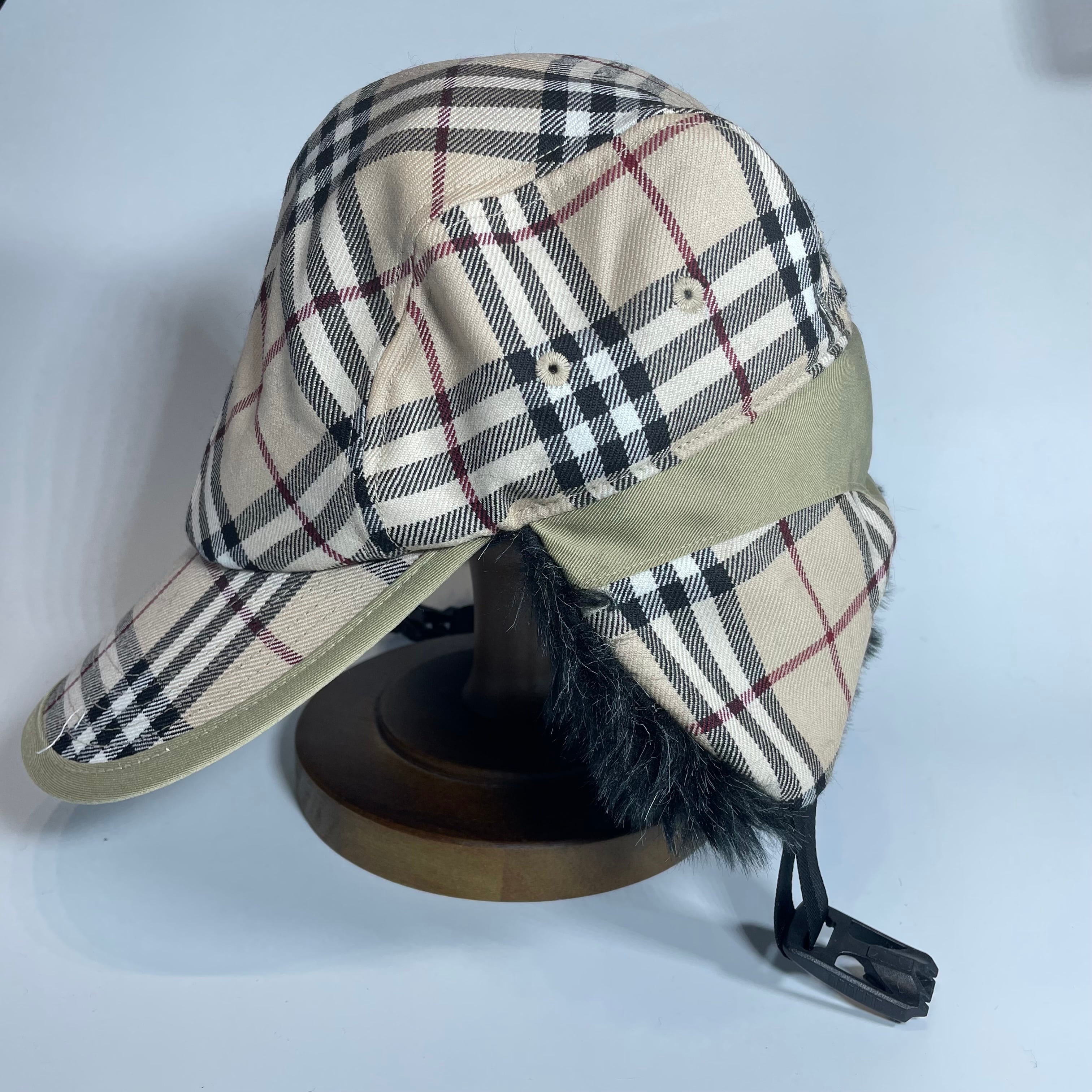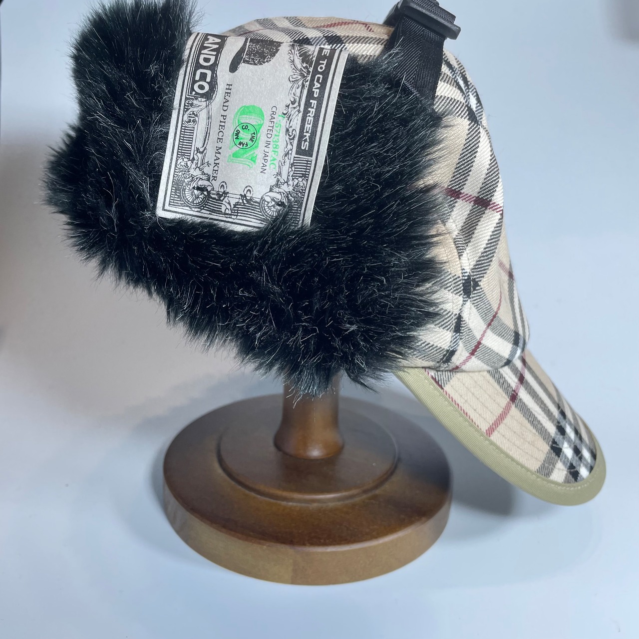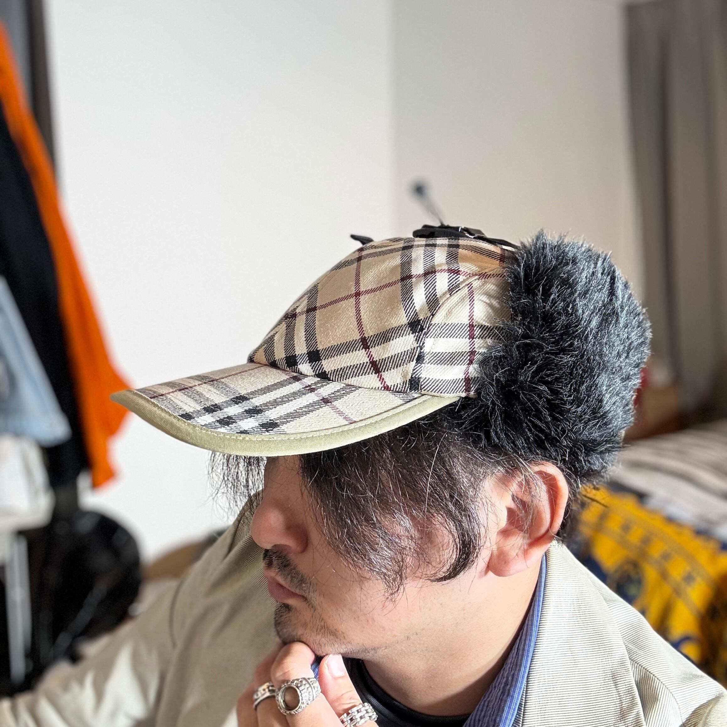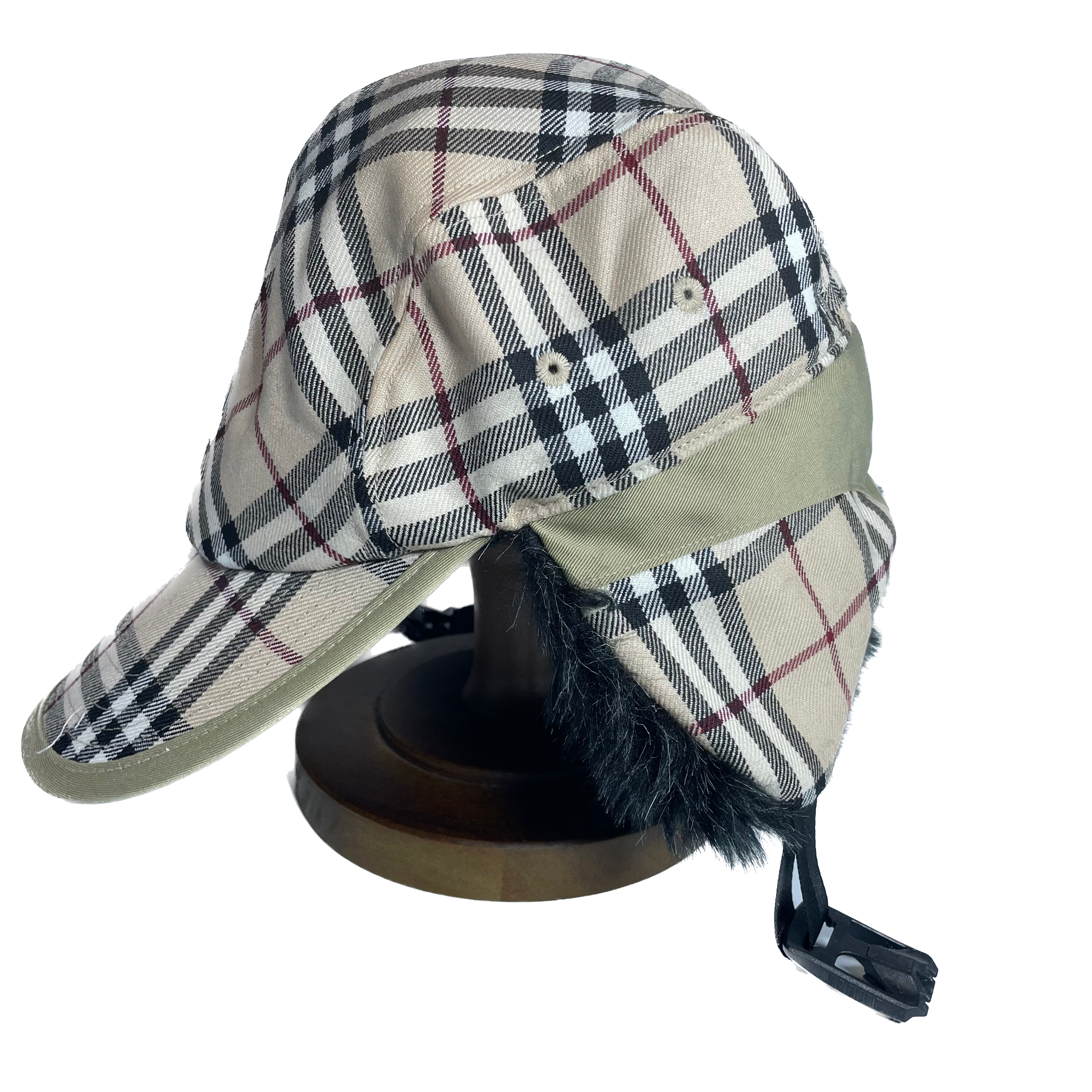 起毛感のあるノバチェック生地で仕立てた耳付きファーキャップです。