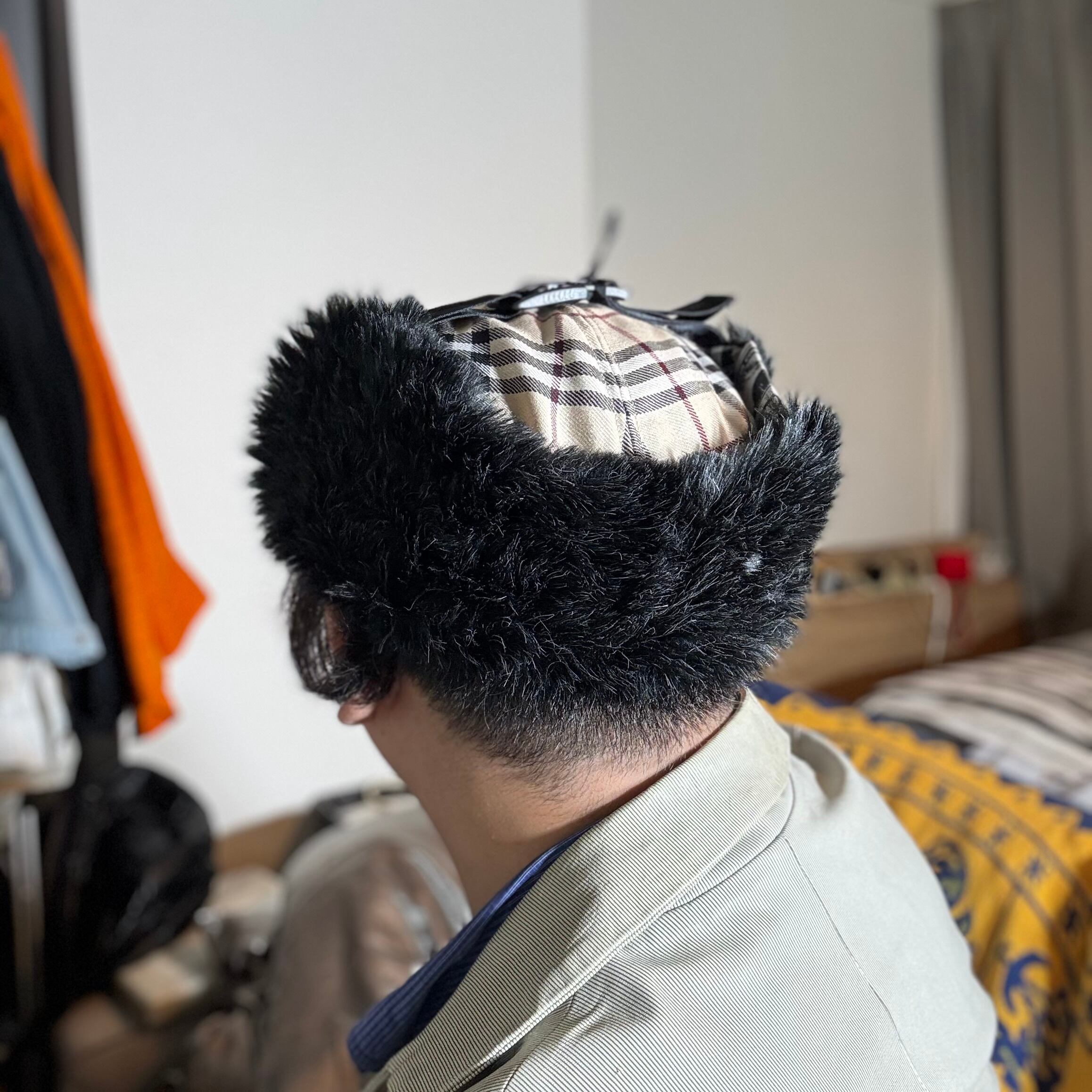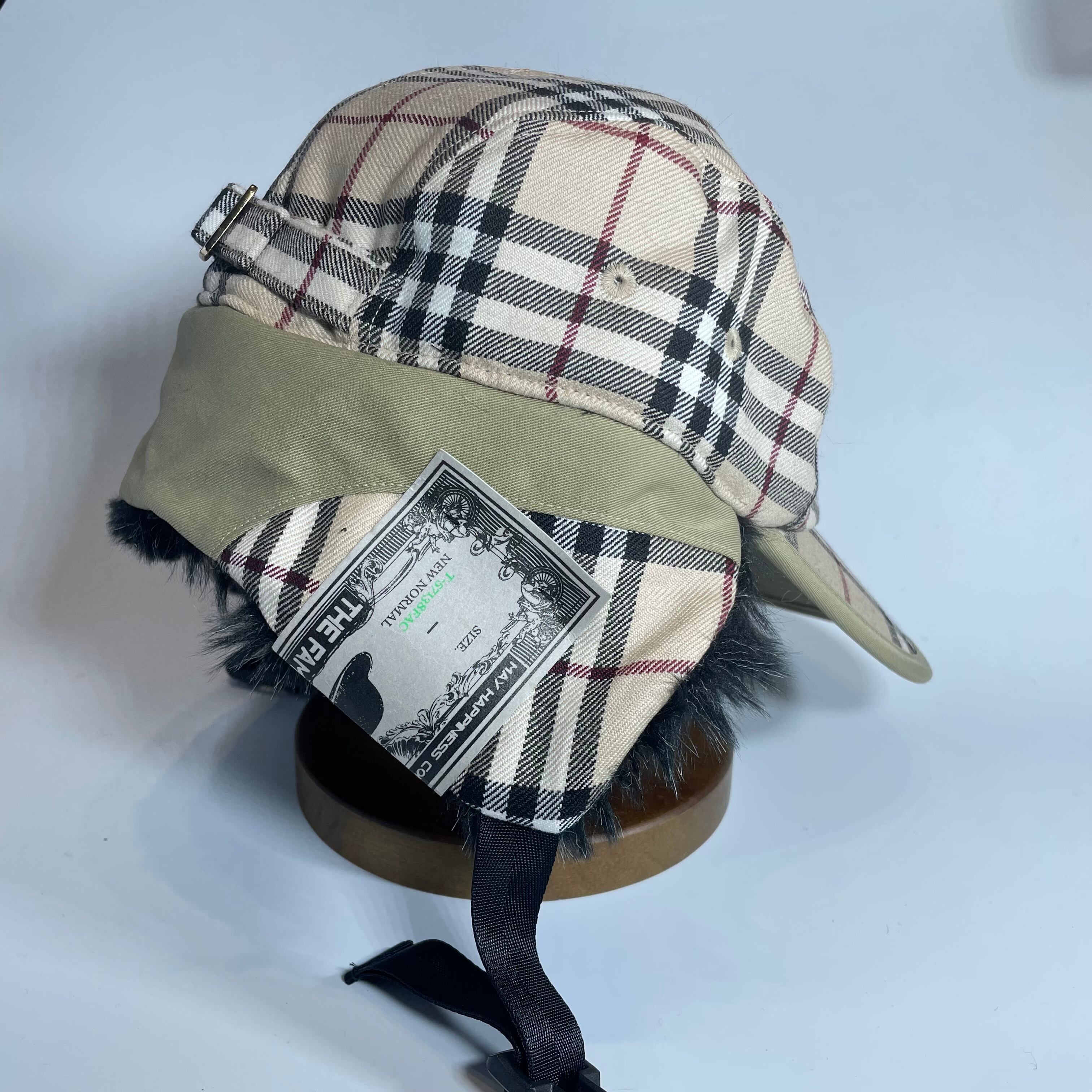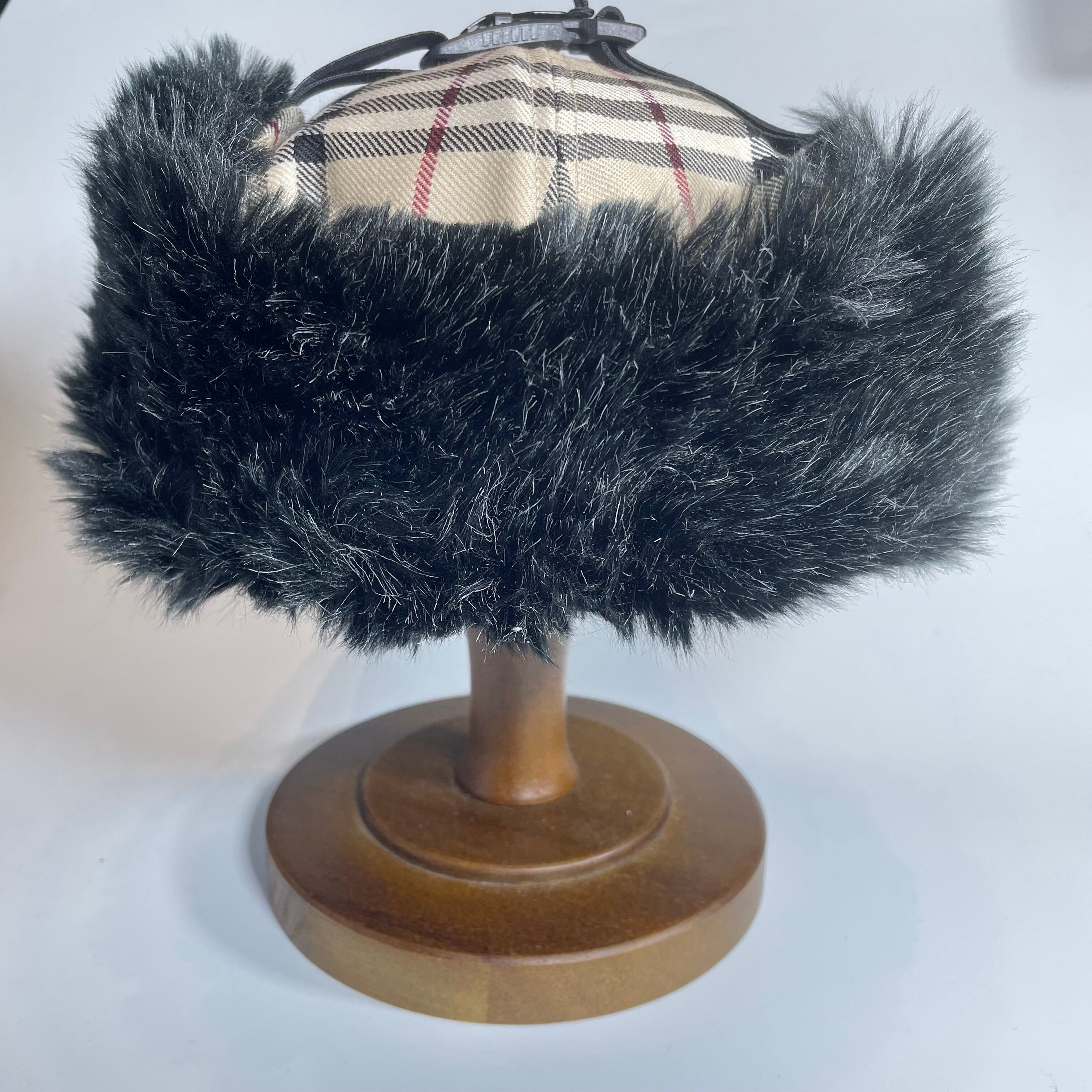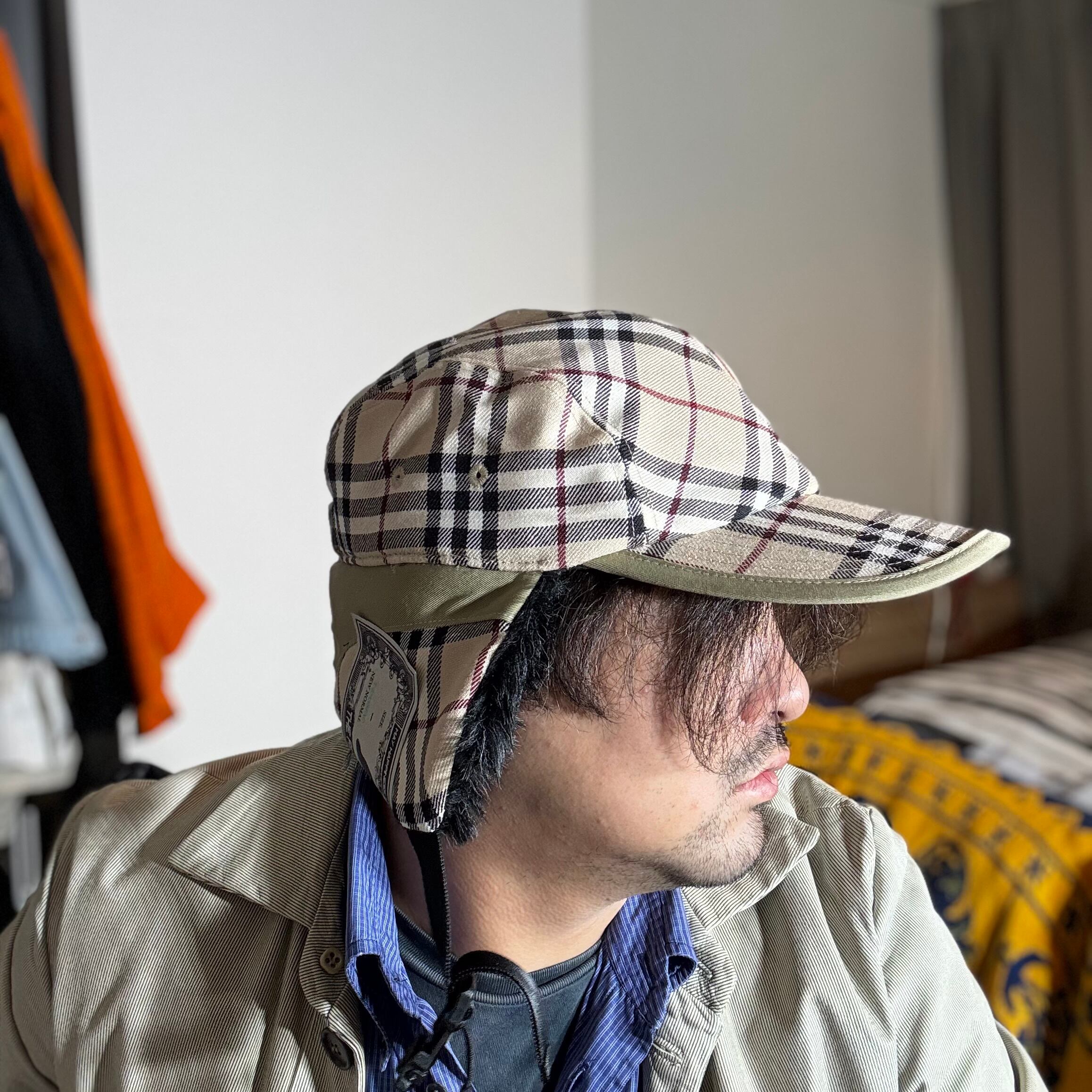 起毛感のあるノバチェック生地で仕立てた耳付きファーキャップです。