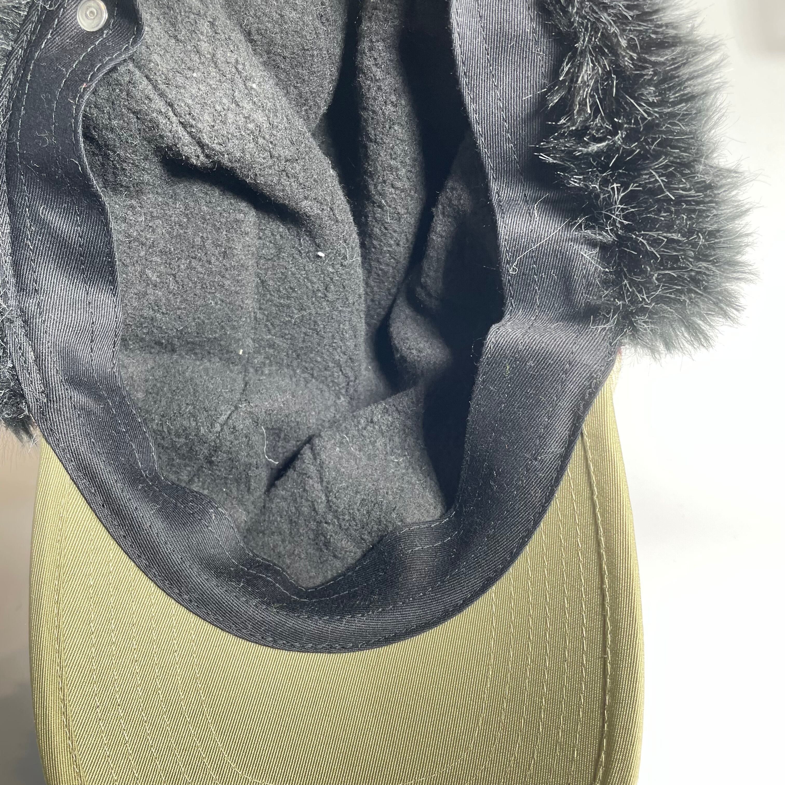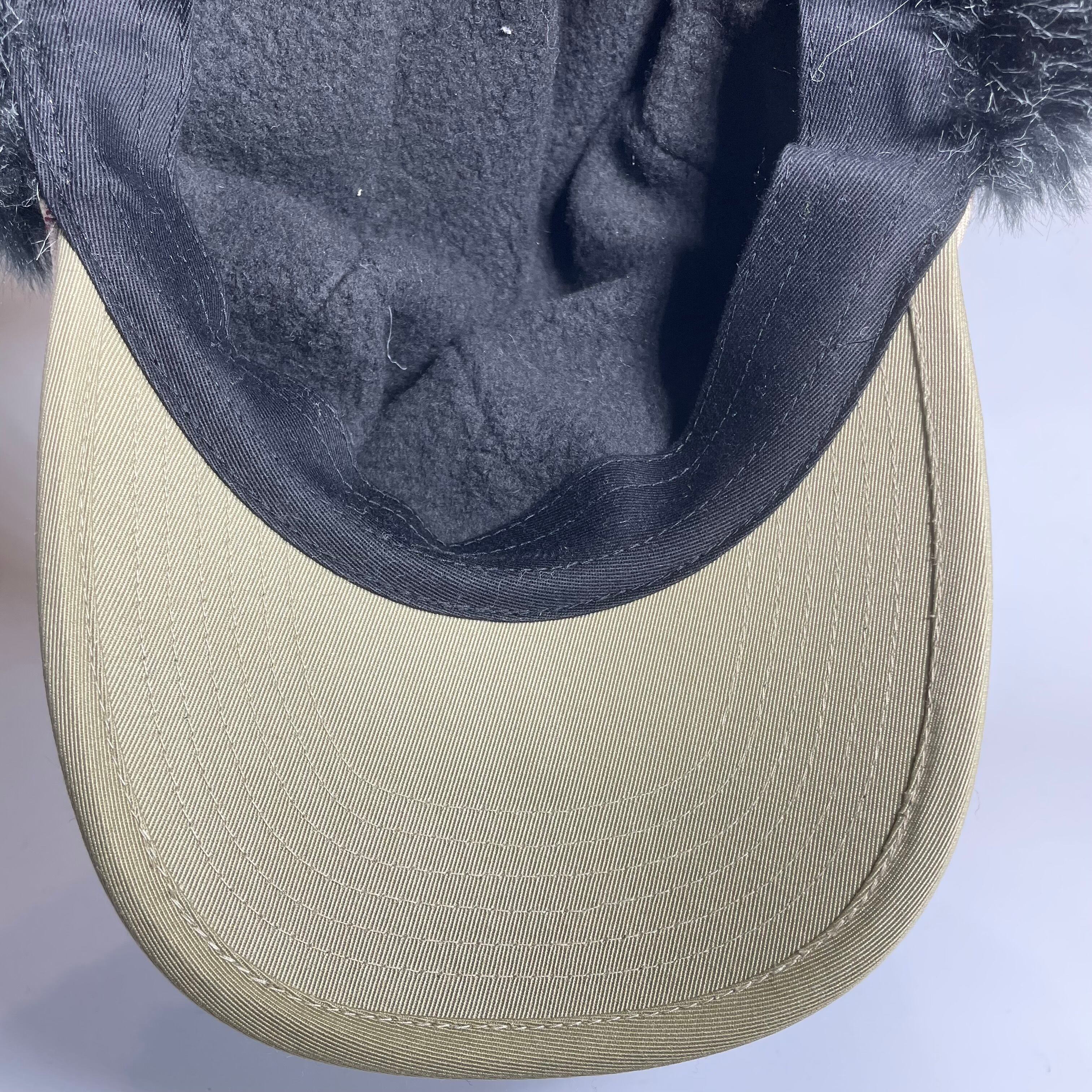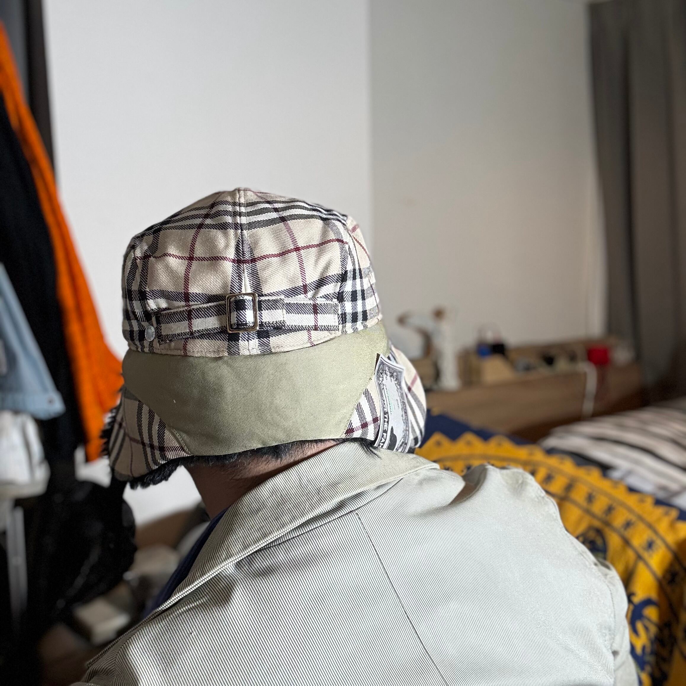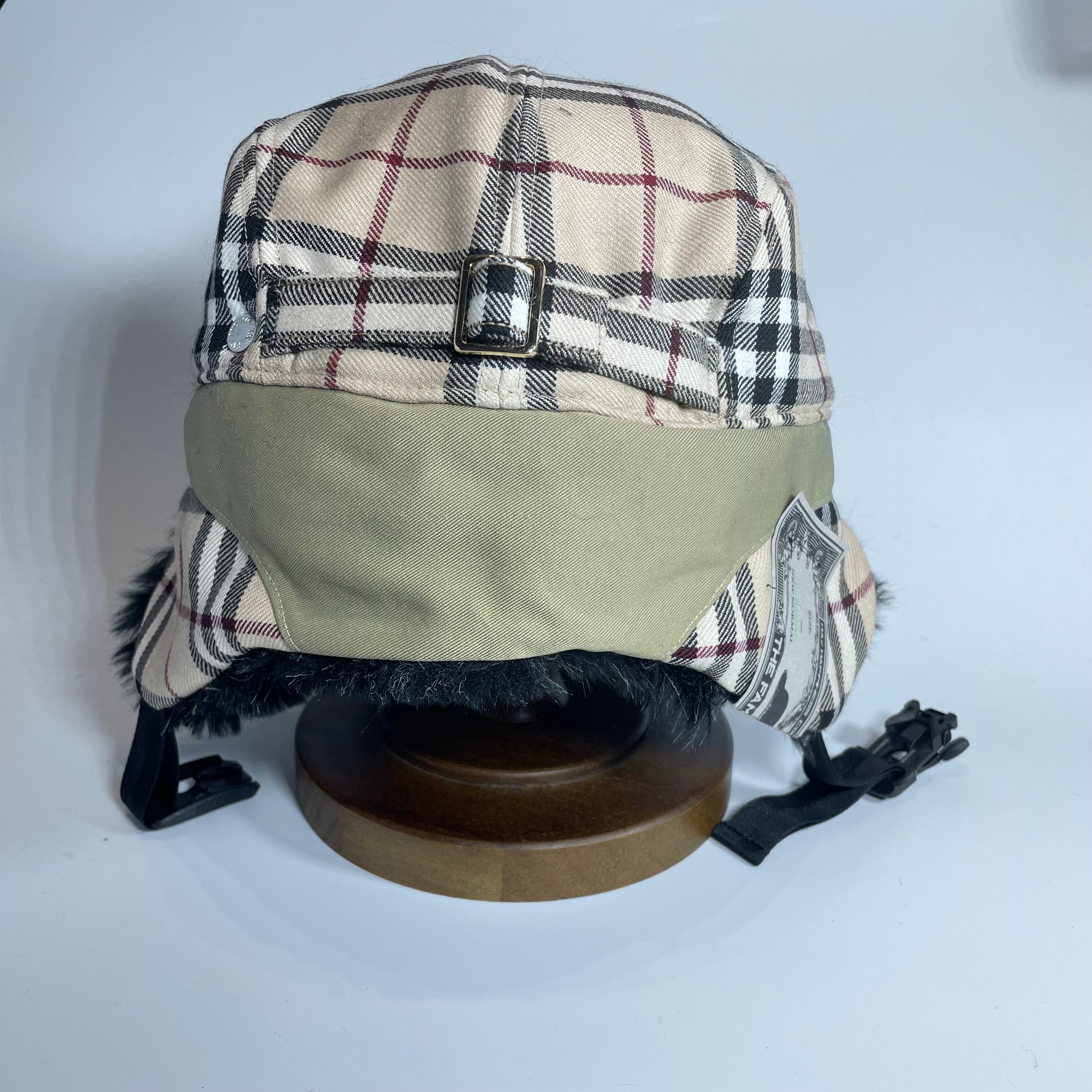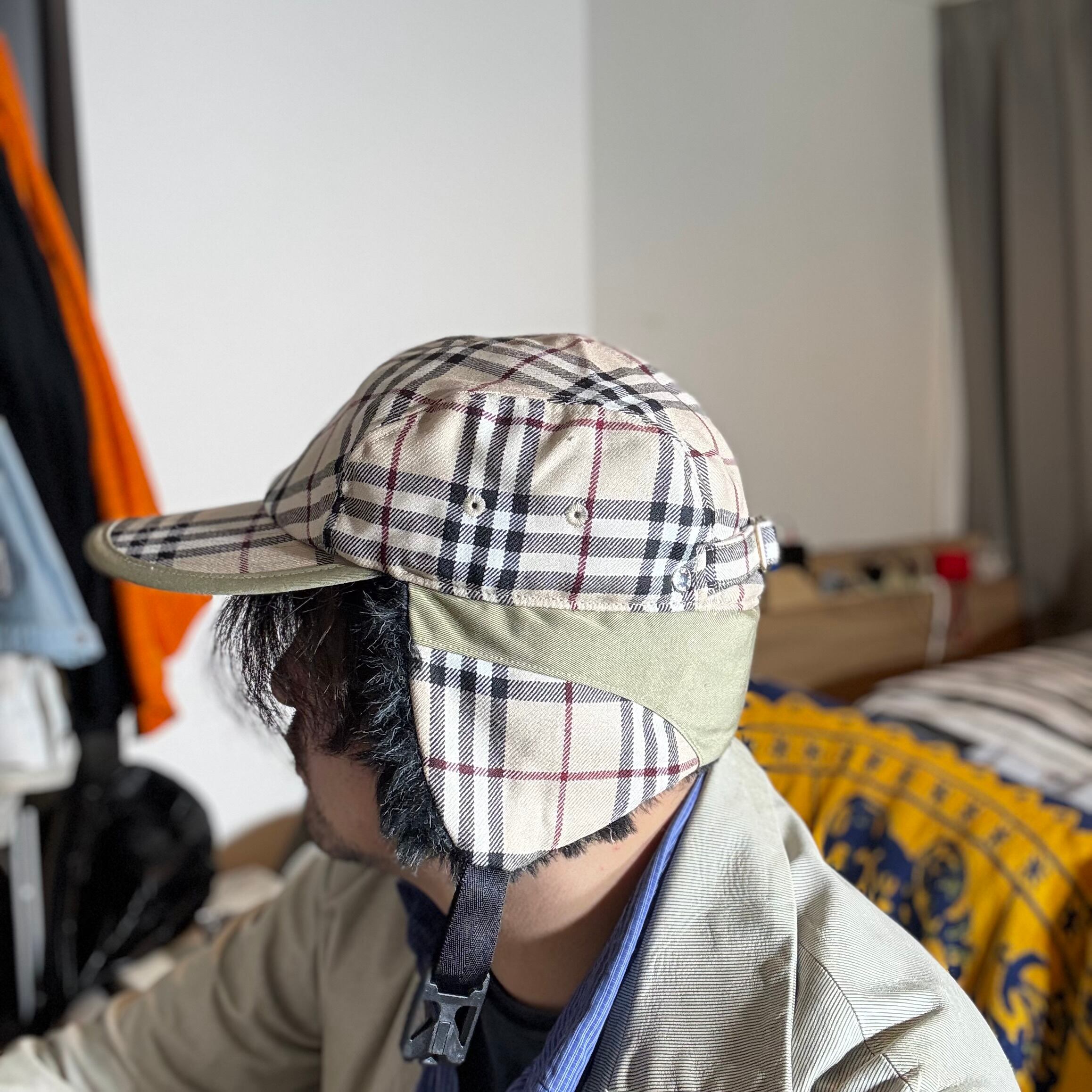 起毛感のあるノバチェック生地で仕立てた耳付きファーキャップです。