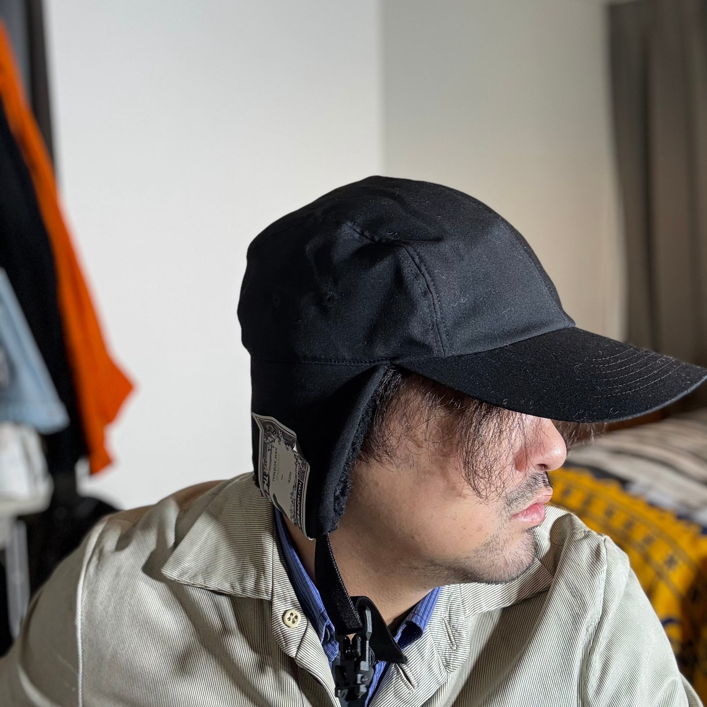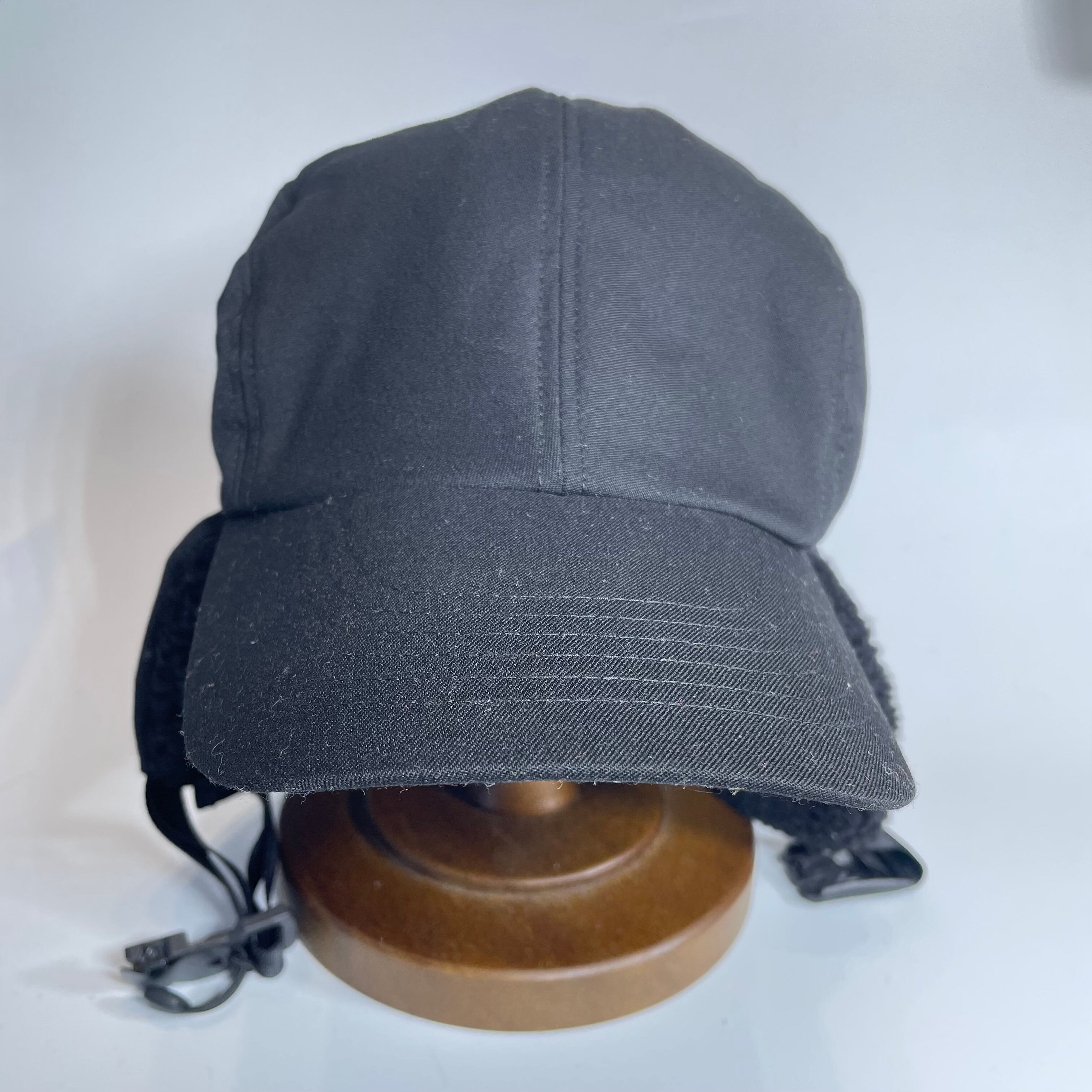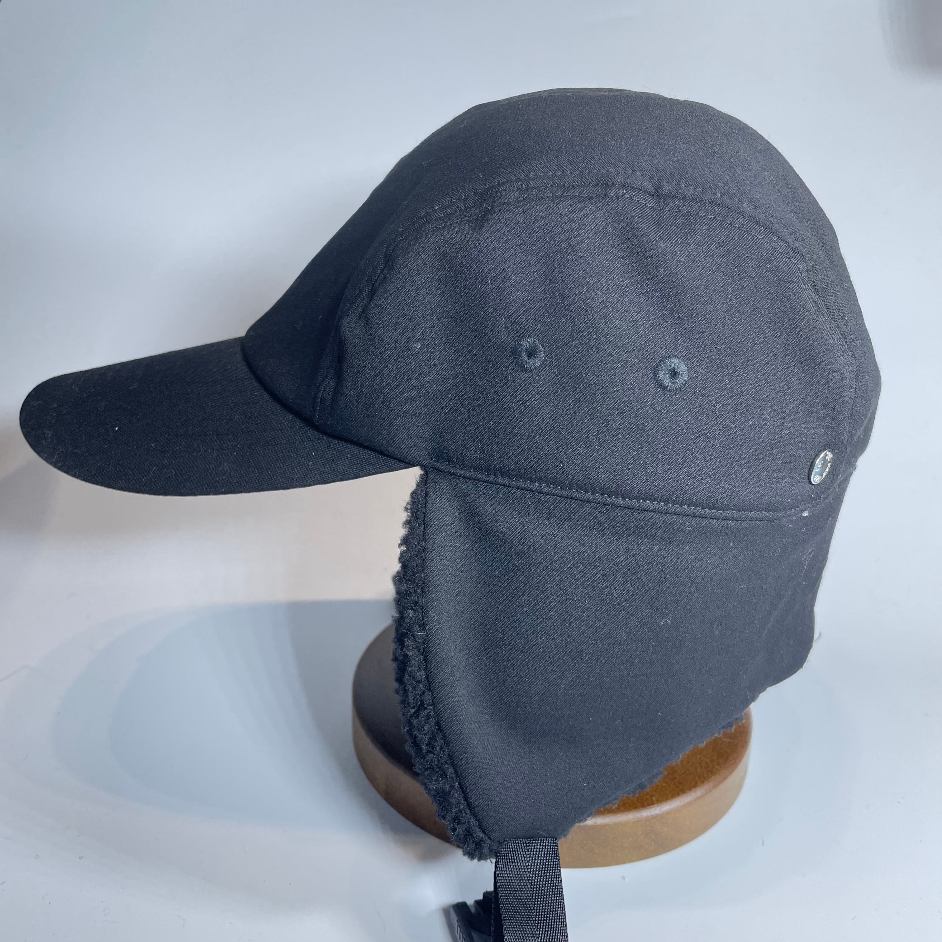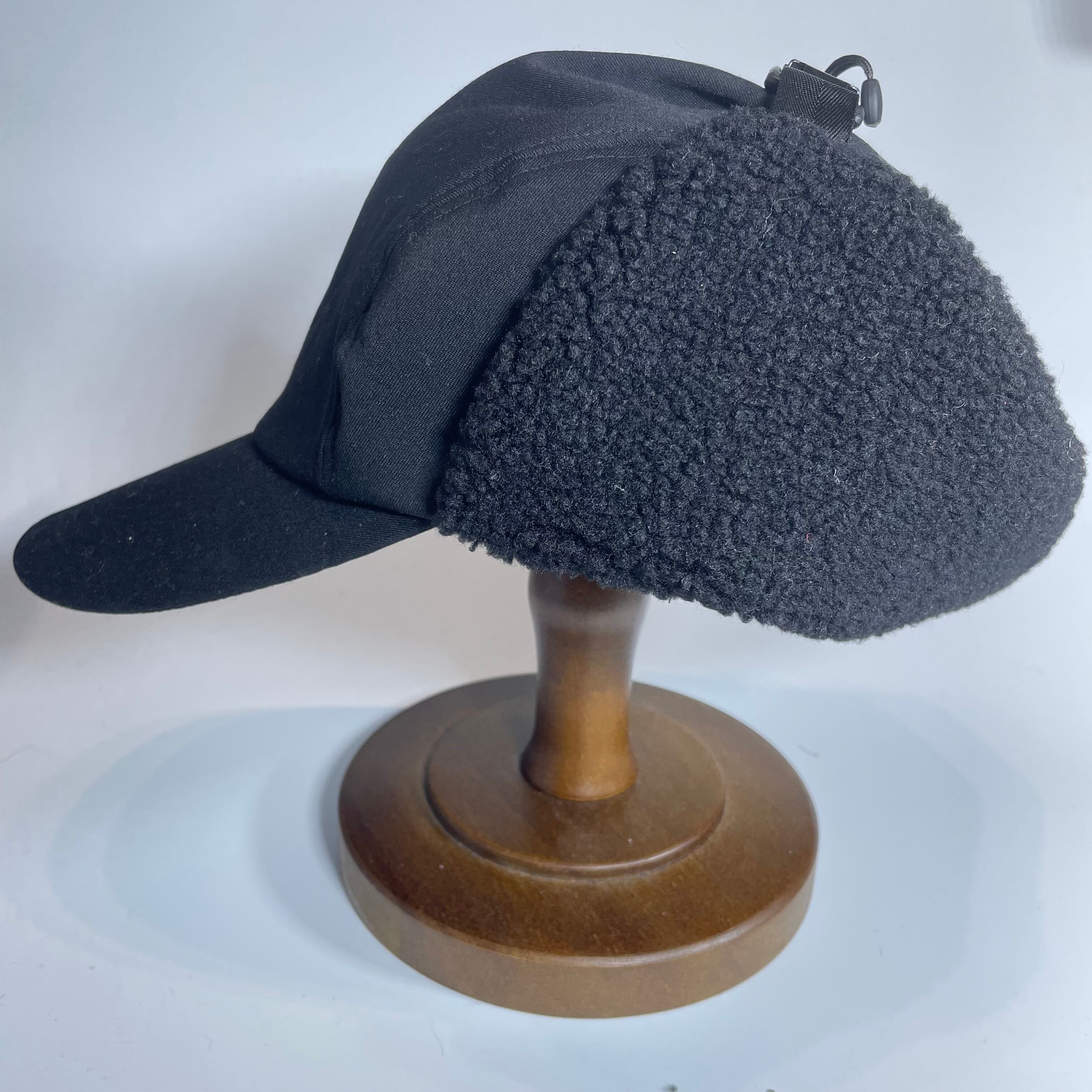スーツ地として使われるストレッチウール素材で仕立てた耳付きファーキャップです。