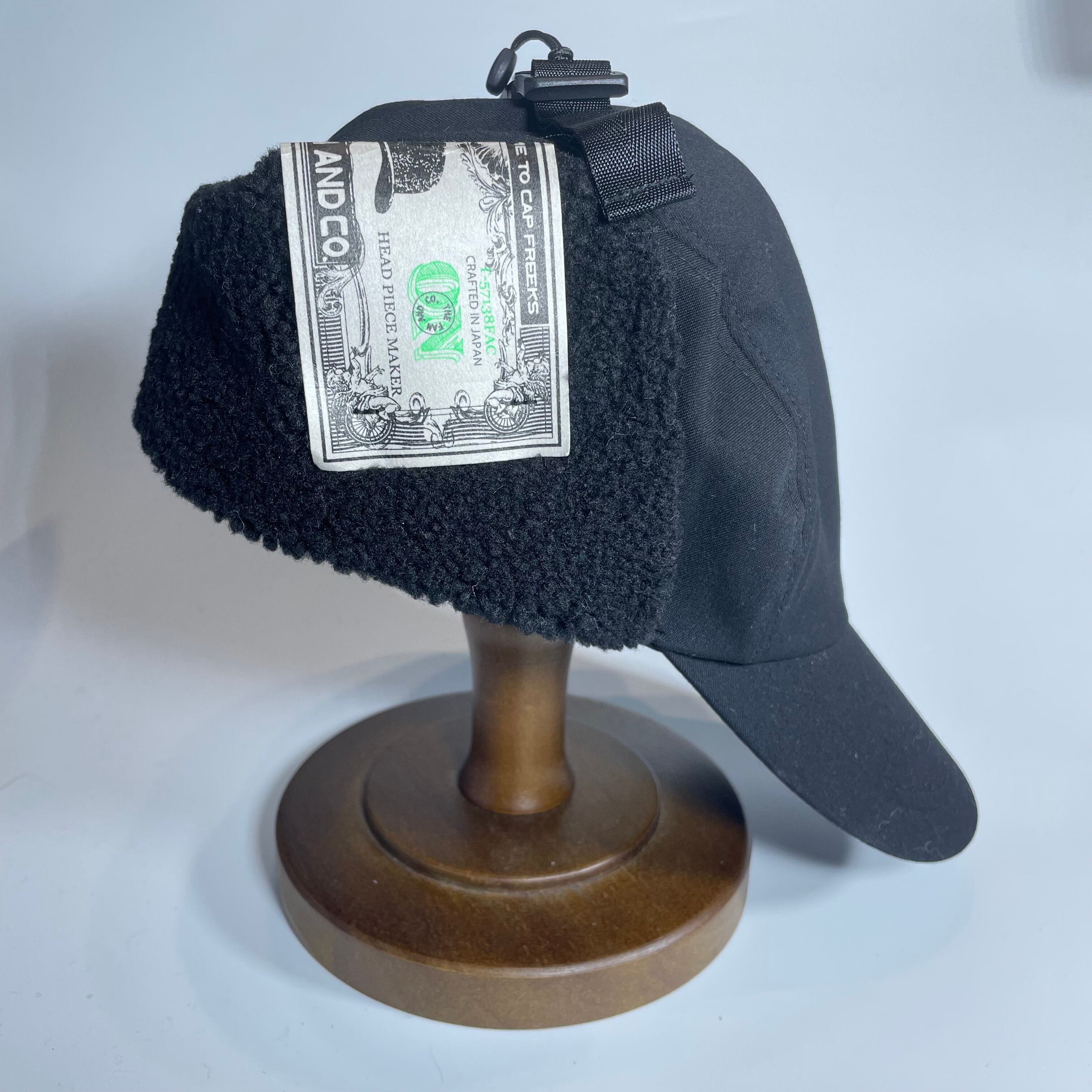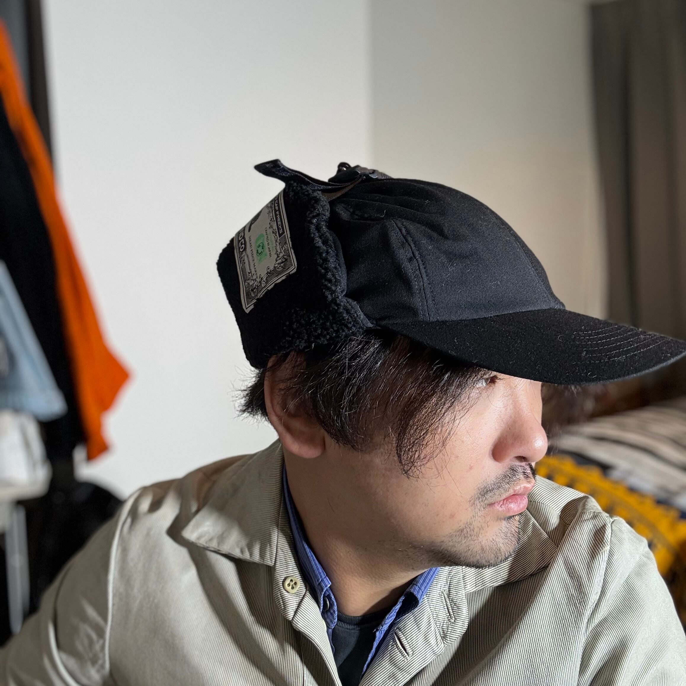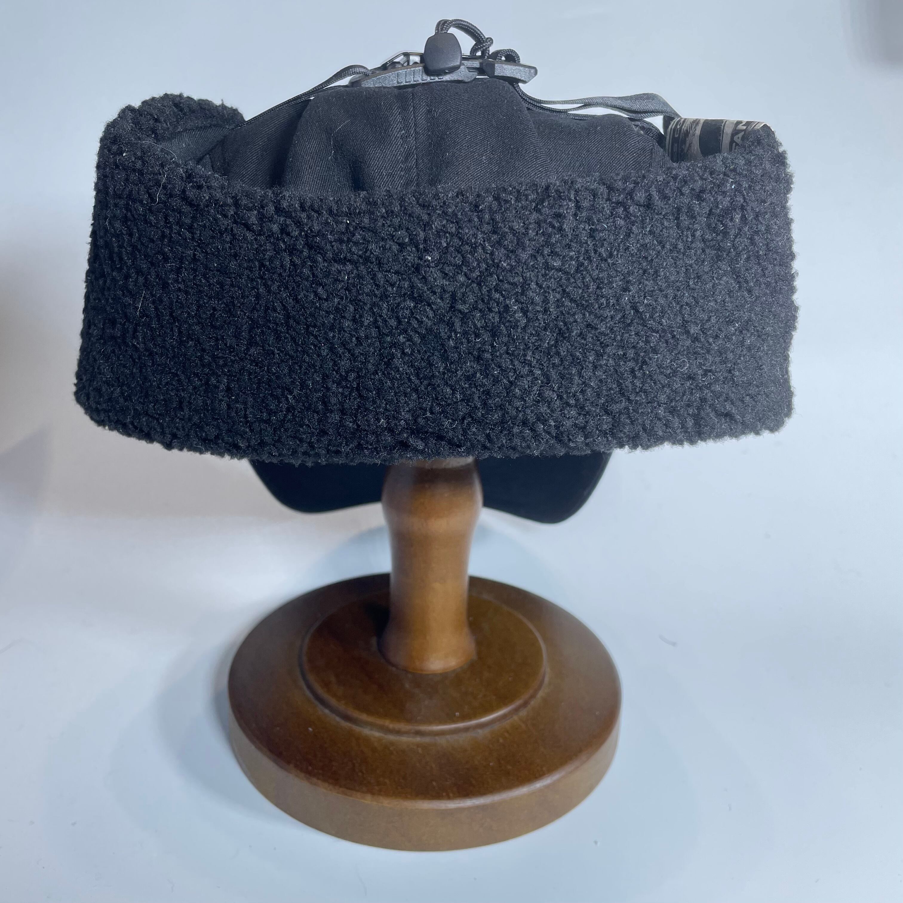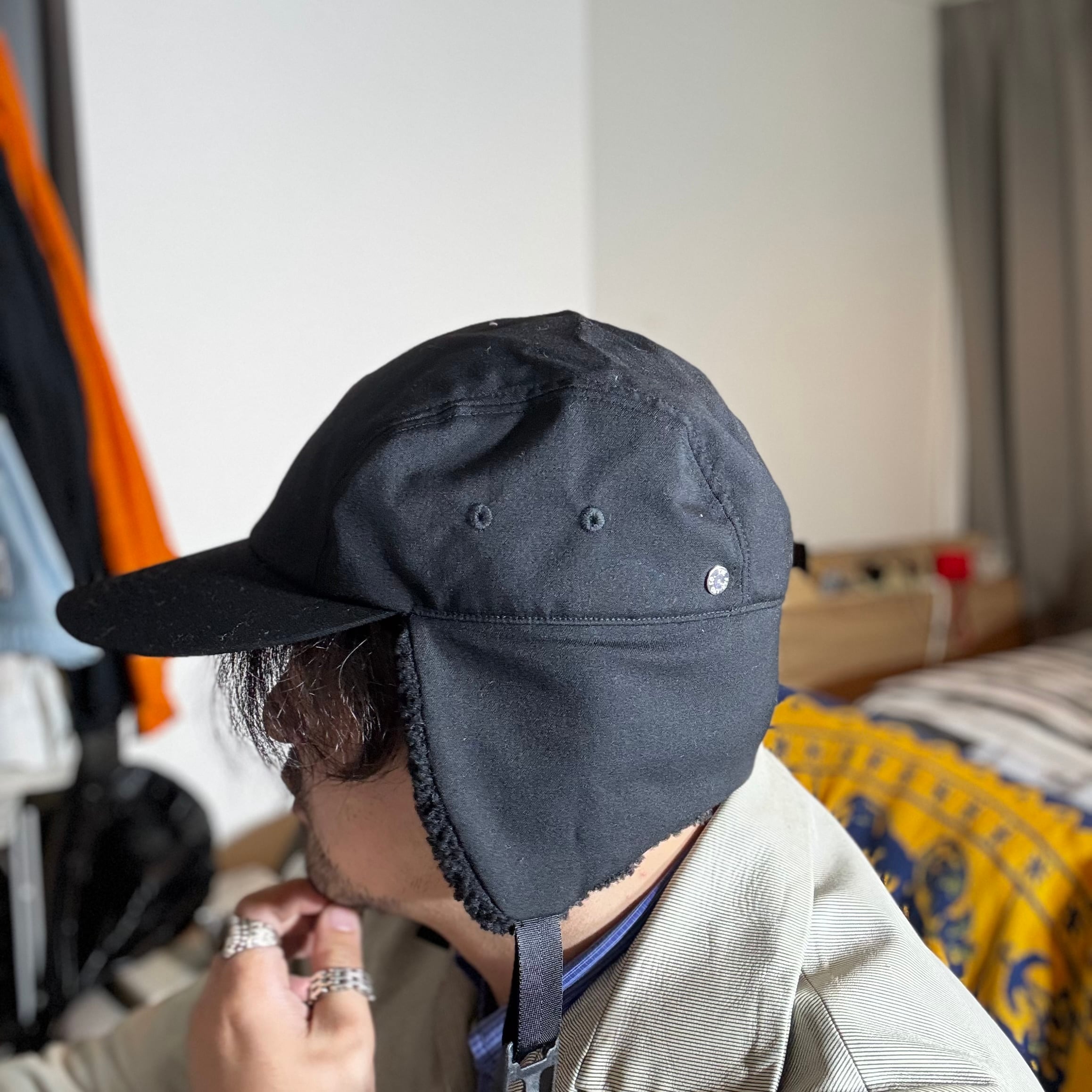 スーツ地として使われるストレッチウール素材で仕立てた耳付きファーキャップです。