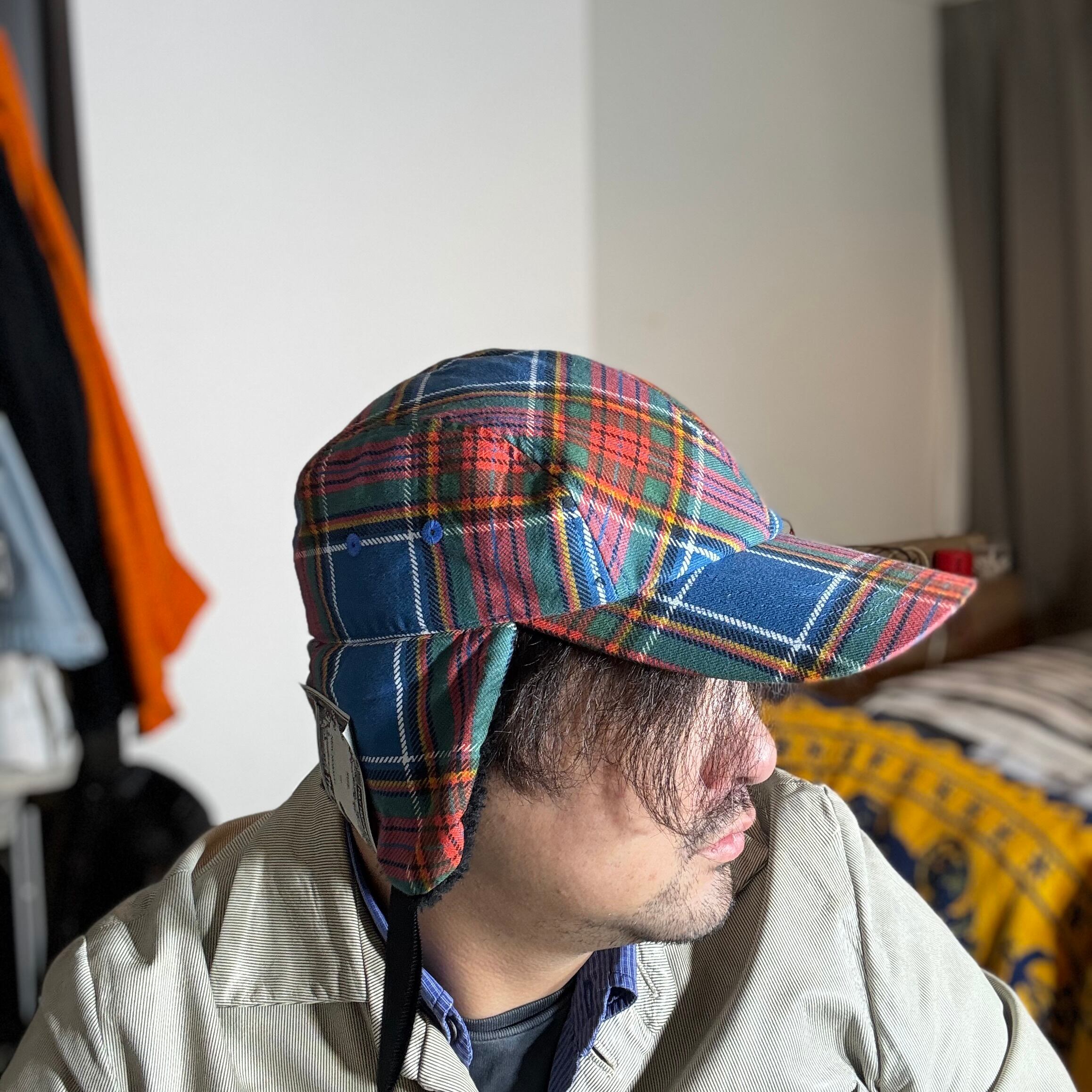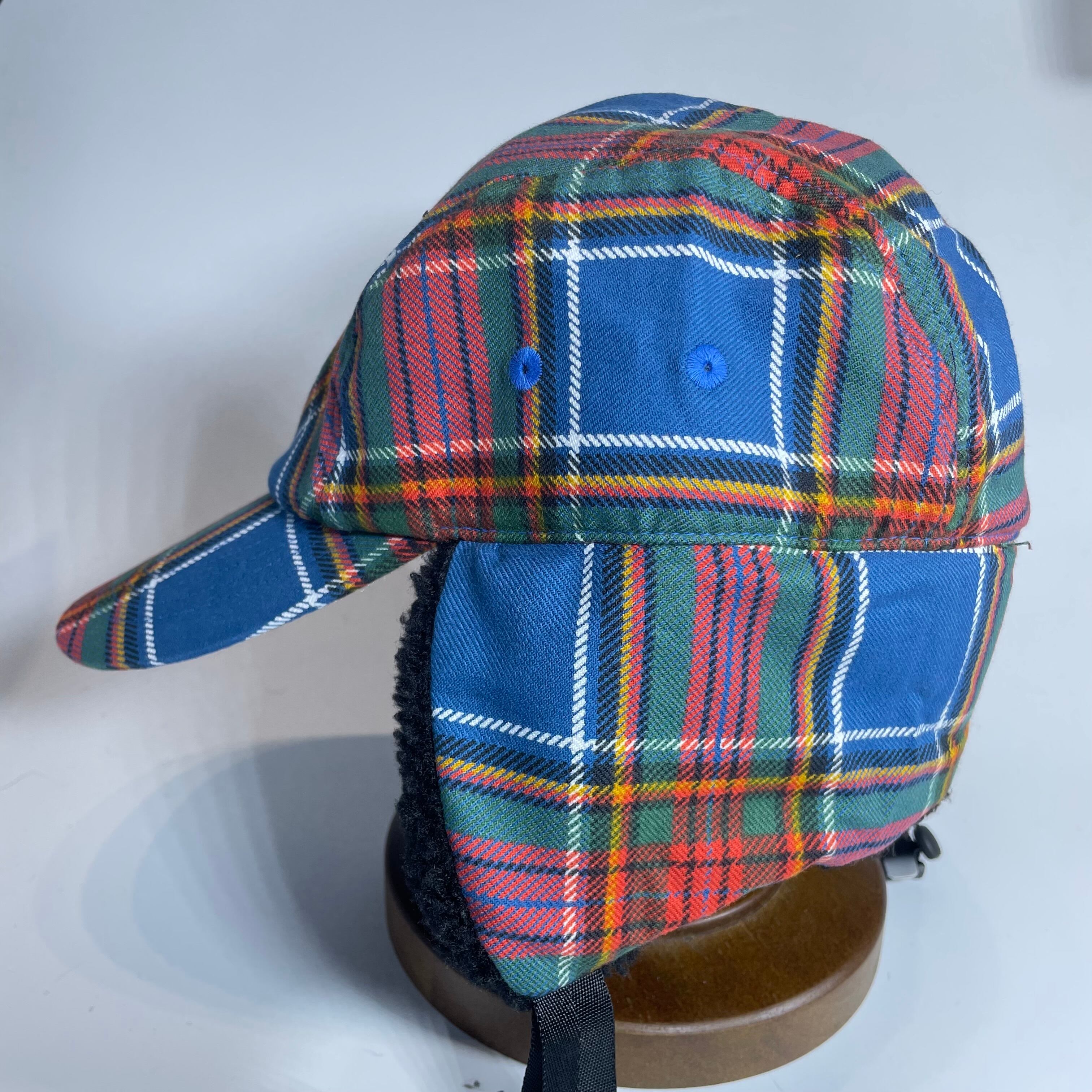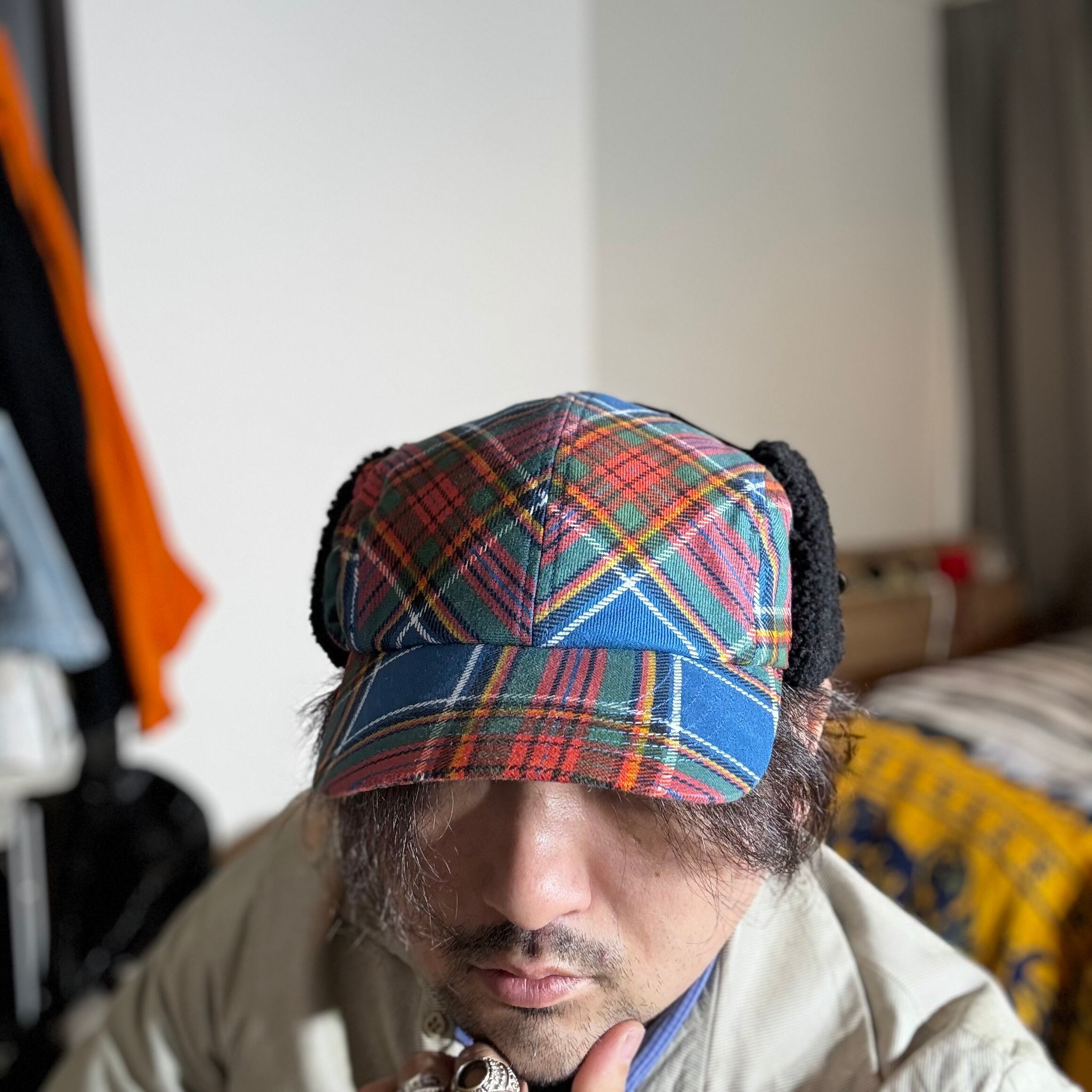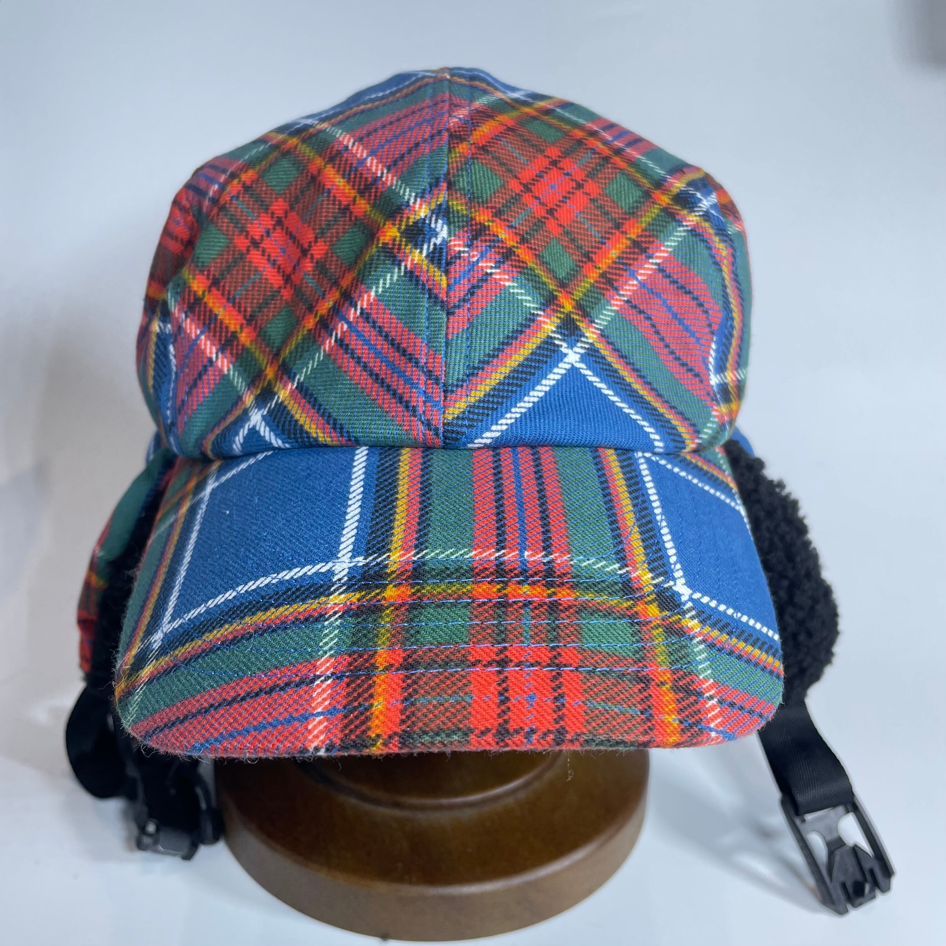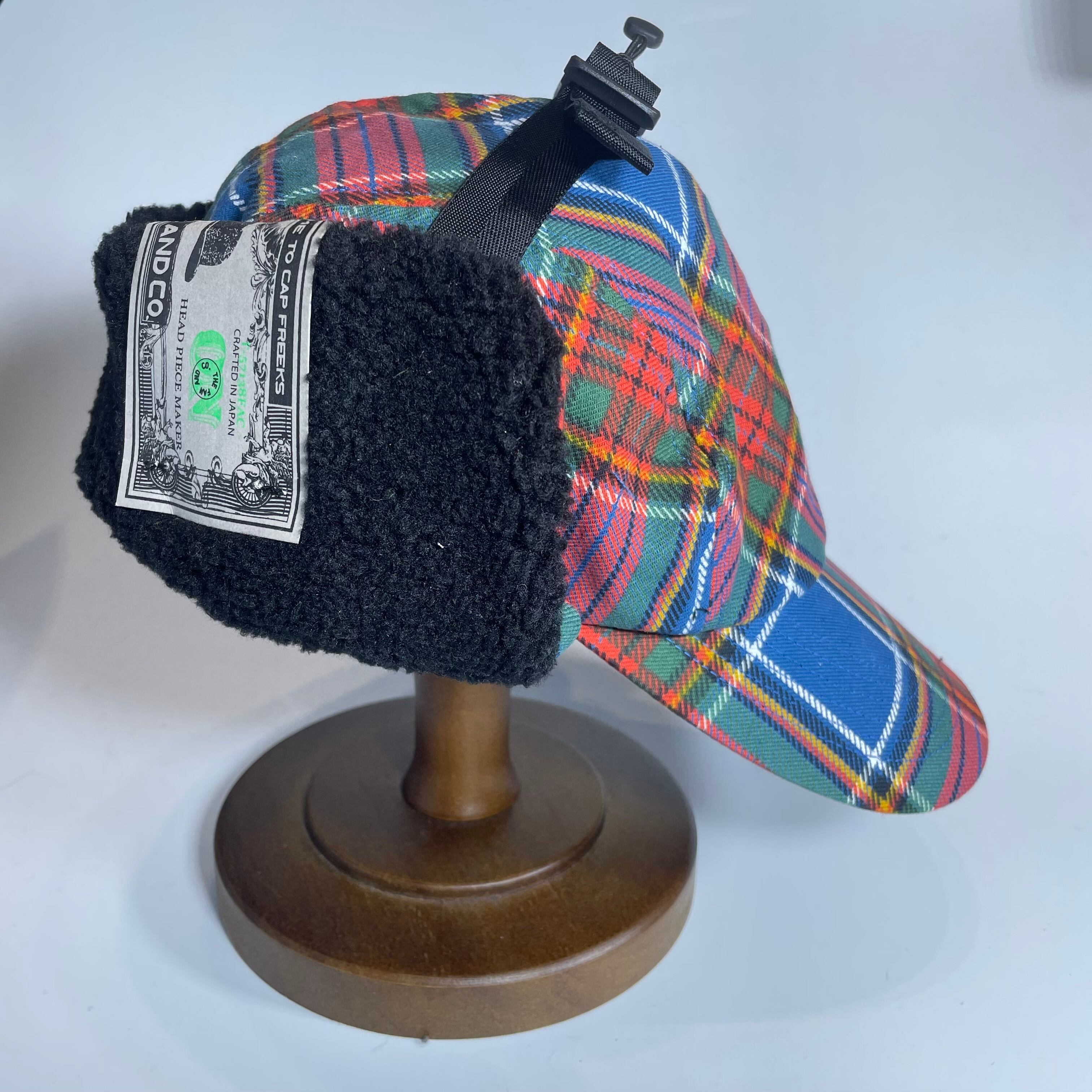 クラシックなタータンチェック柄の生地で仕立てた耳付きファーキャップです。