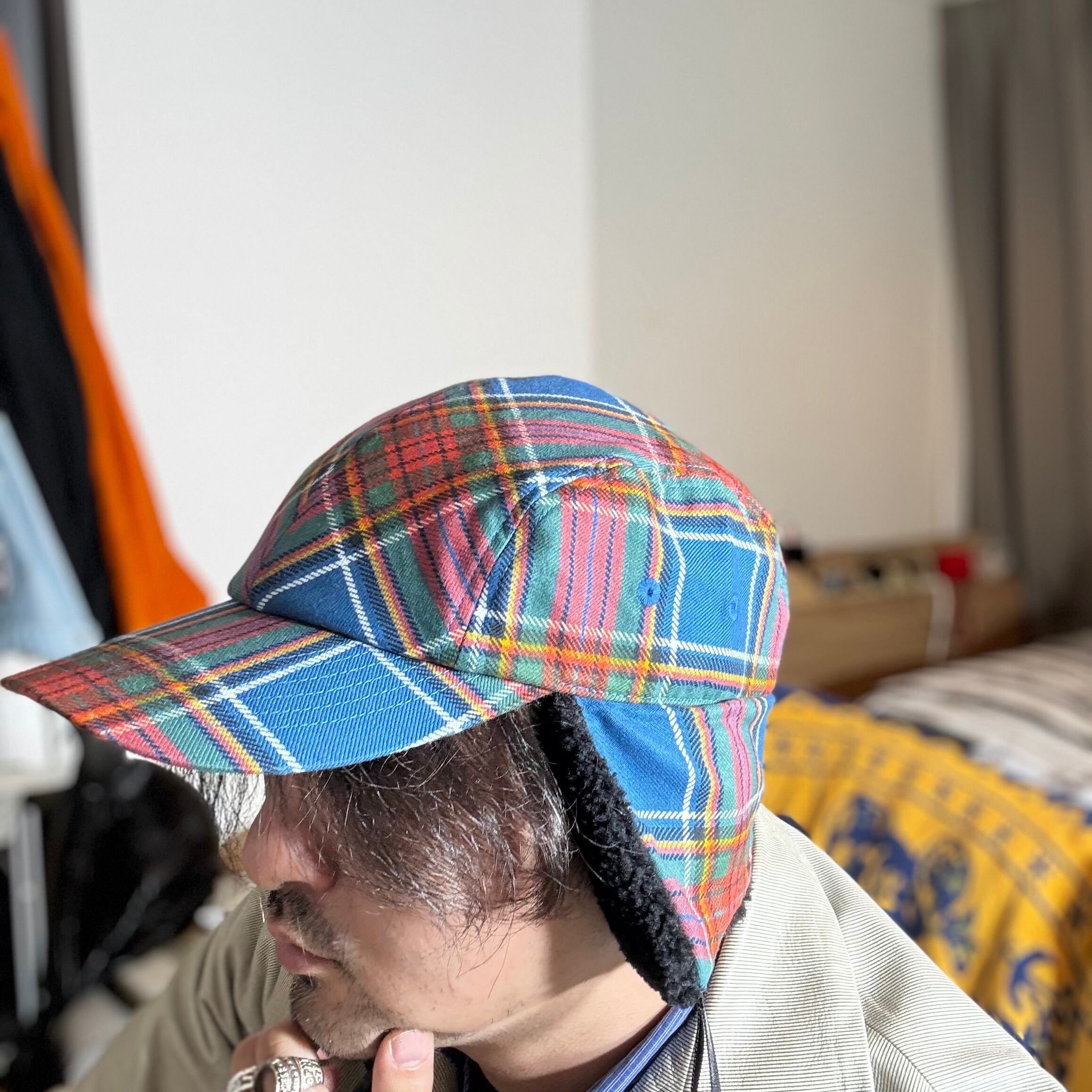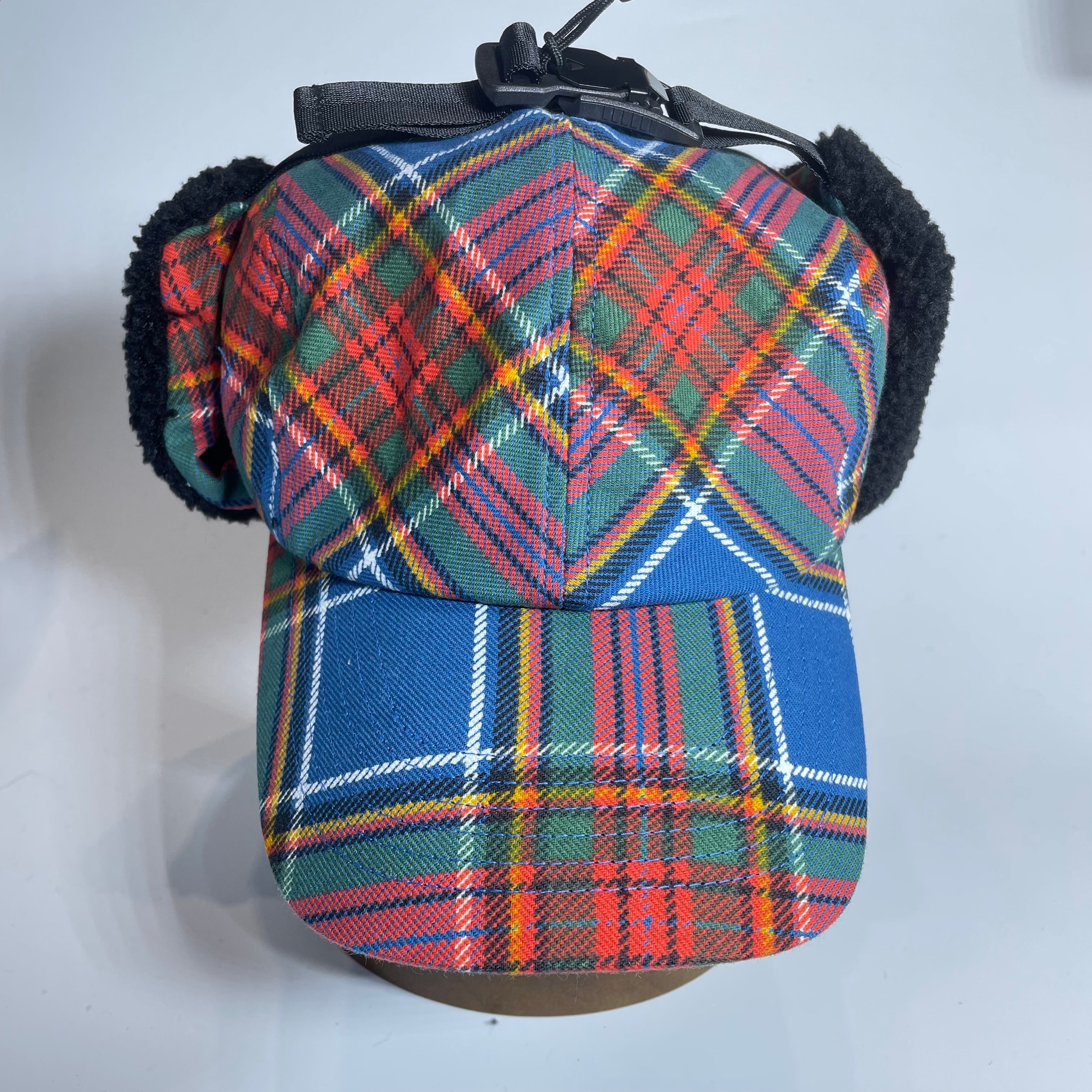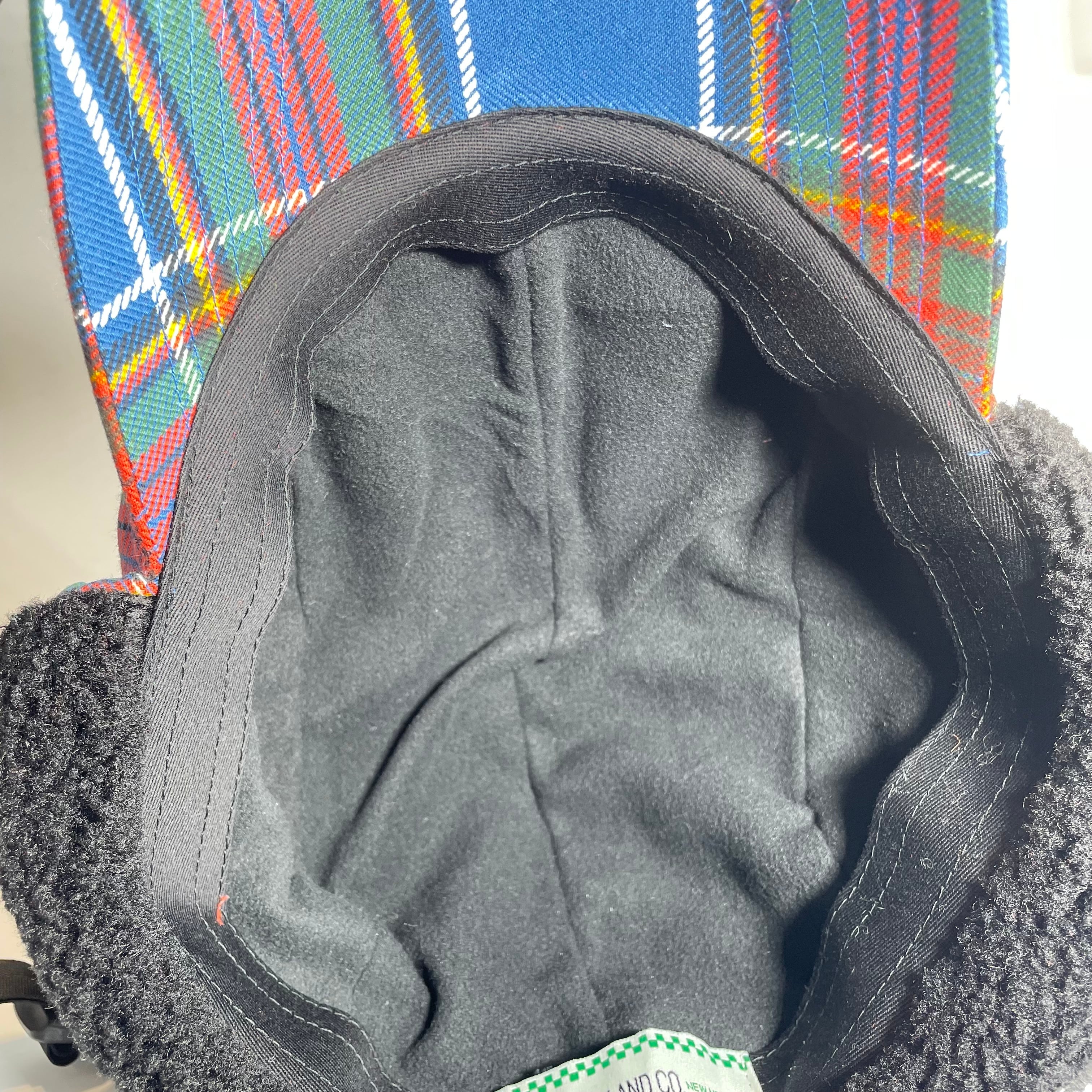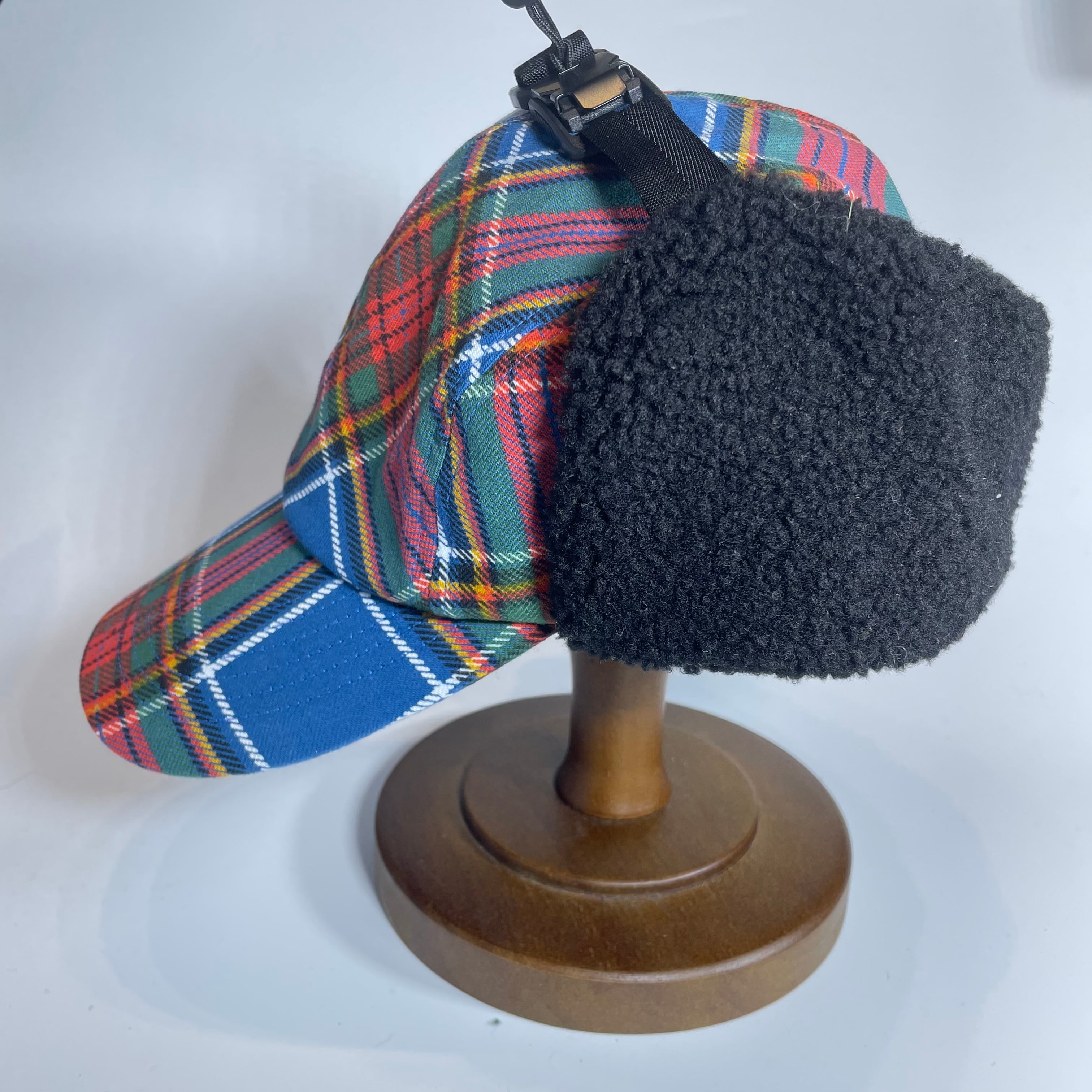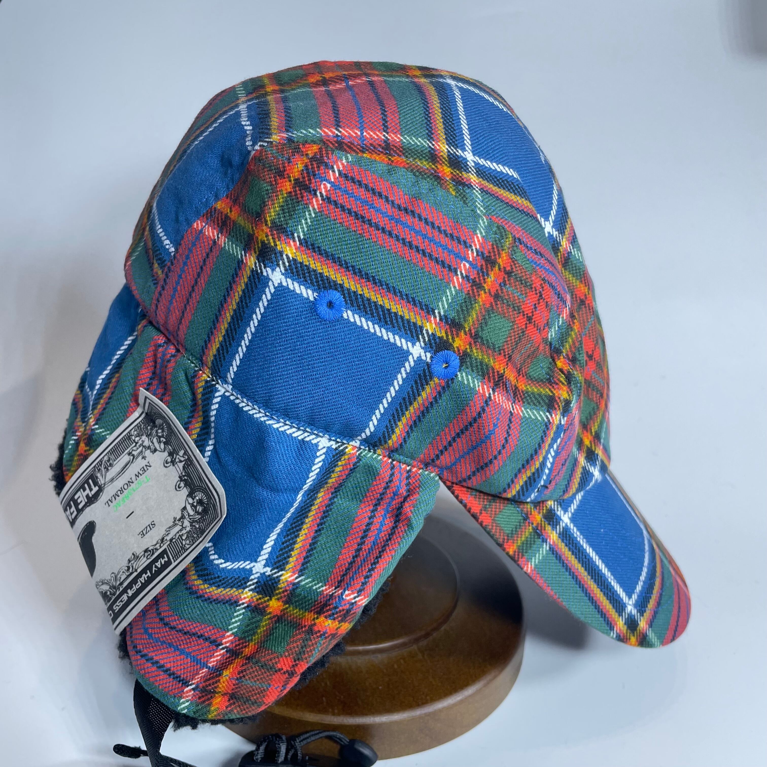 クラシックなタータンチェック柄の生地で仕立てた耳付きファーキャップです。