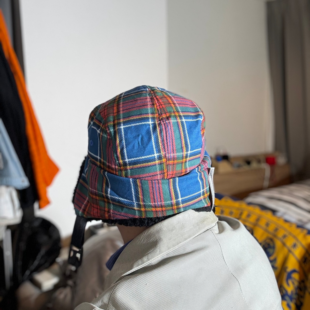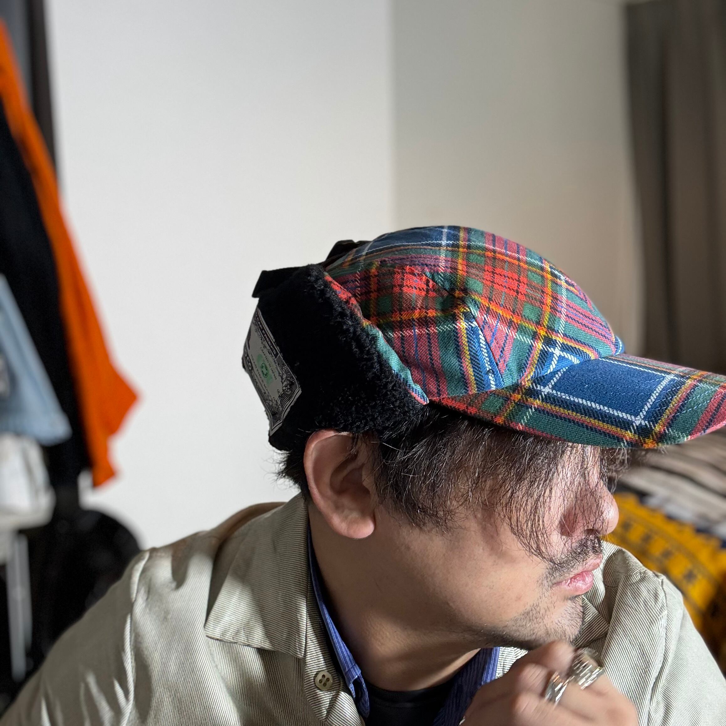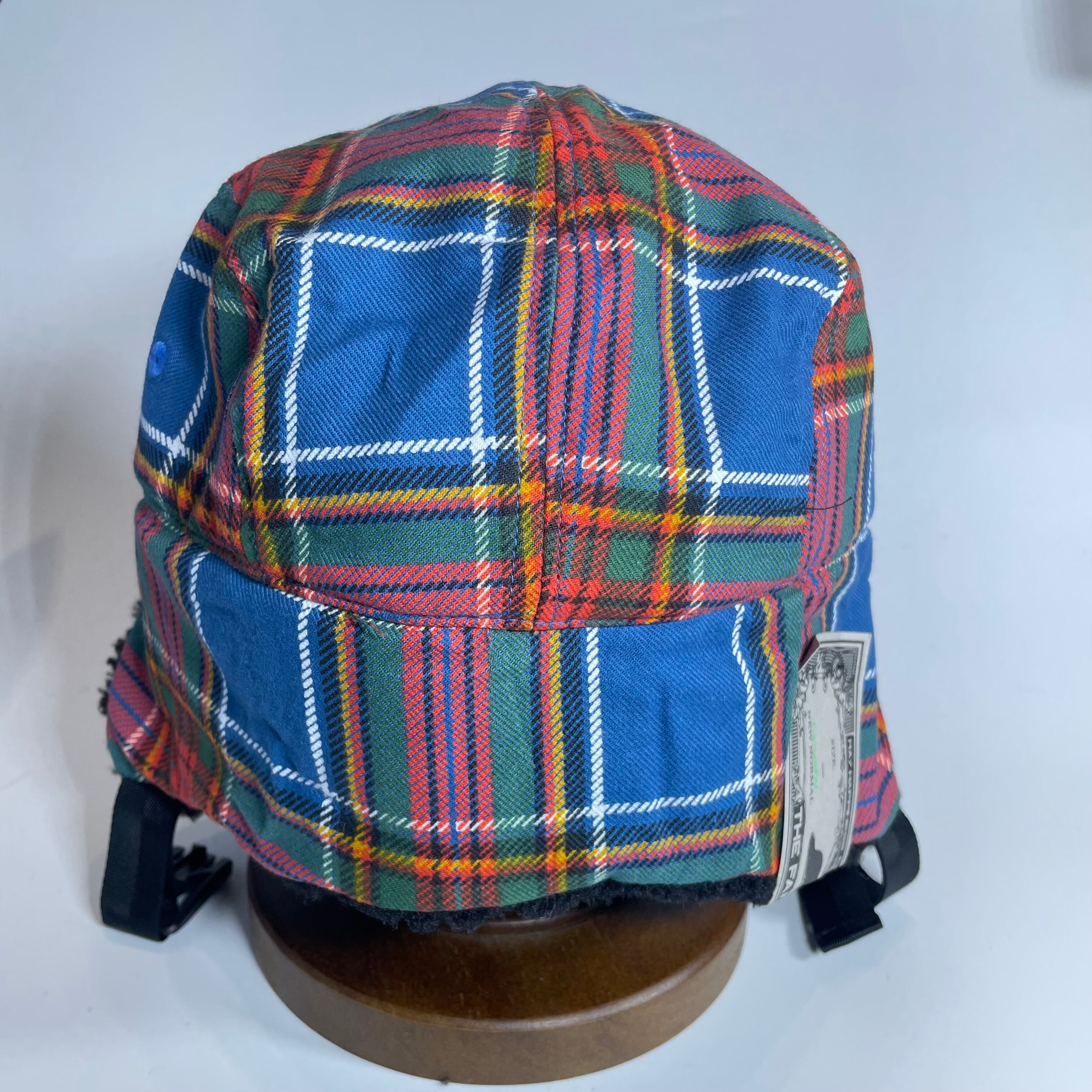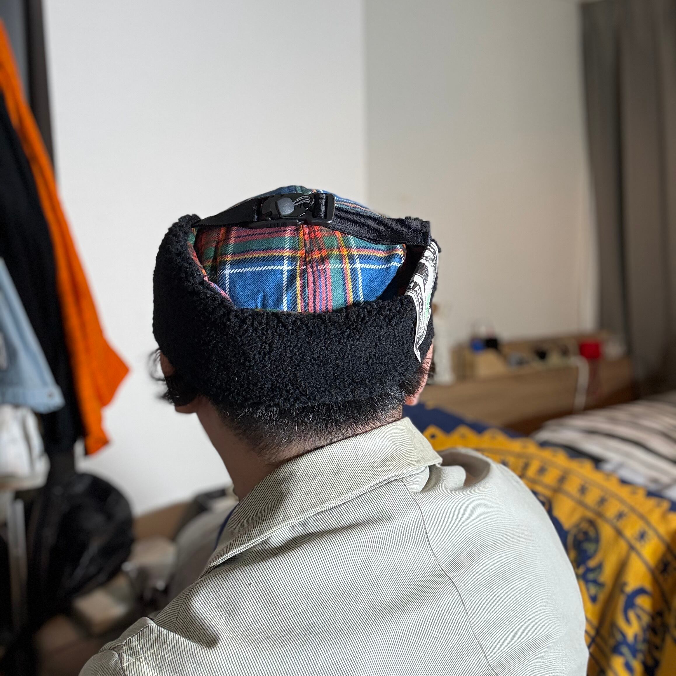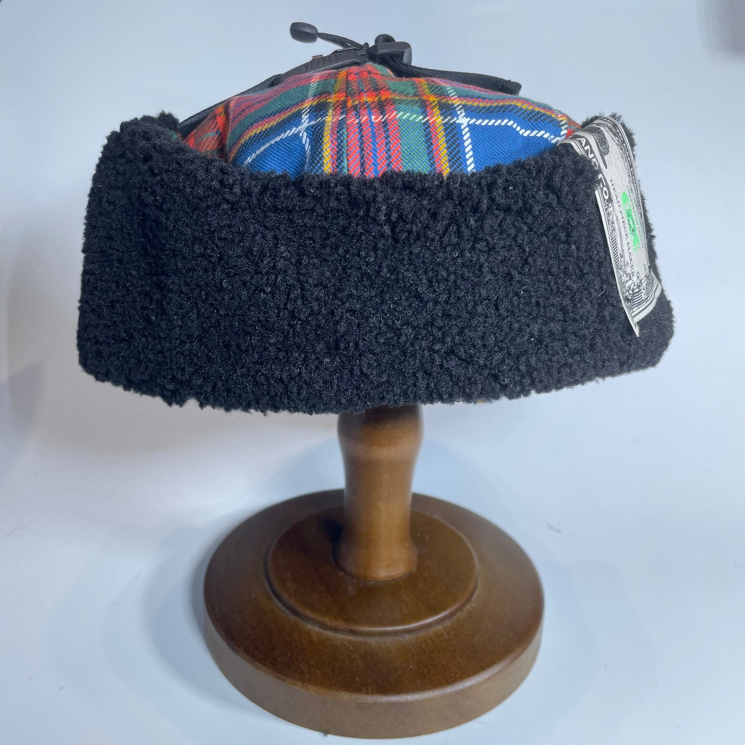 クラシックなタータンチェック柄の生地で仕立てた耳付きファーキャップです。