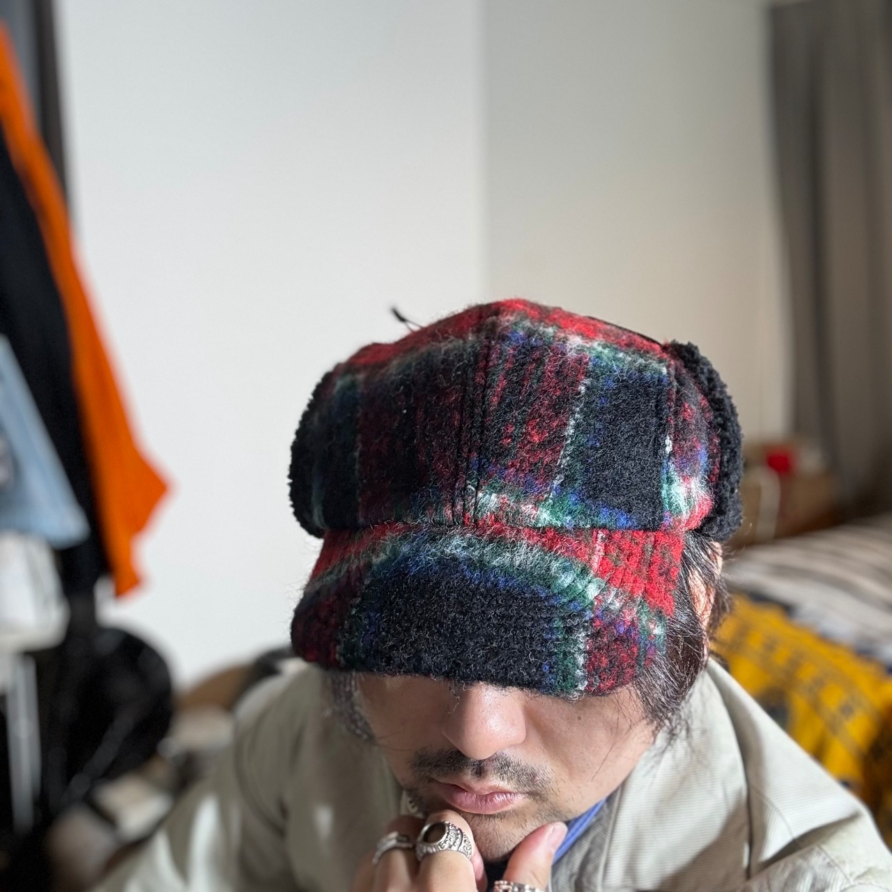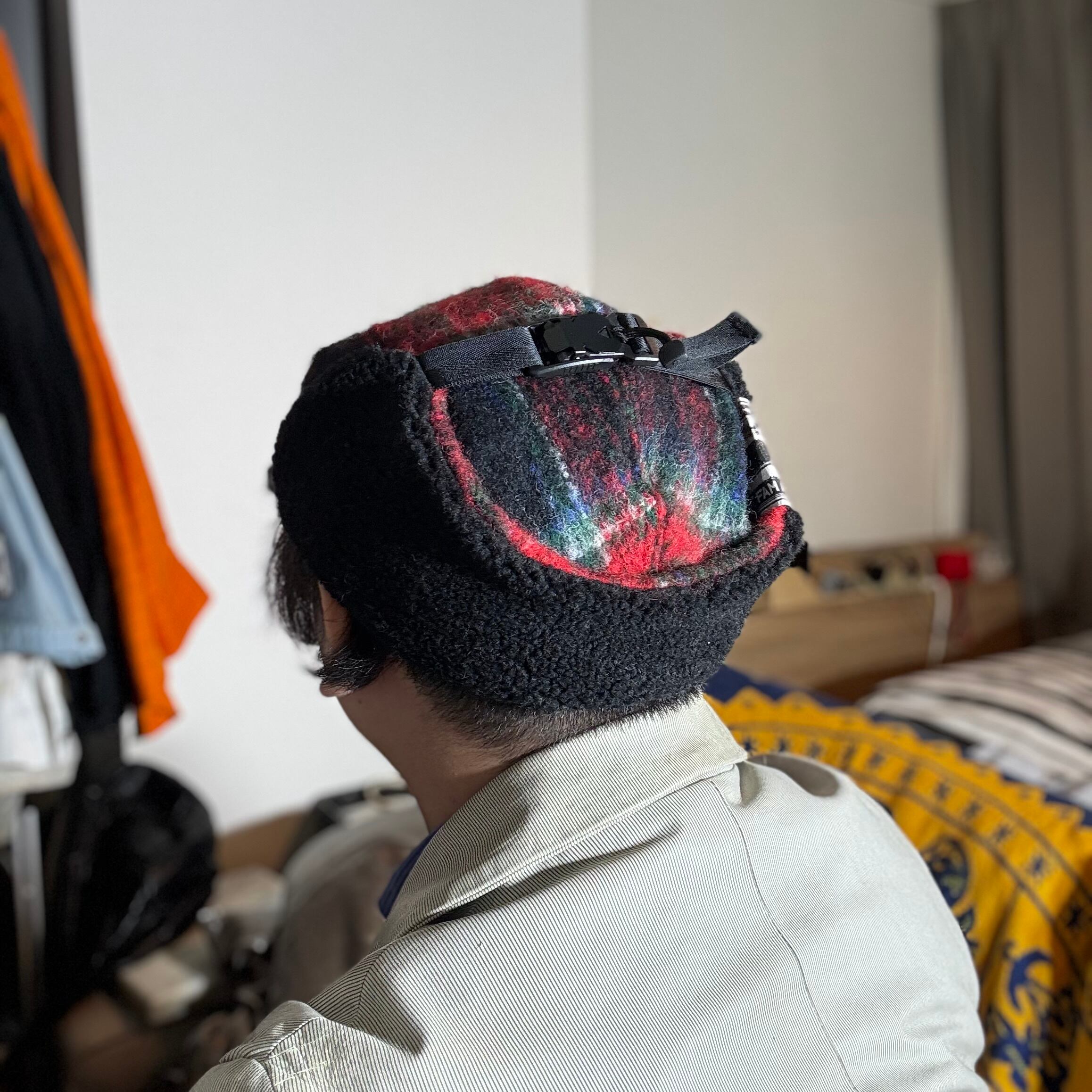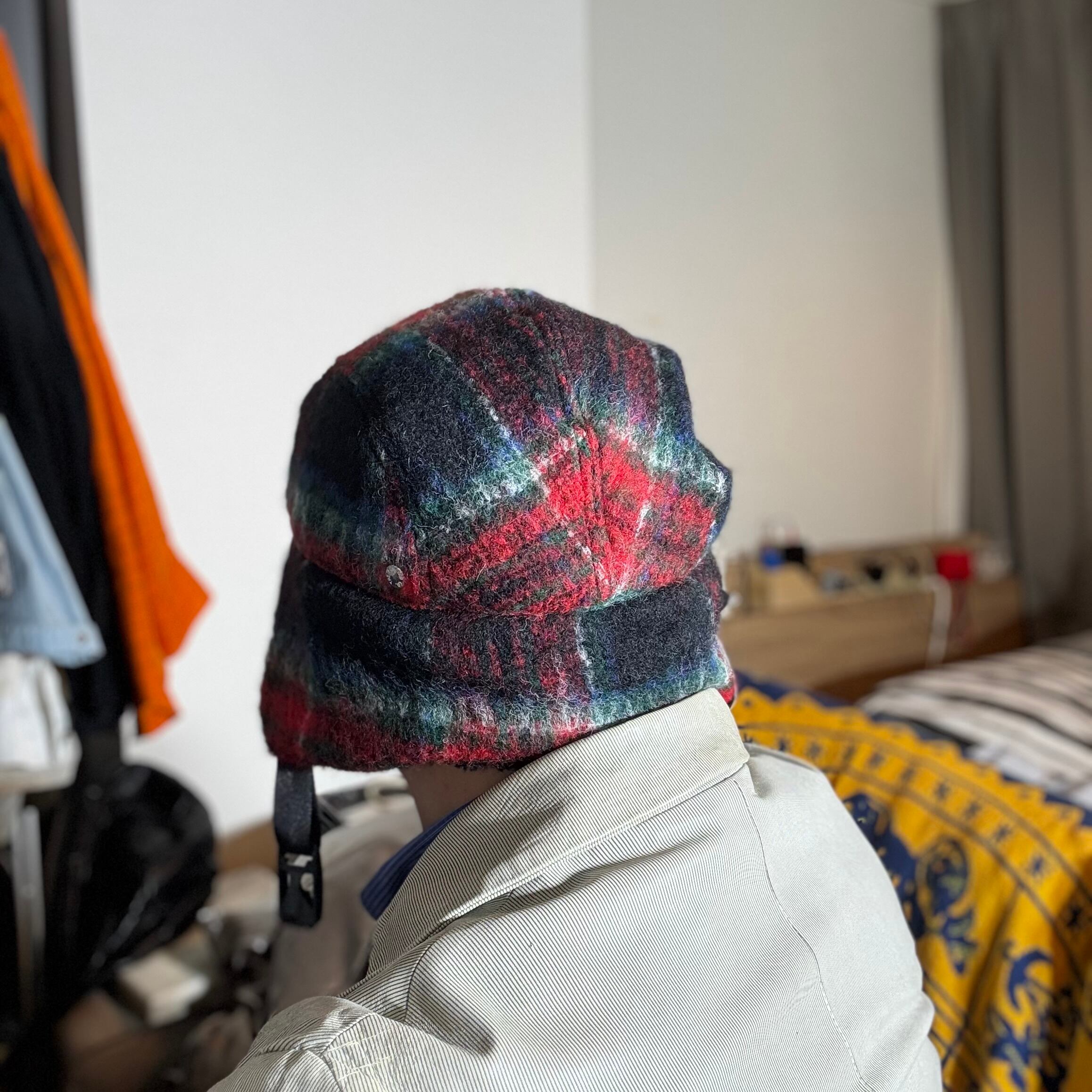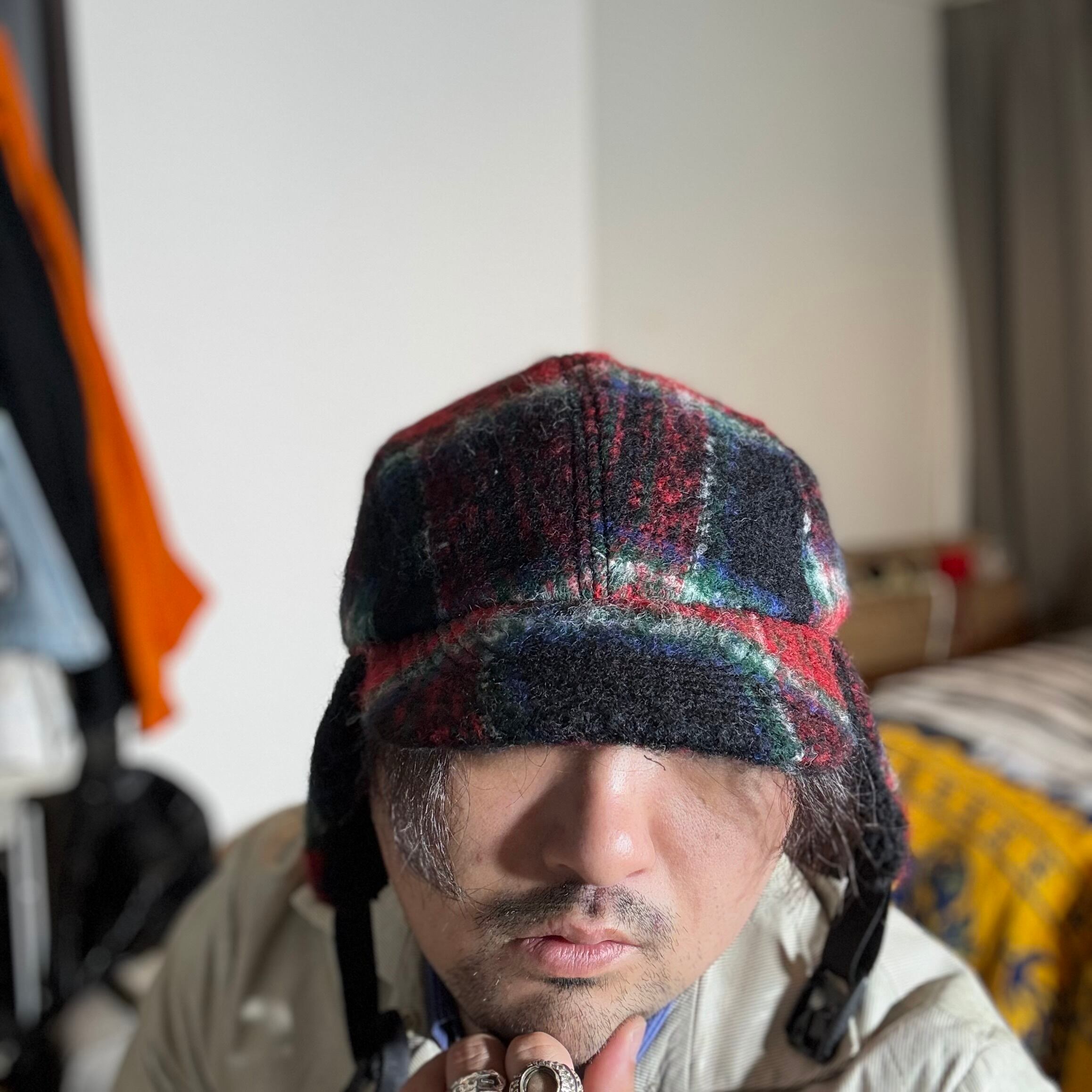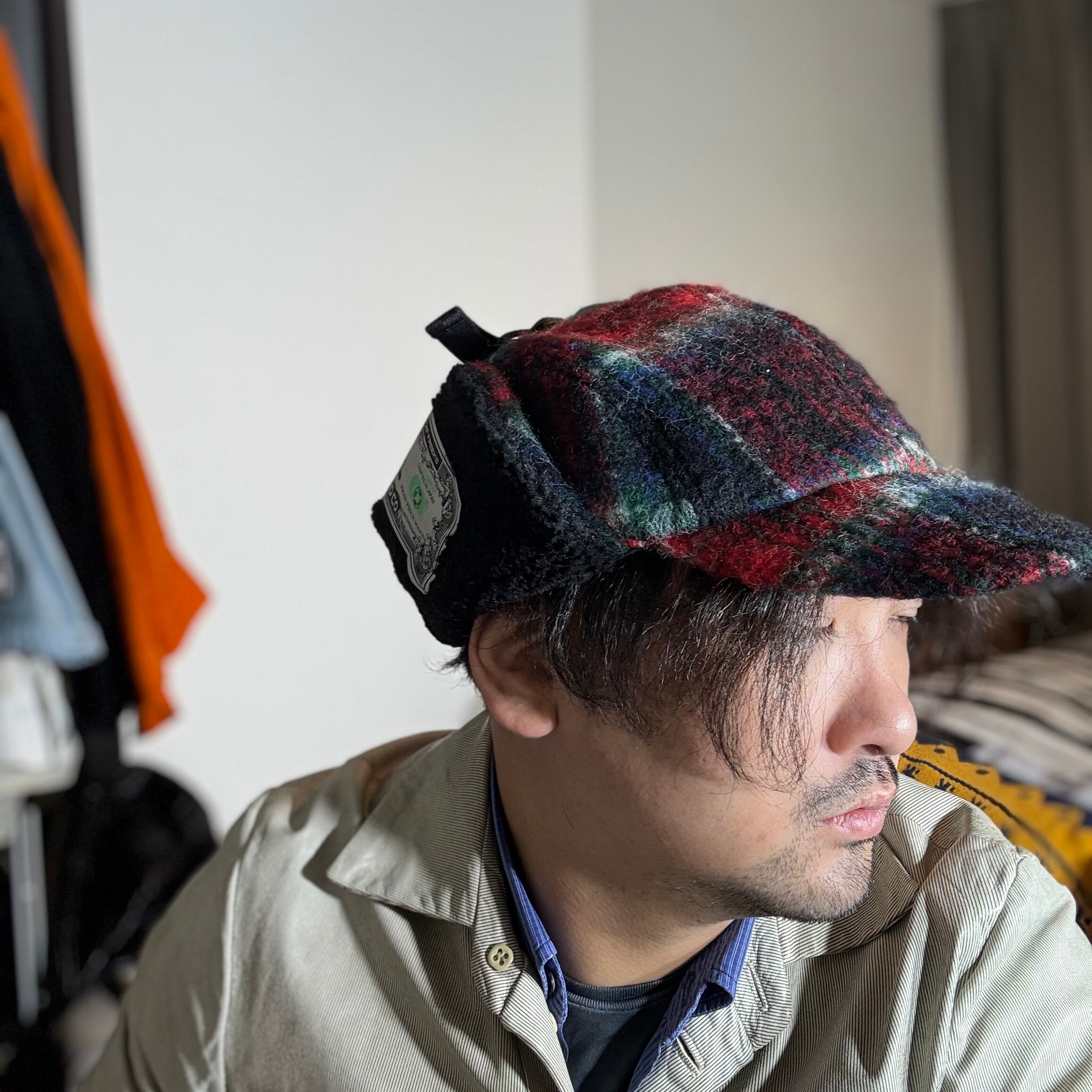 オリジナルのふんわり織られたウールモヘア生地を耳付きのフライトキャップに仕立て上げました。