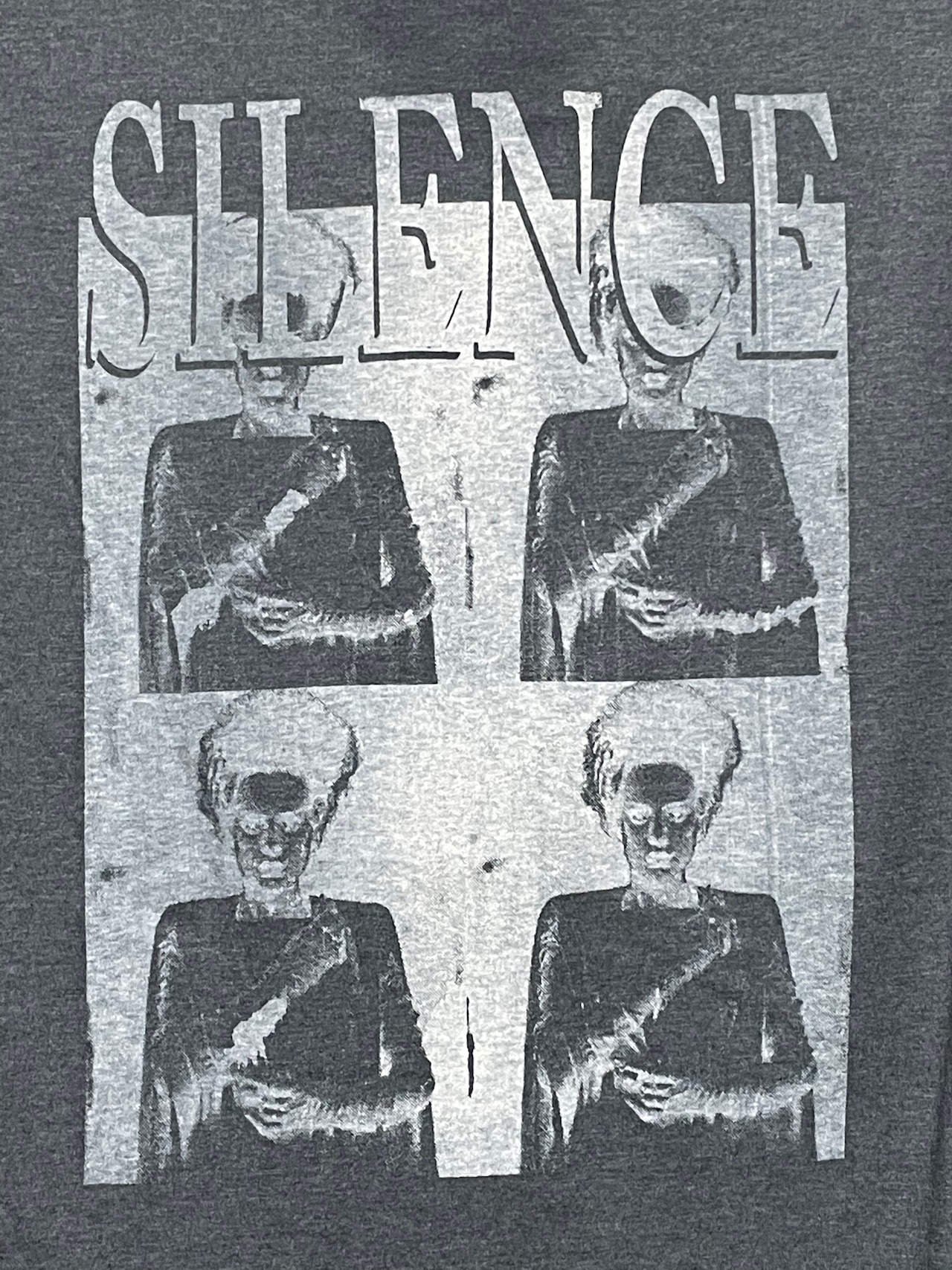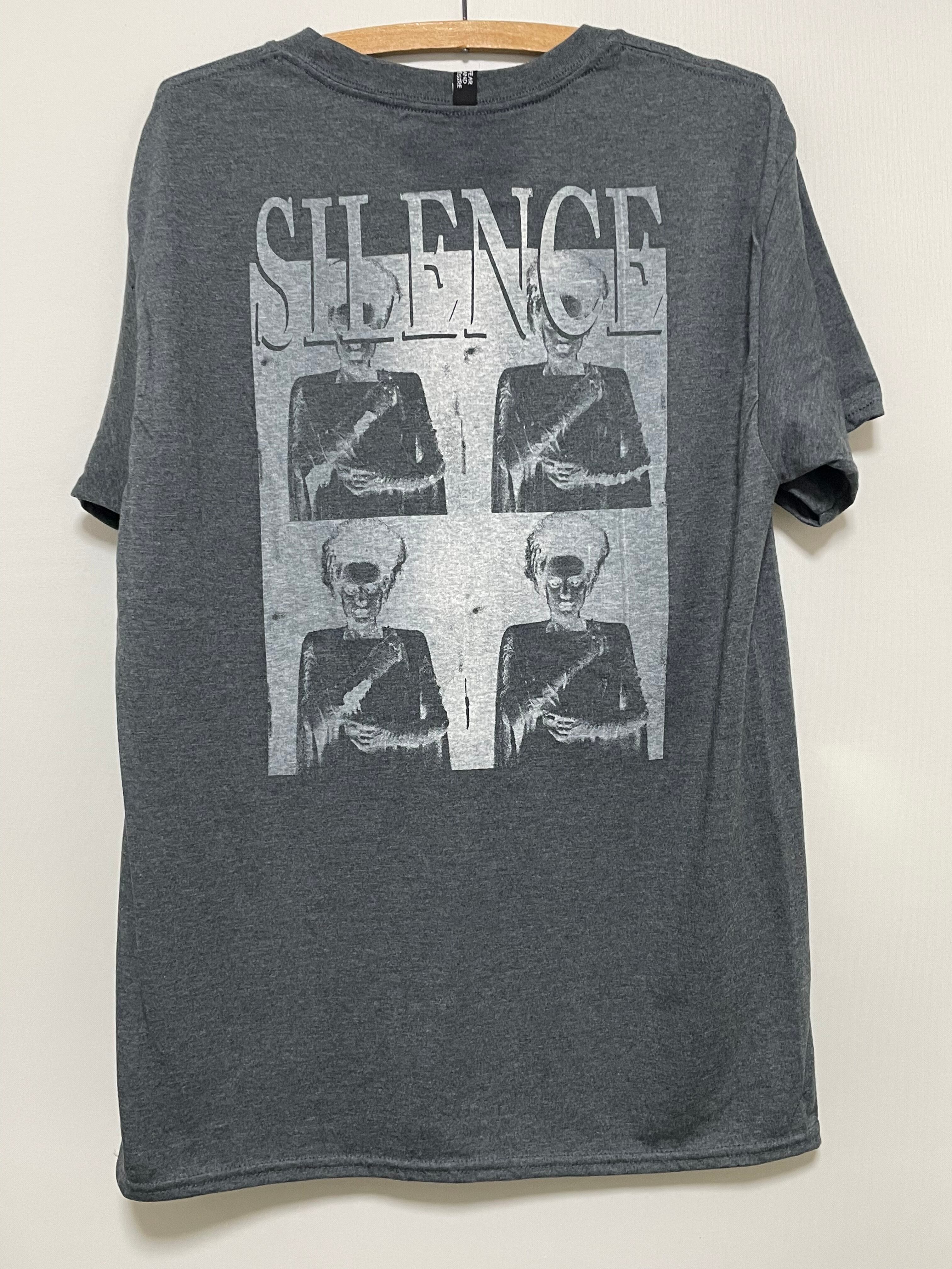 正面には一点を目つめる女性の連続したプリントとsilenceのメッセージがホラー映画の雰囲気を醸し出しています。