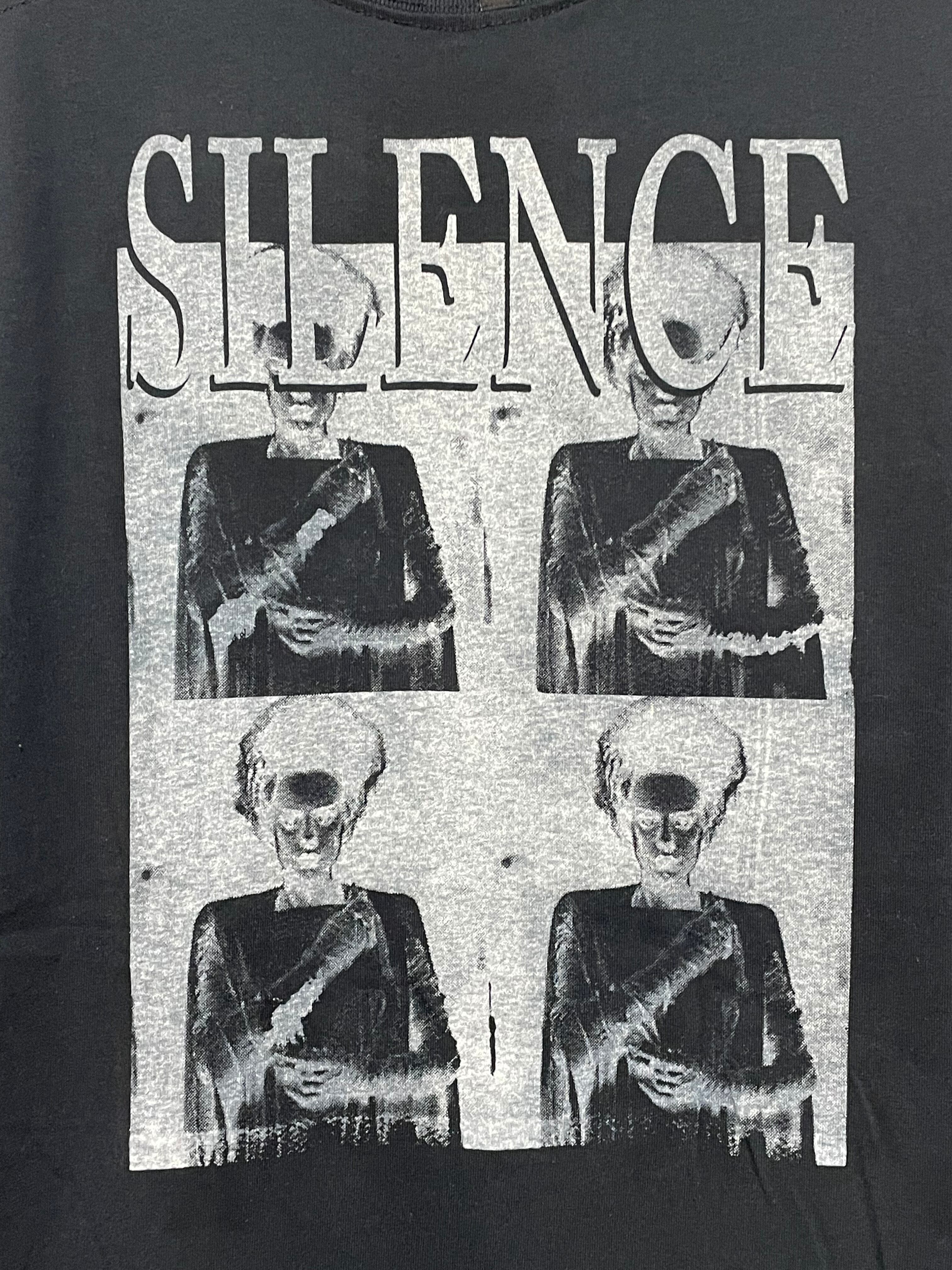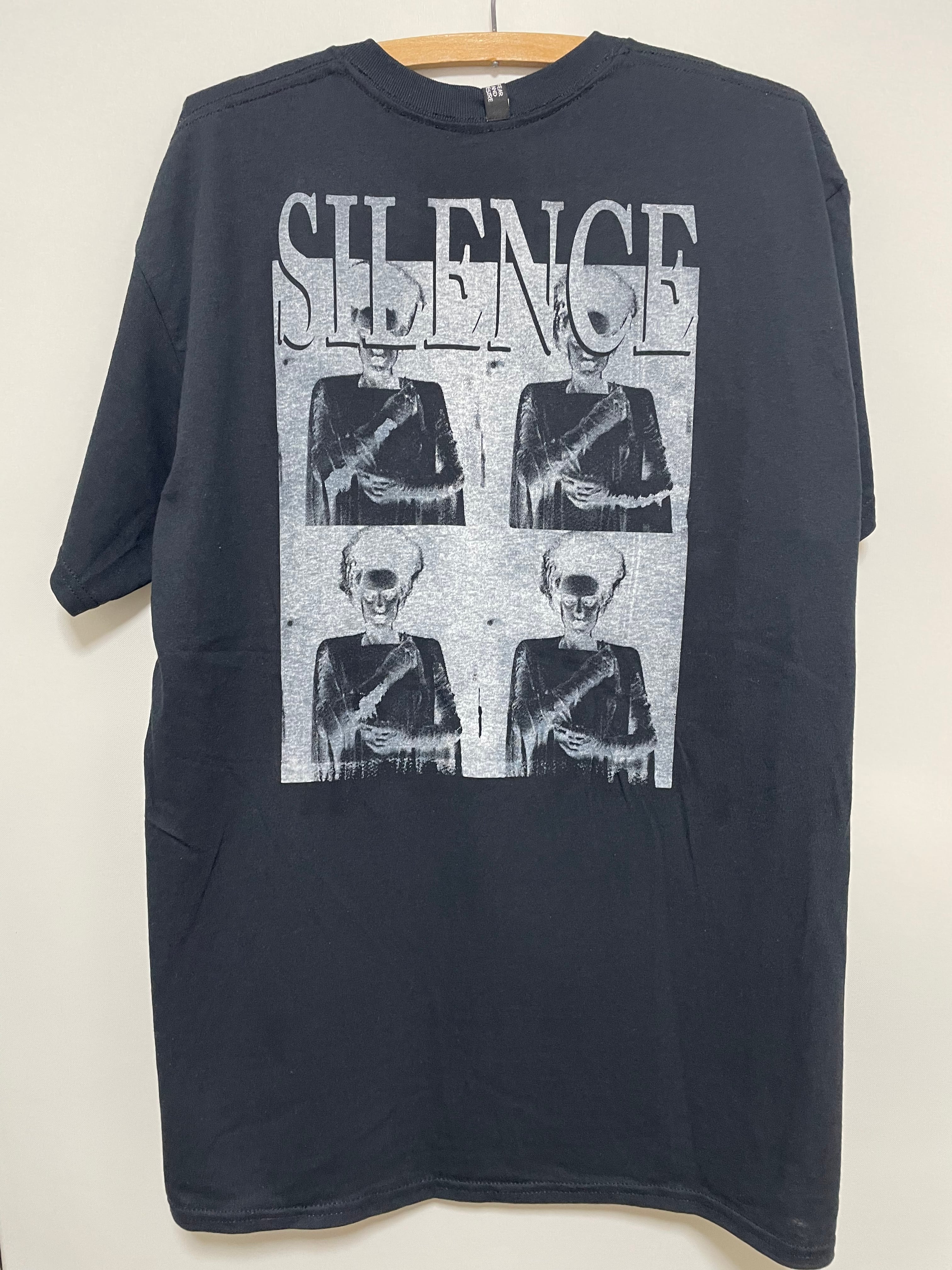 正面には一点を目つめる女性の連続したプリントとsilenceのメッセージがホラー映画の雰囲気を醸し出しています。