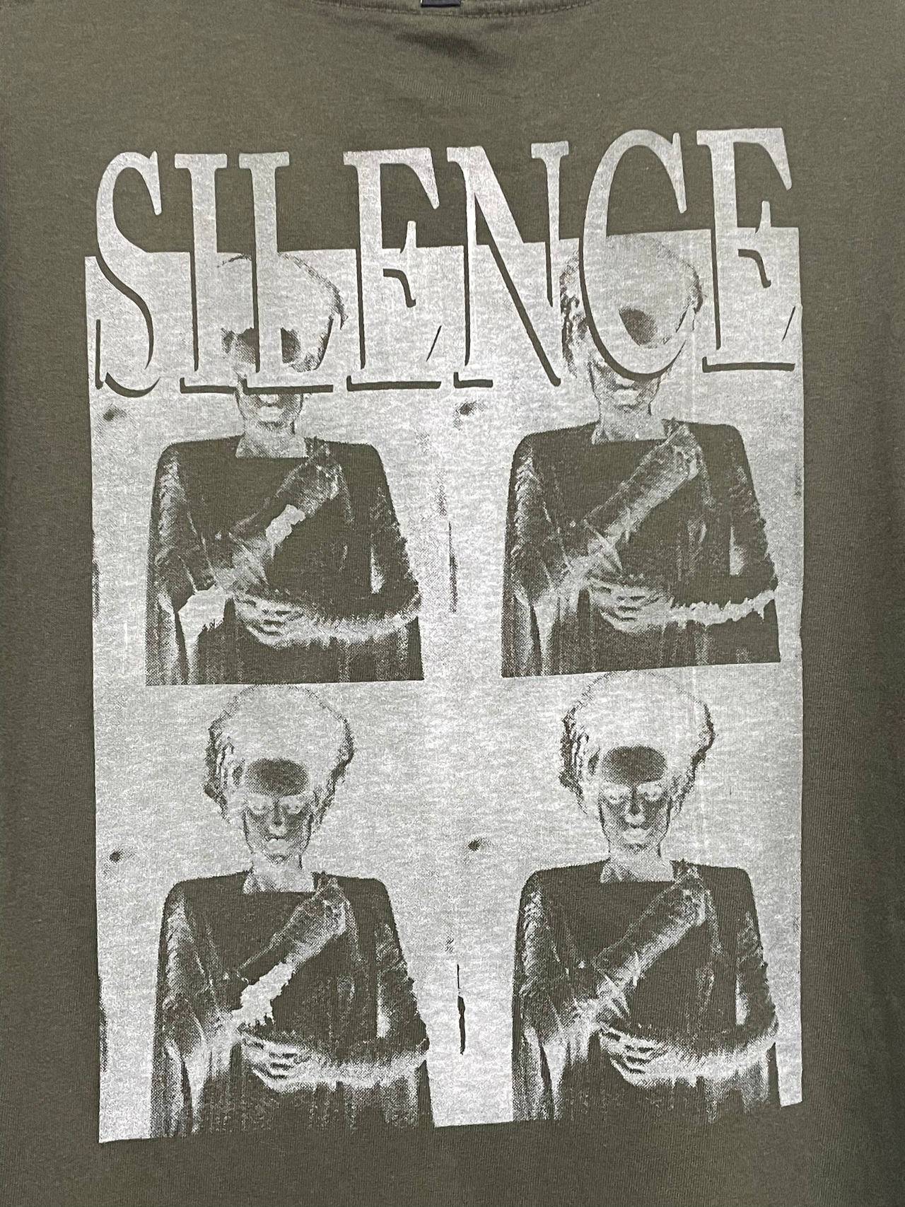 正面には一点を目つめる女性の連続したプリントとsilenceのメッセージがホラー映画の雰囲気を醸し出しています。