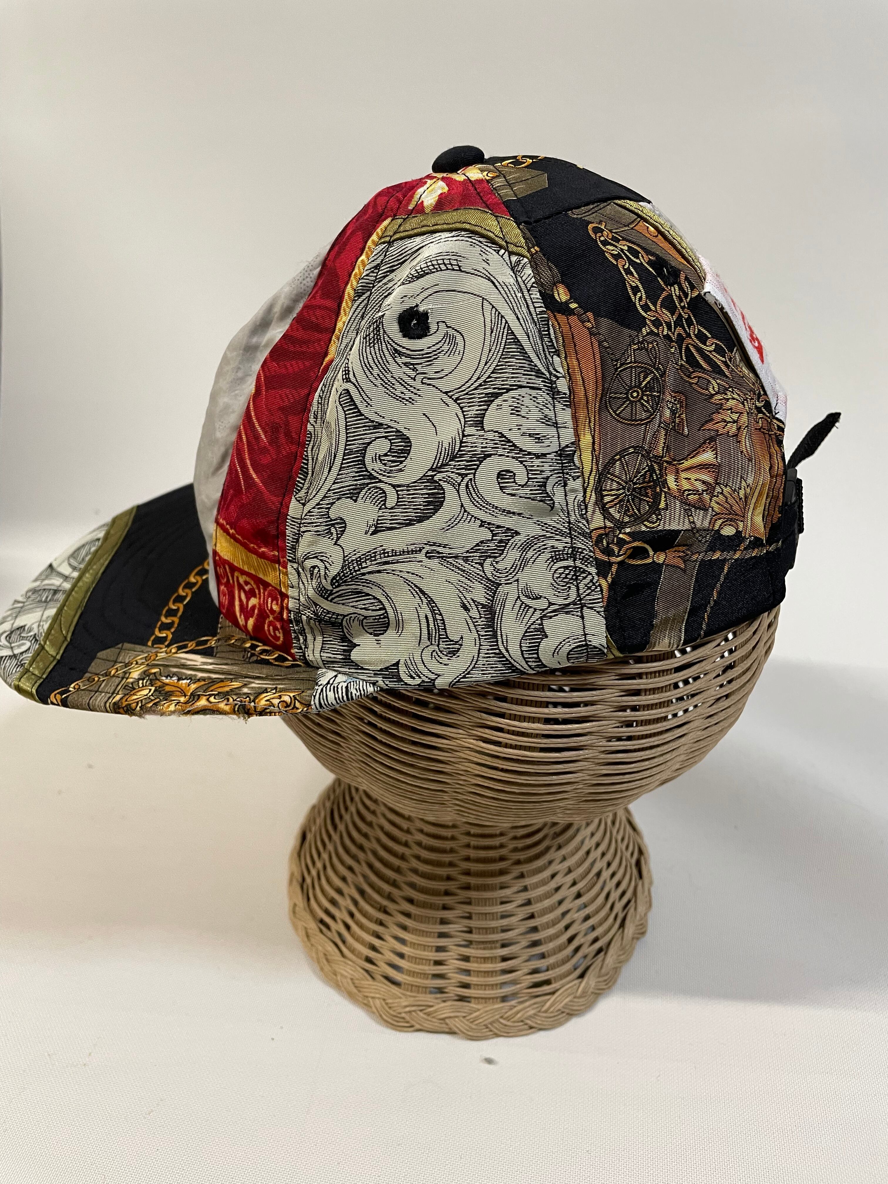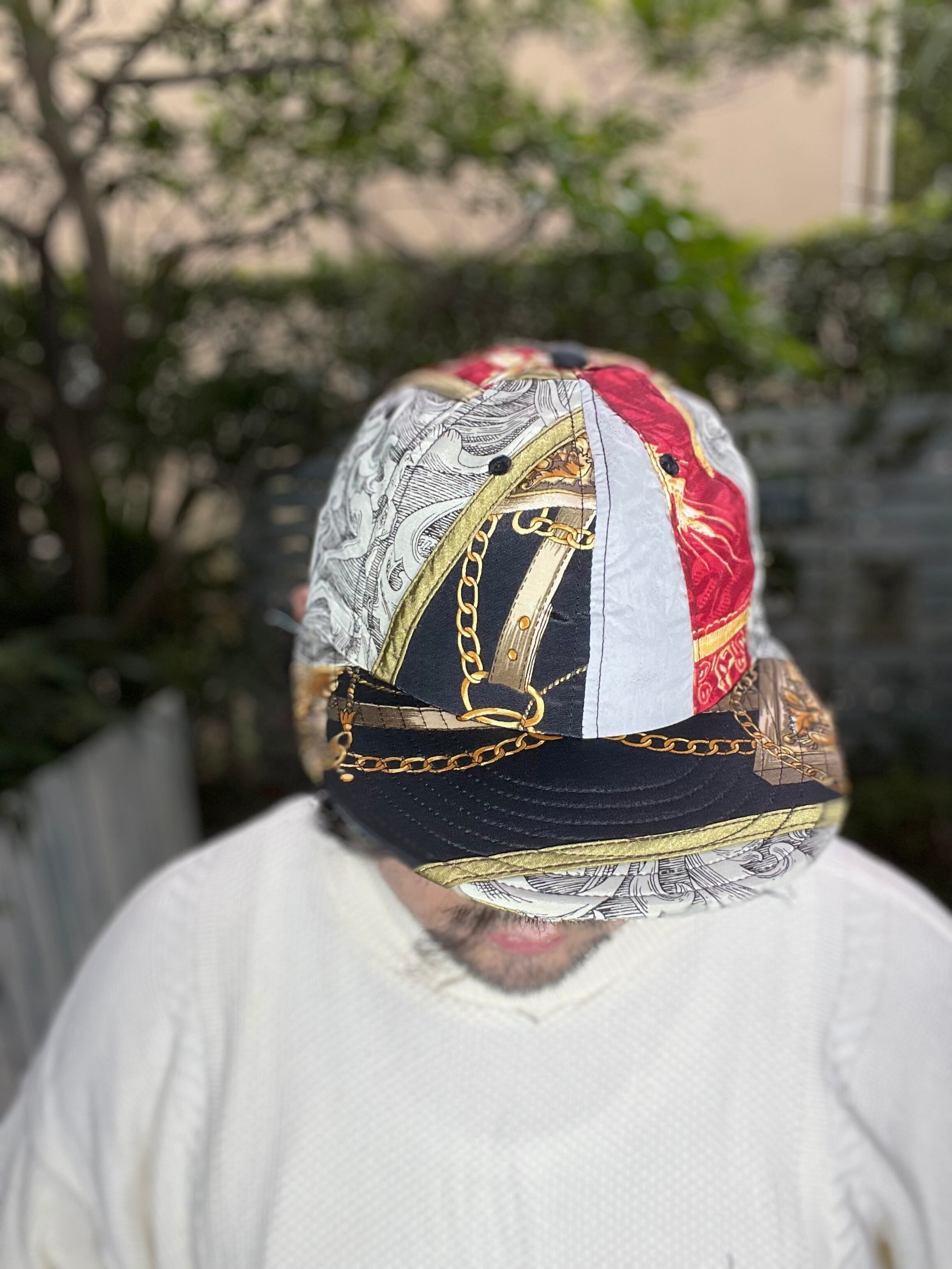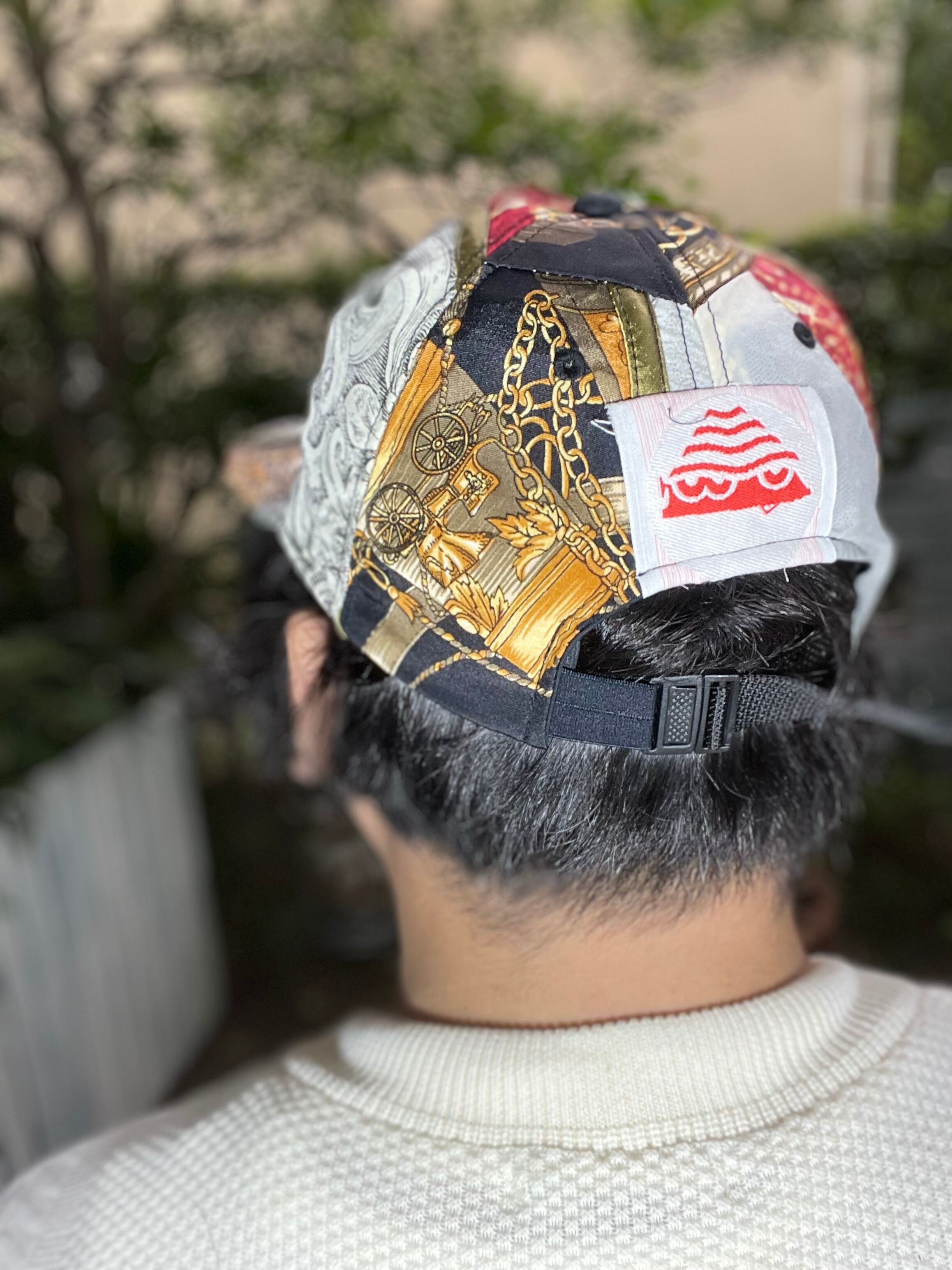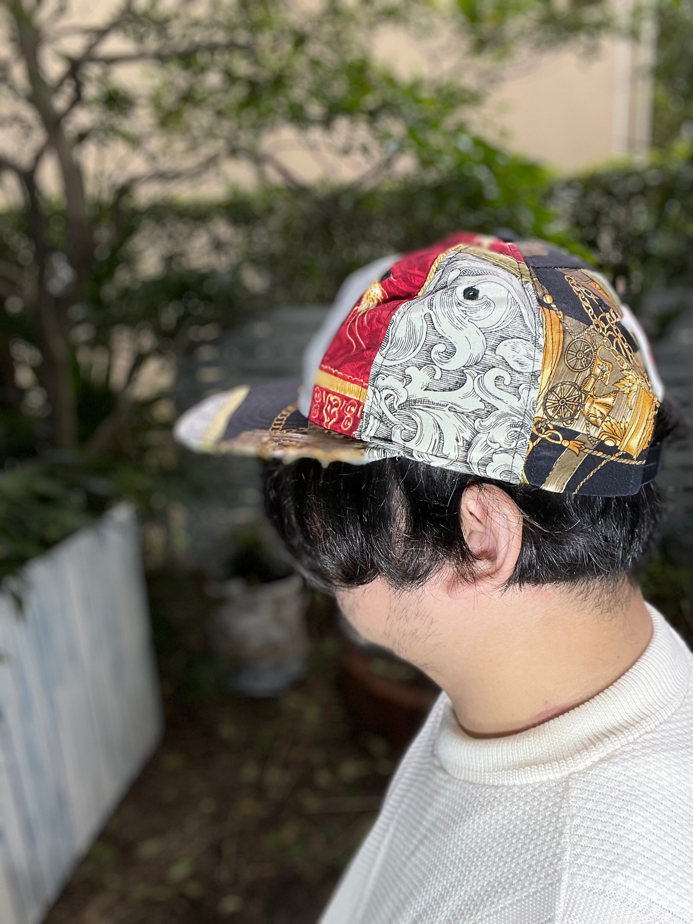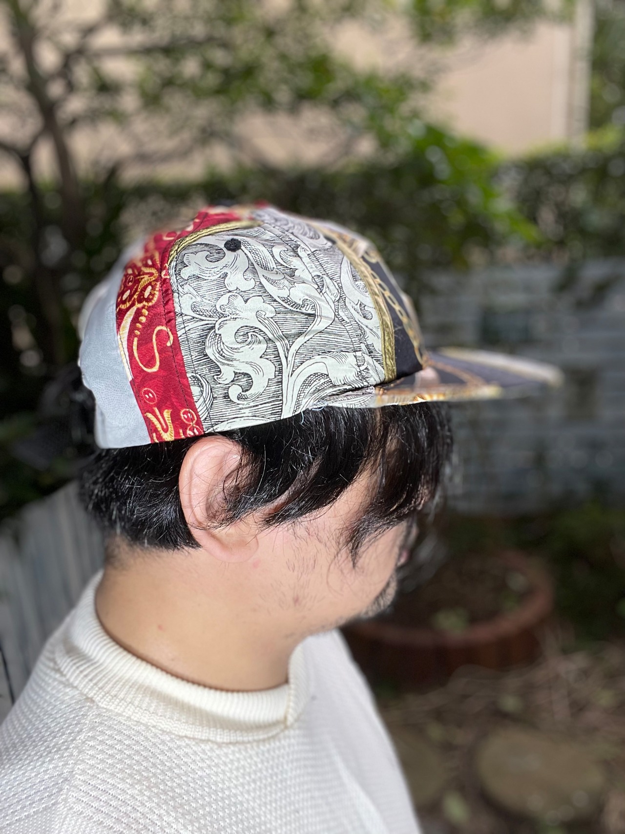 古着のレトロ柄ブルゾンを解体して平ツバのキャップに仕立てました。