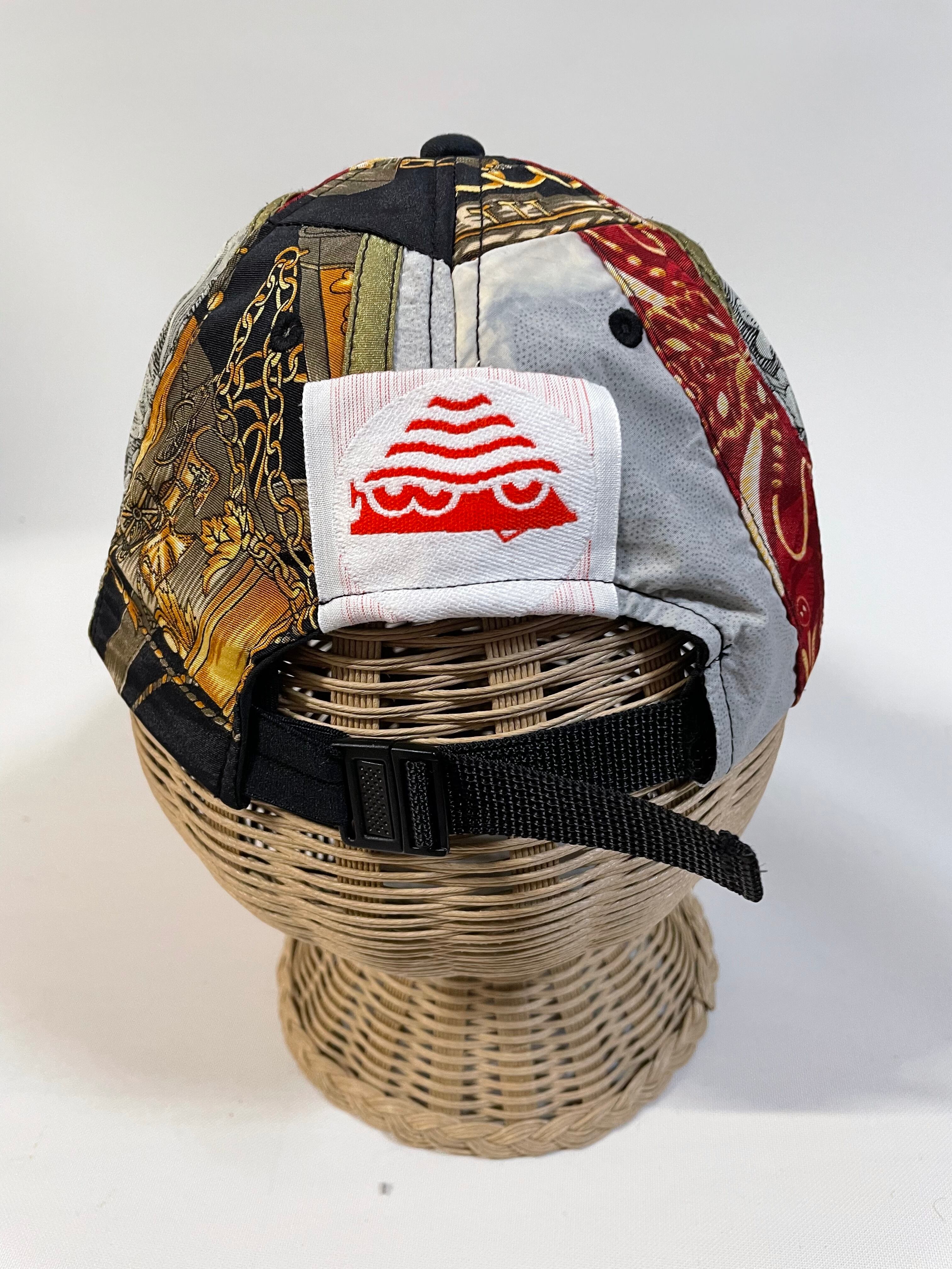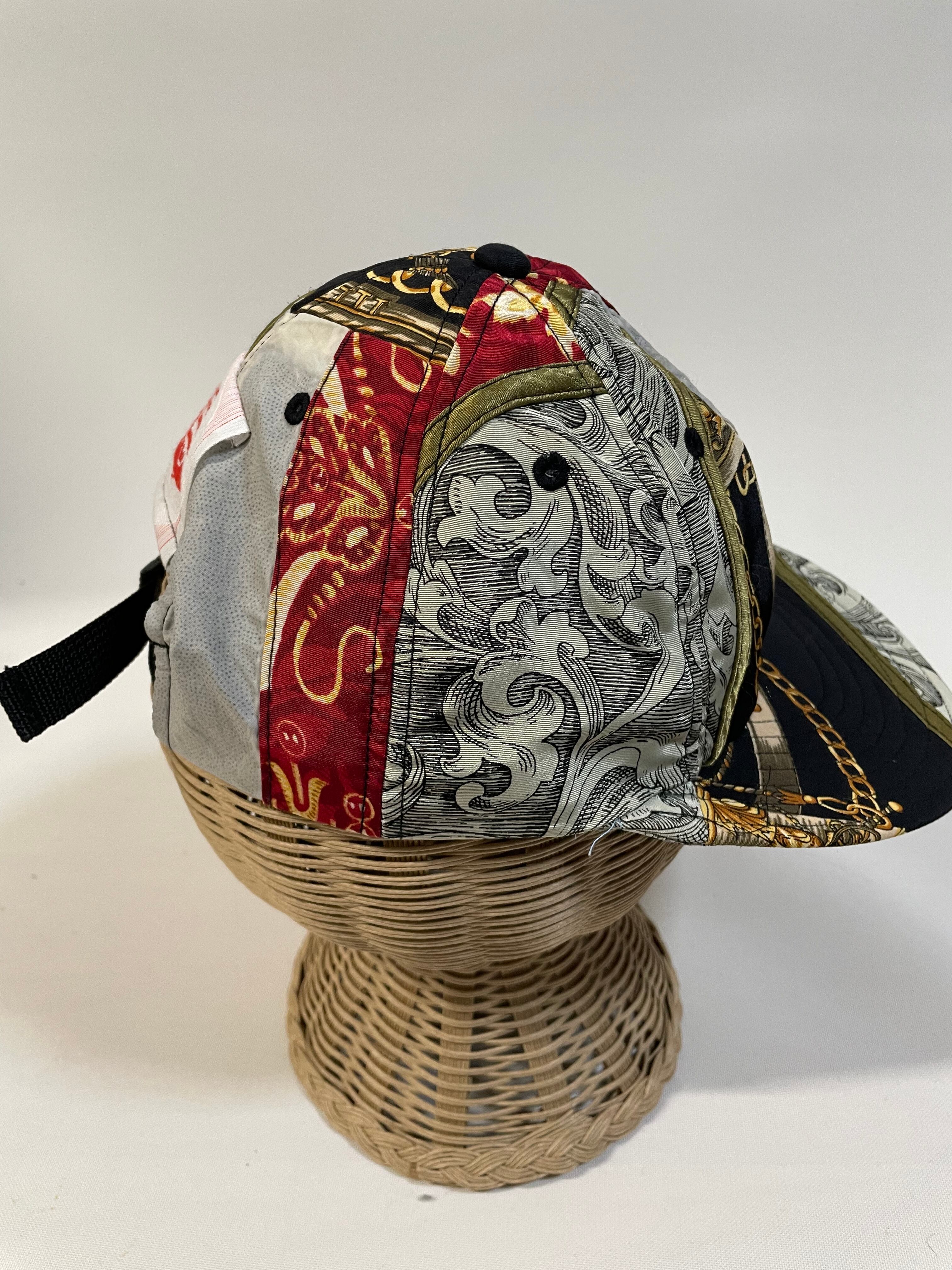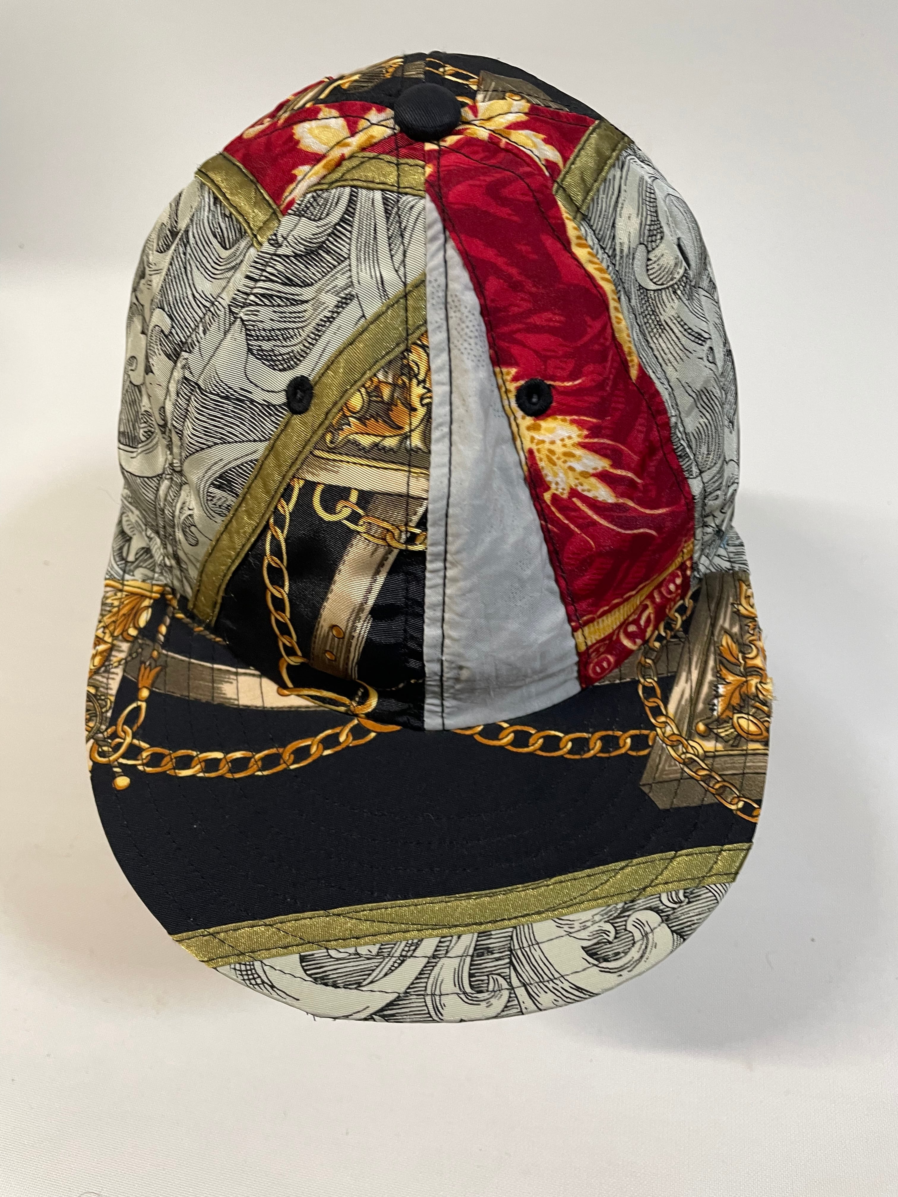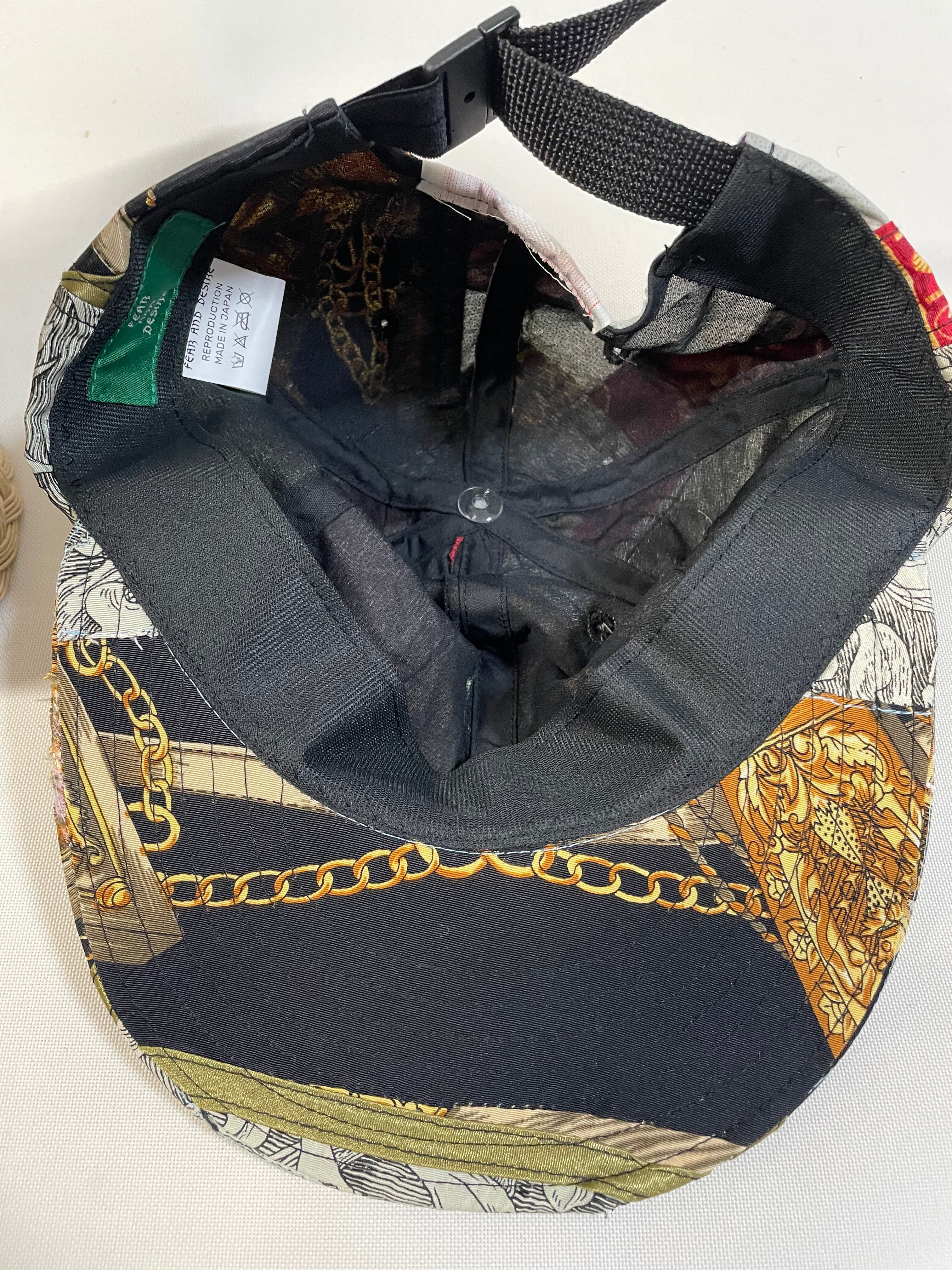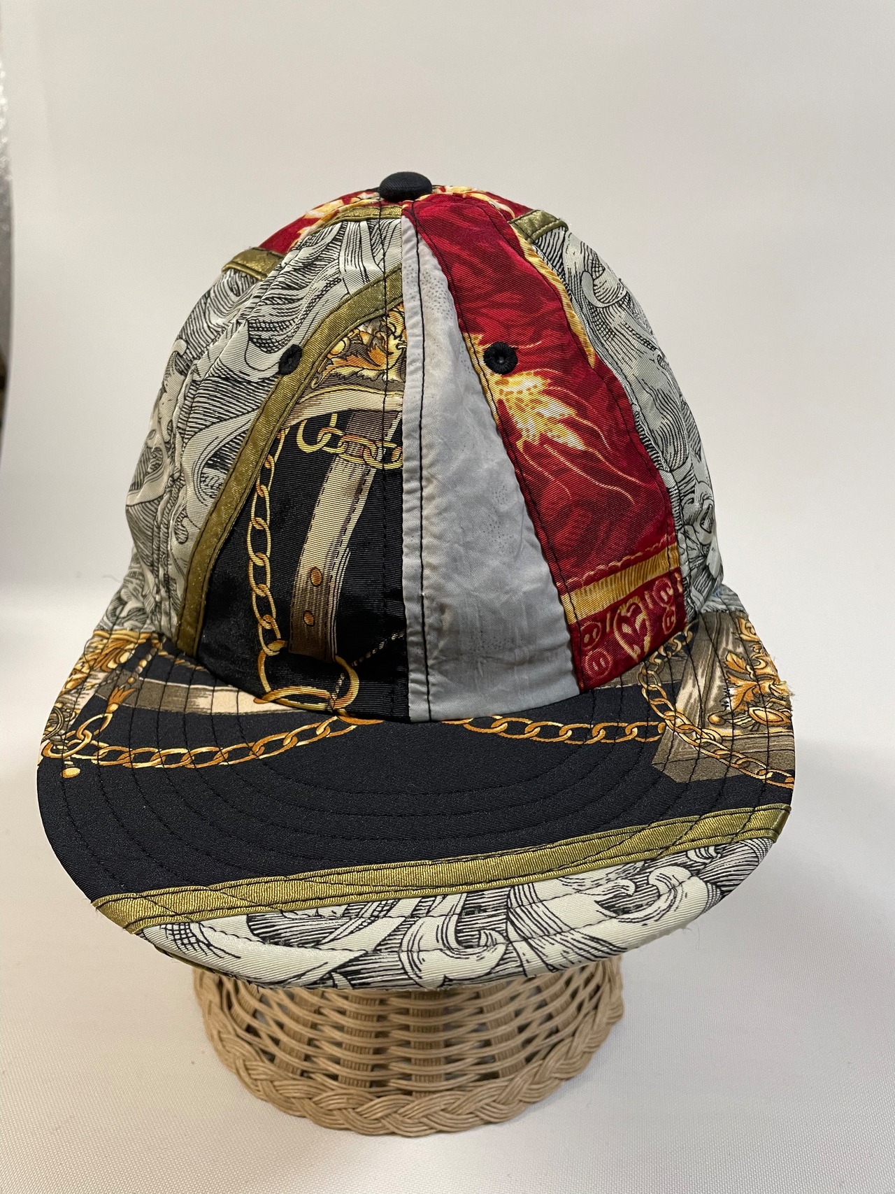 古着のレトロ柄ブルゾンを解体して平ツバのキャップに仕立てました。