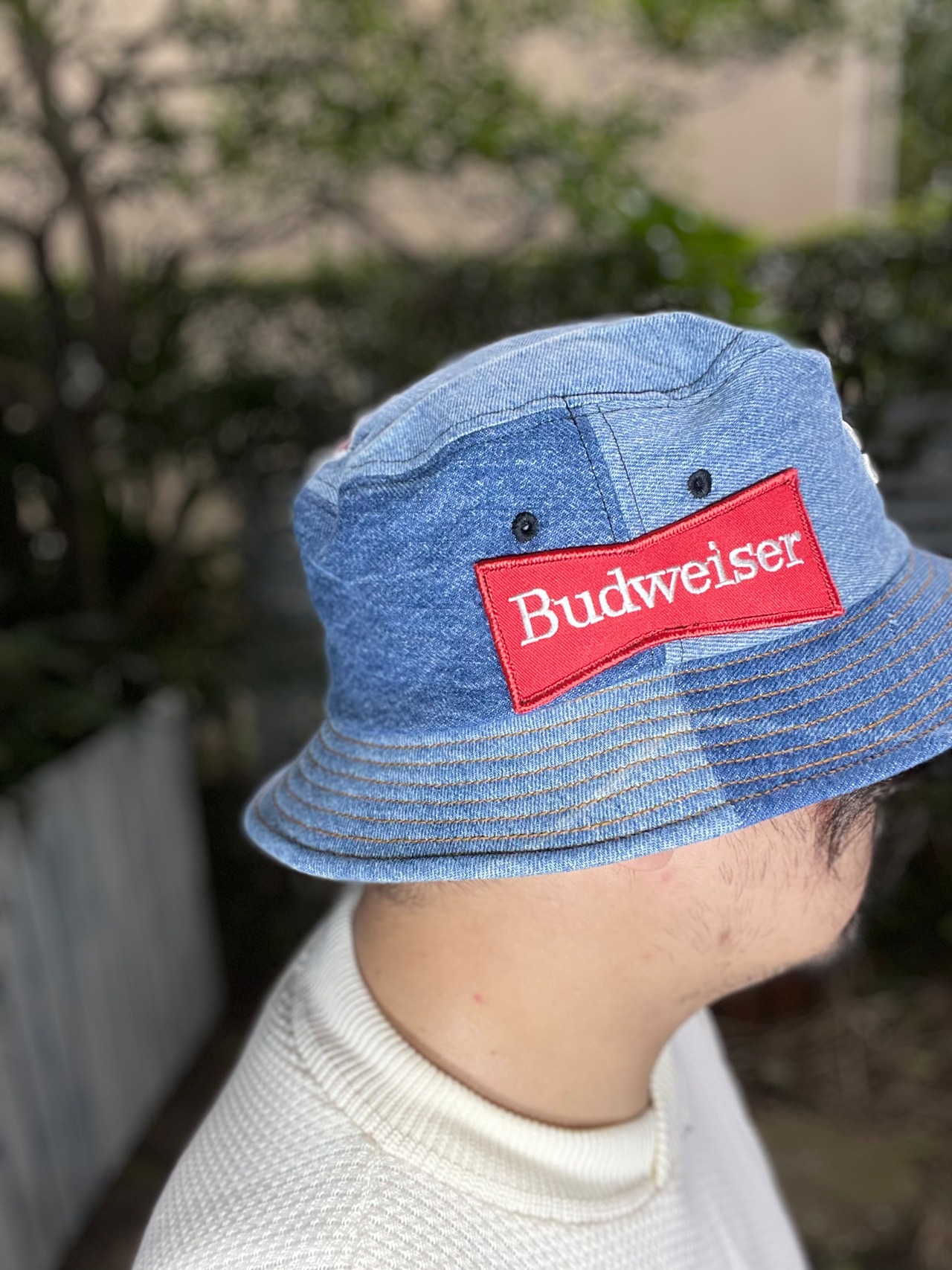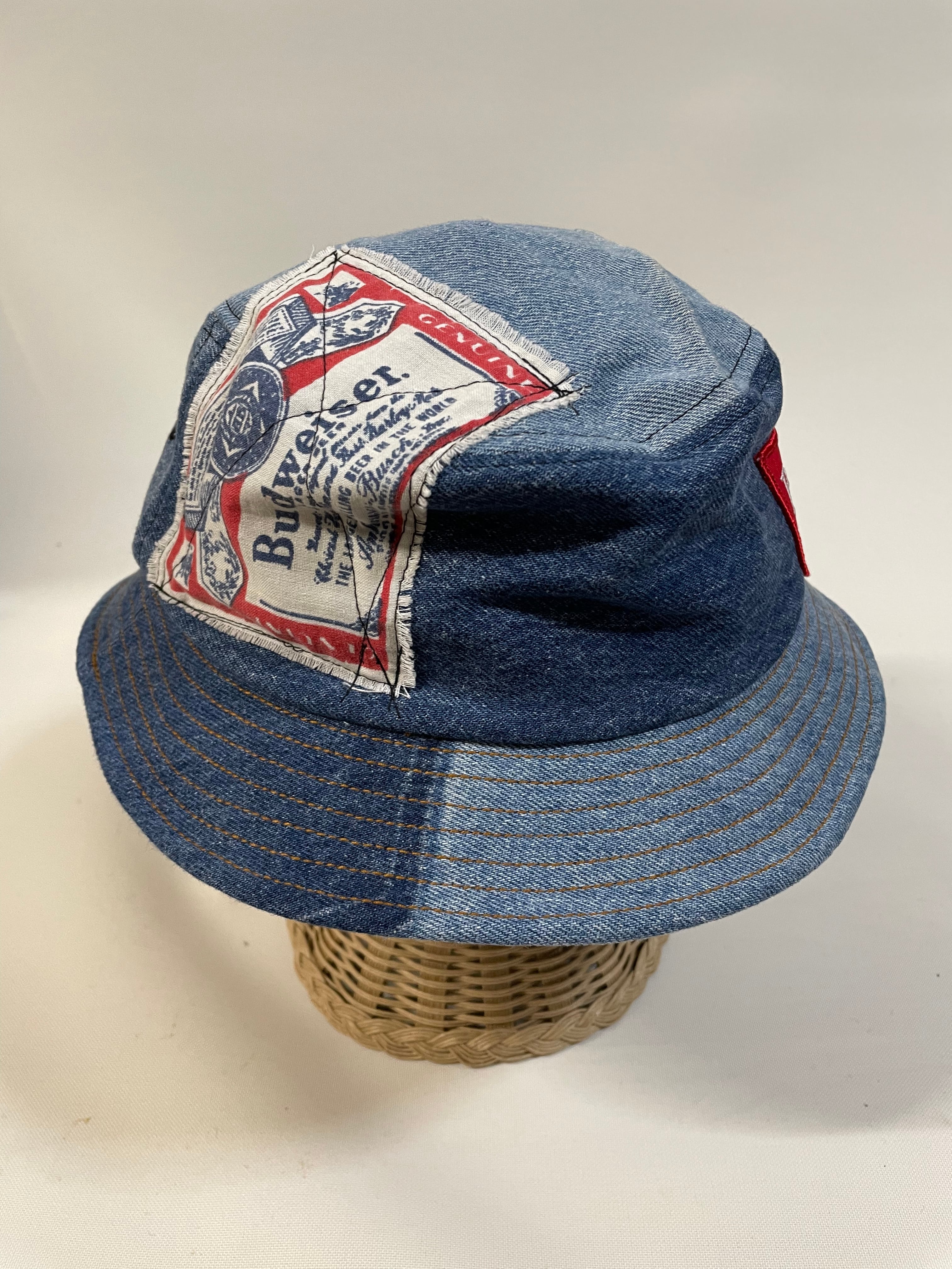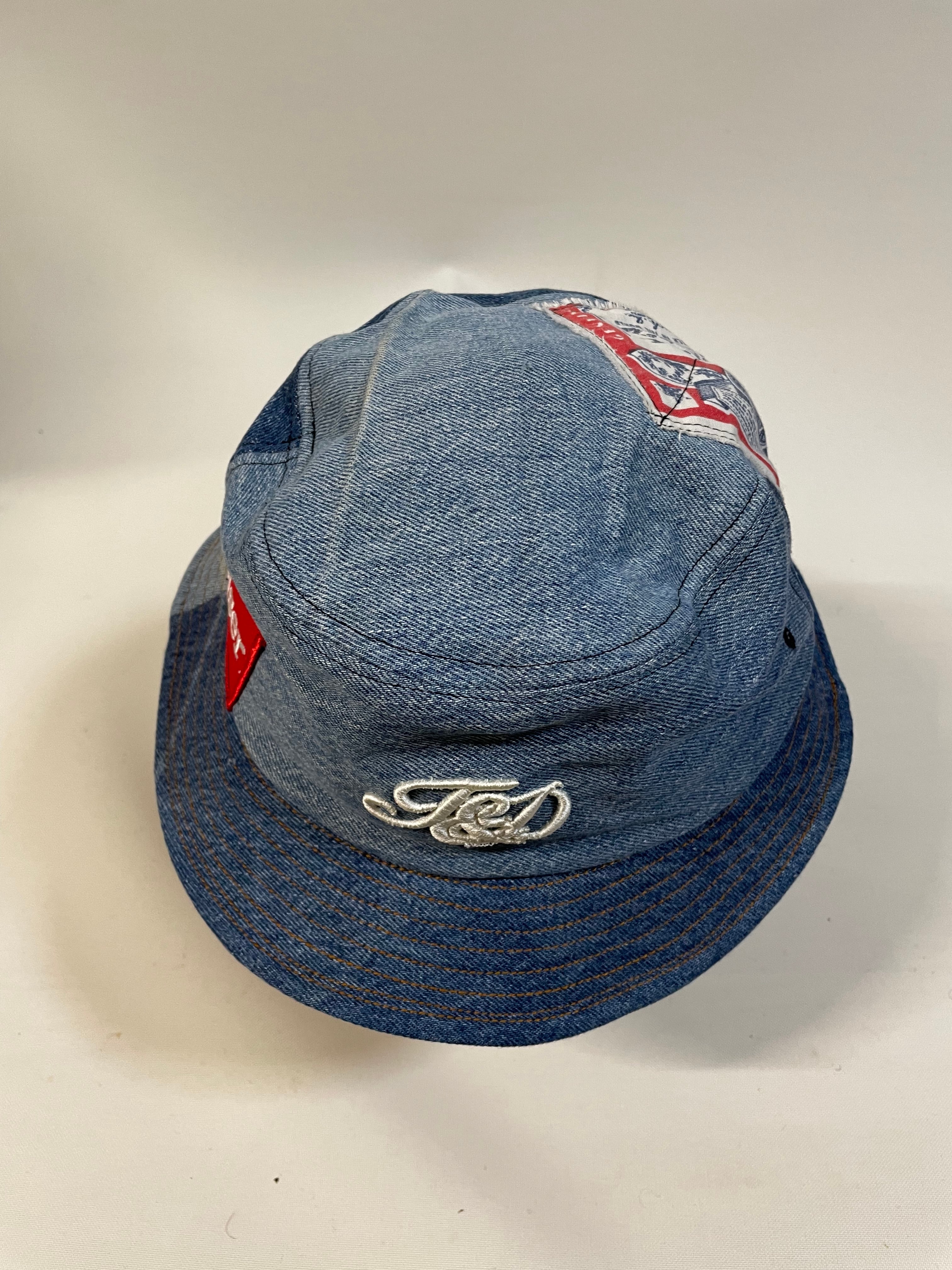古着のデニムパンツを解体してバケットハットに仕立てました。