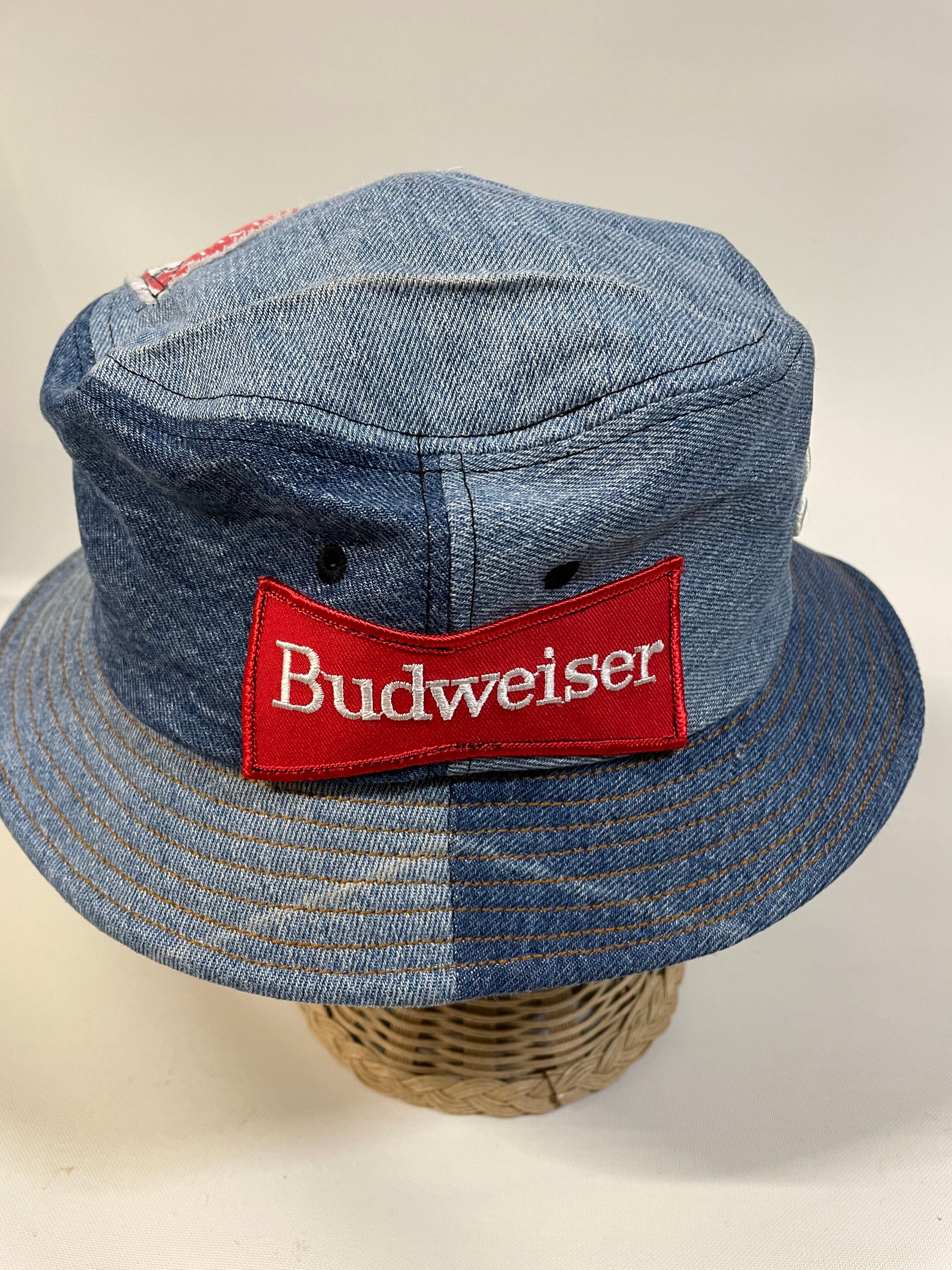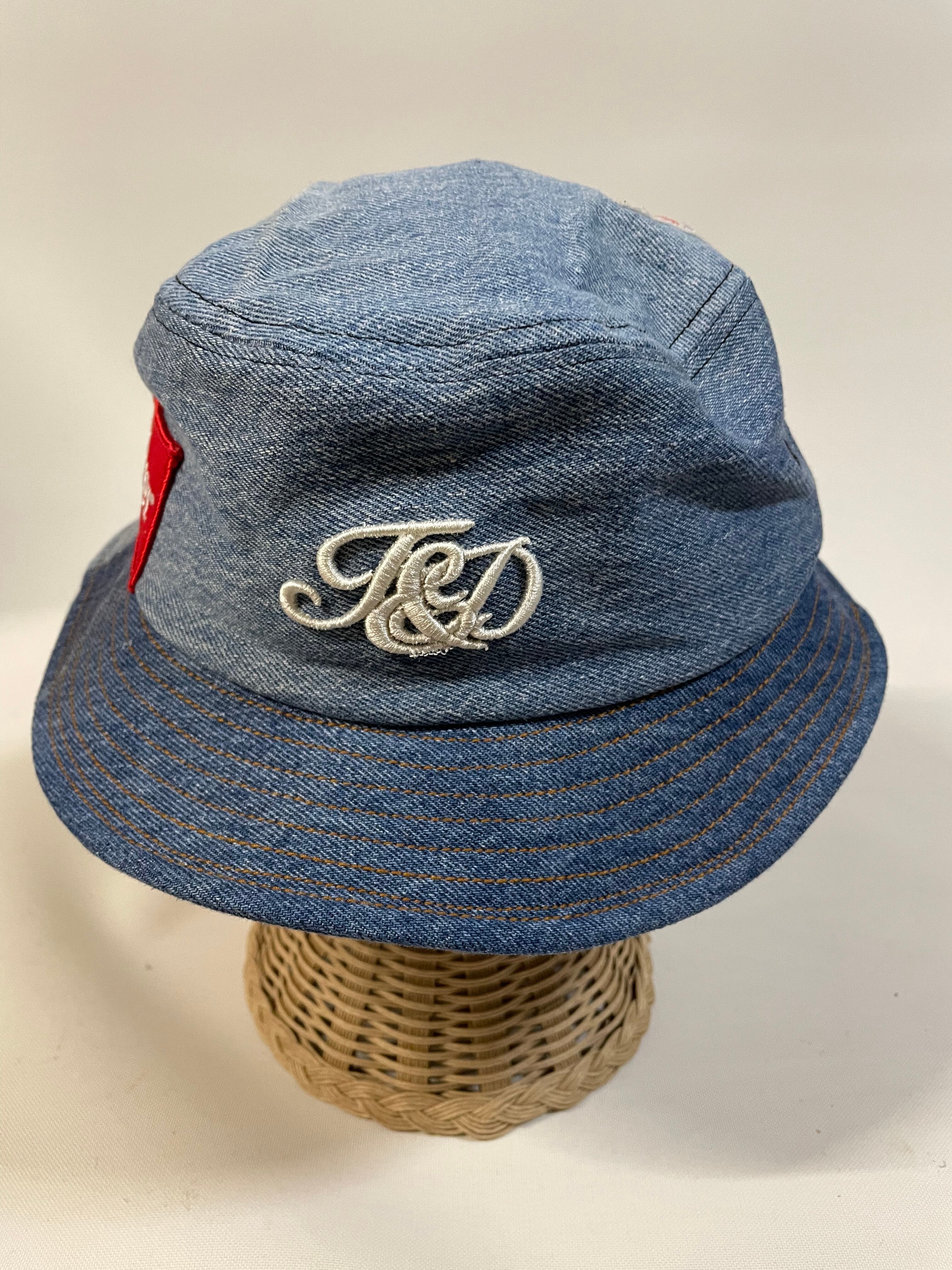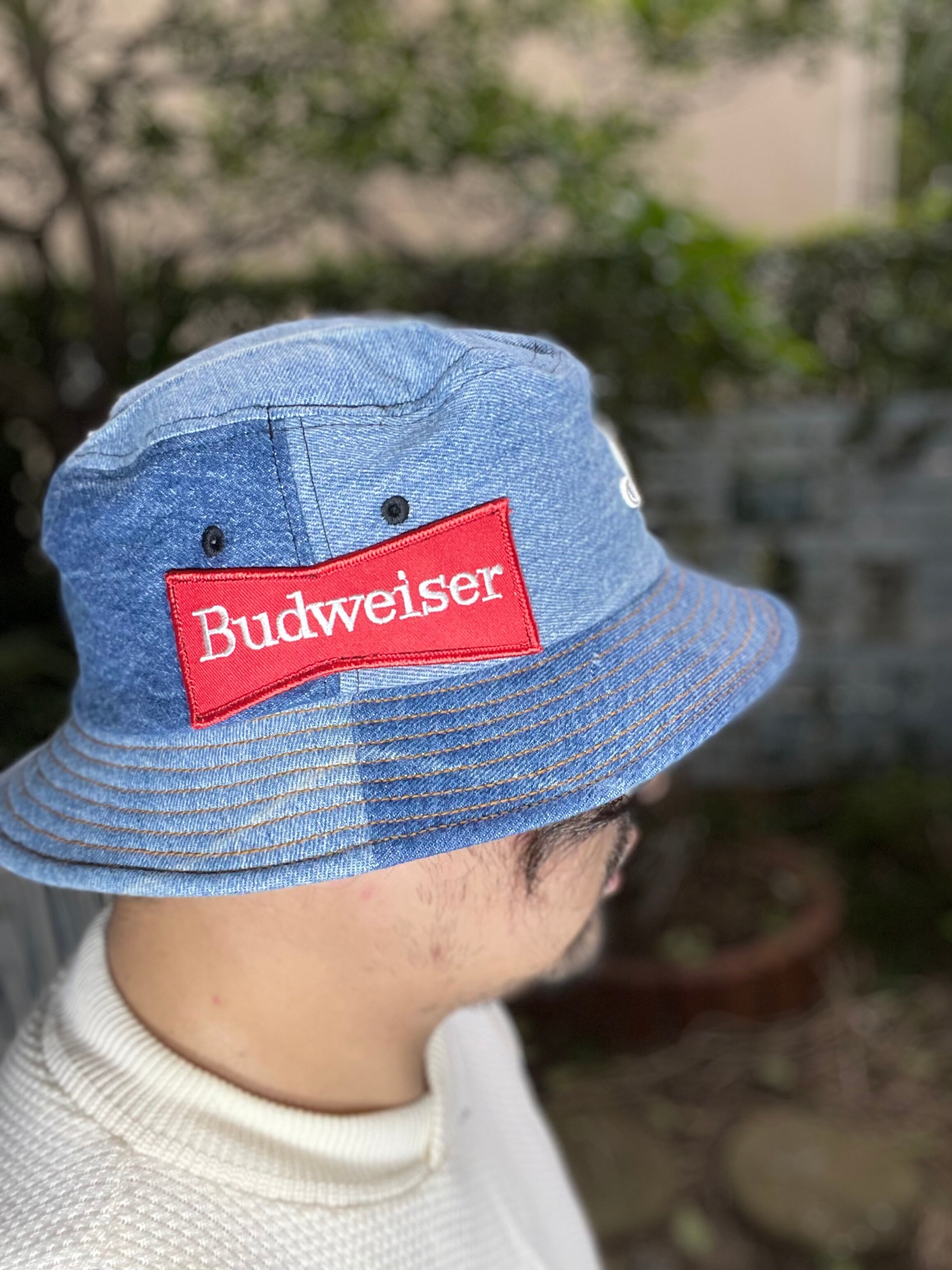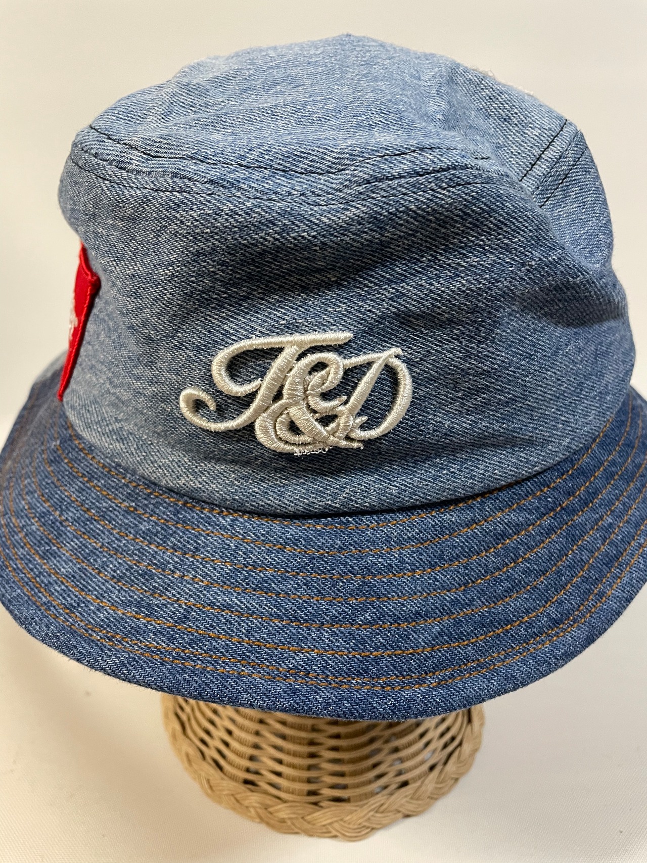 古着のデニムパンツを解体してバケットハットに仕立てました。