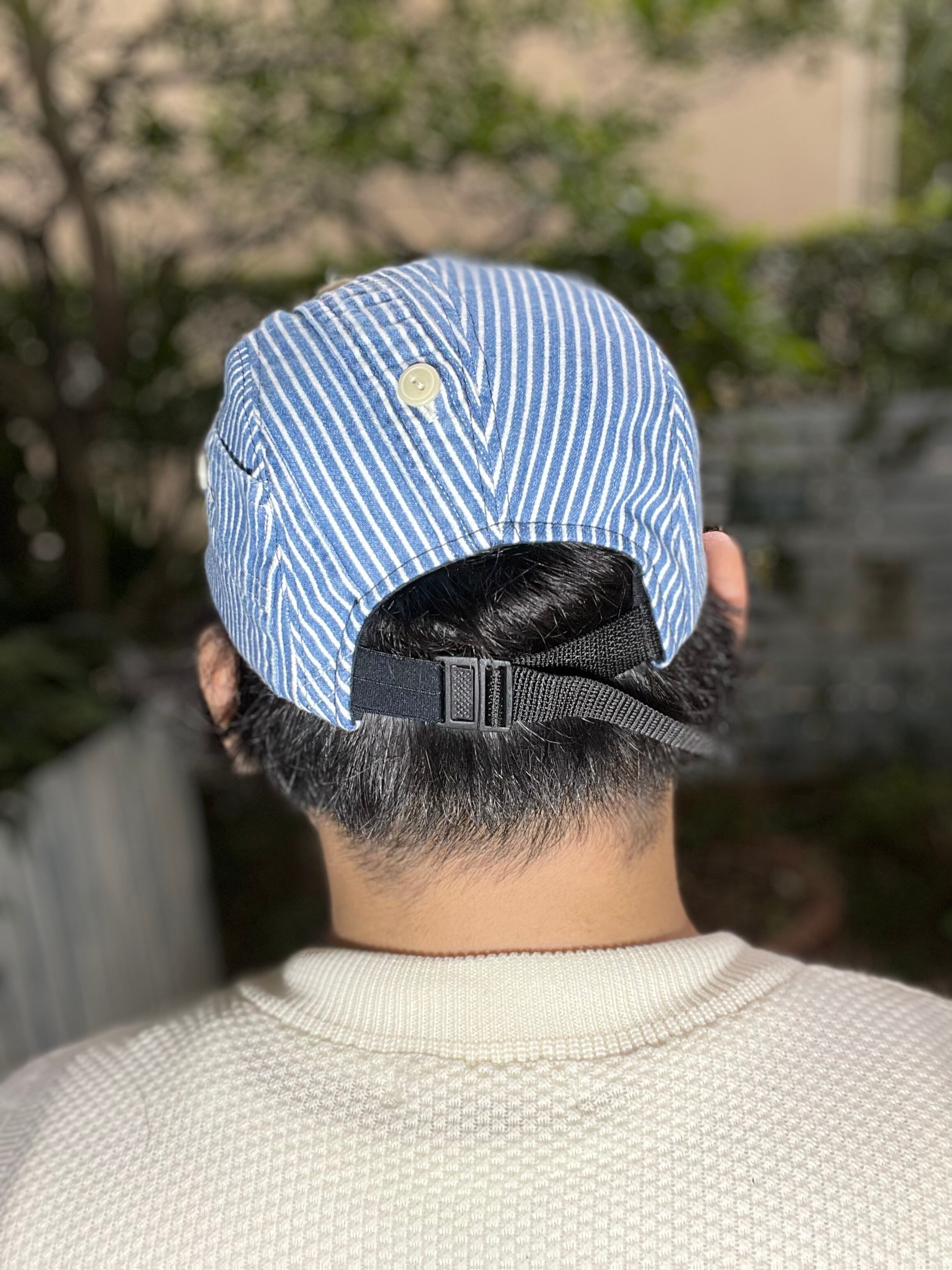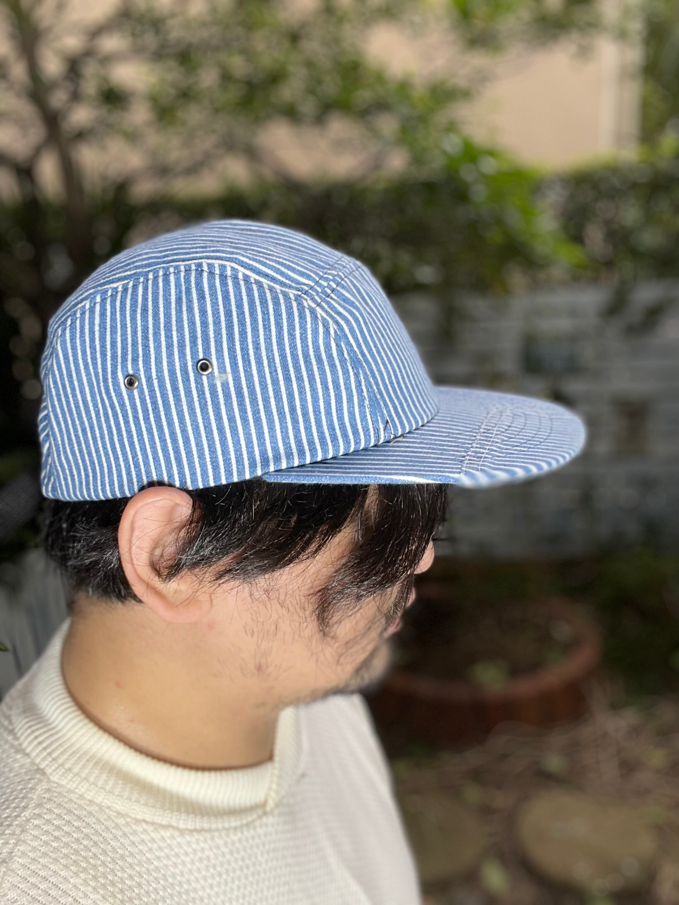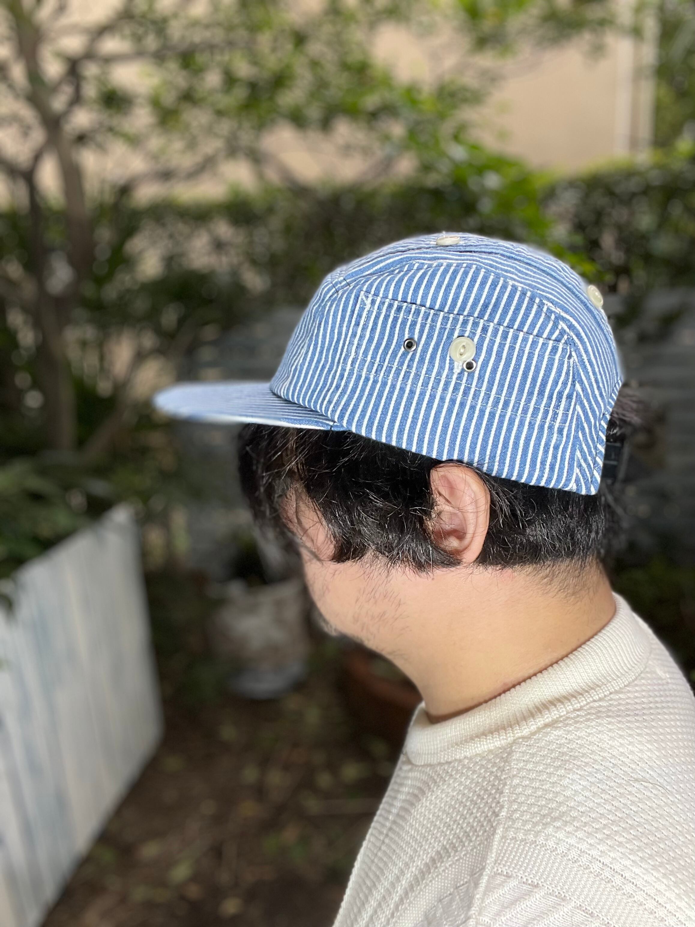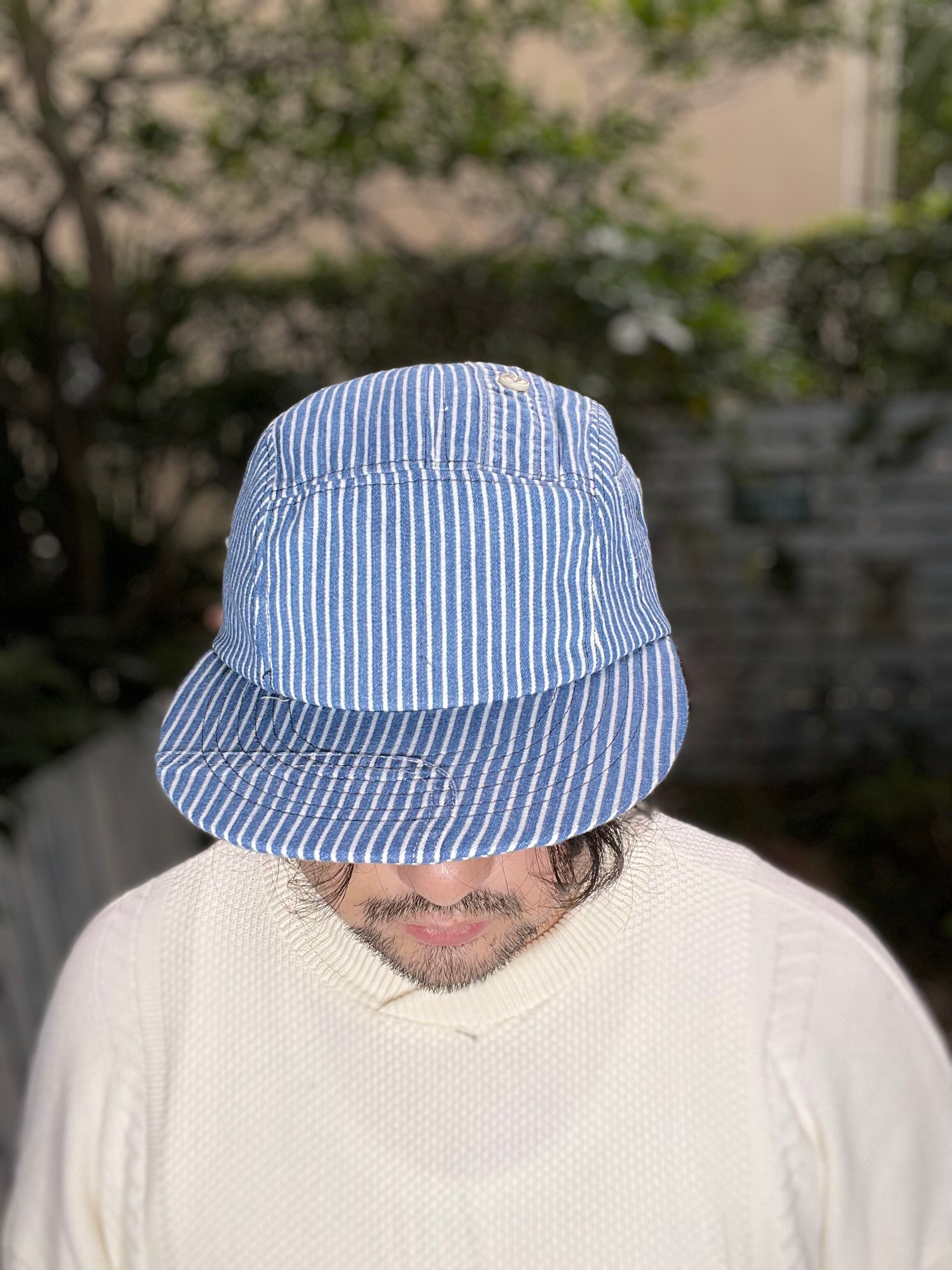古着のヒッコリーストライプシャツを解体してジェットキャップに仕立てました。