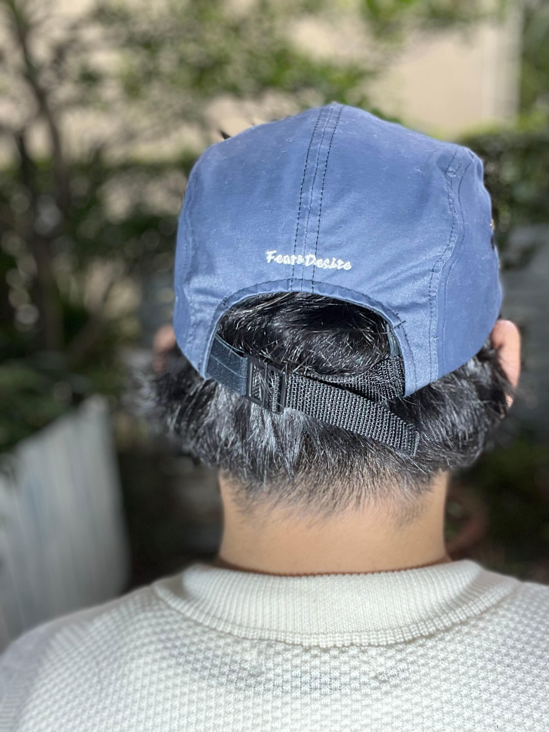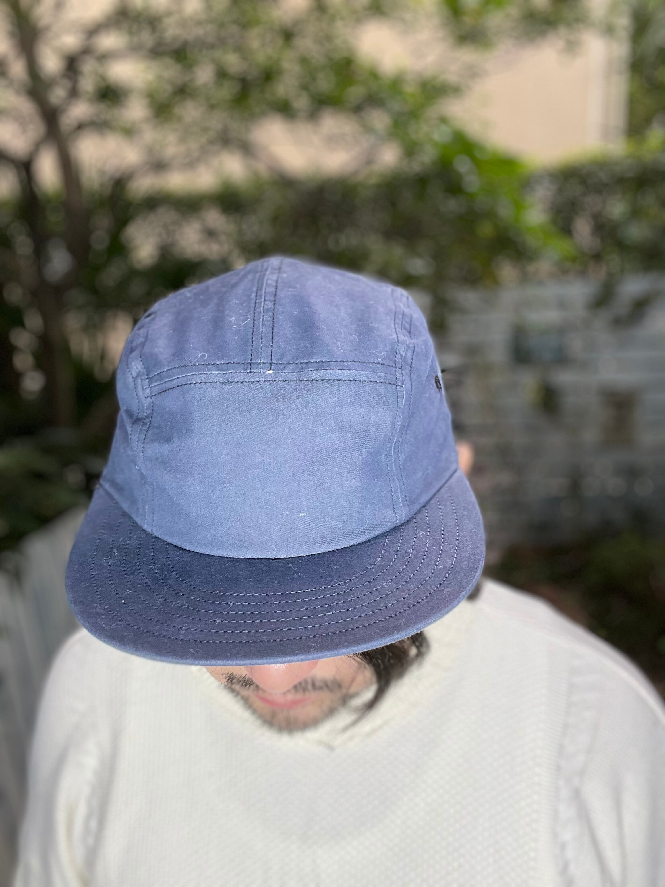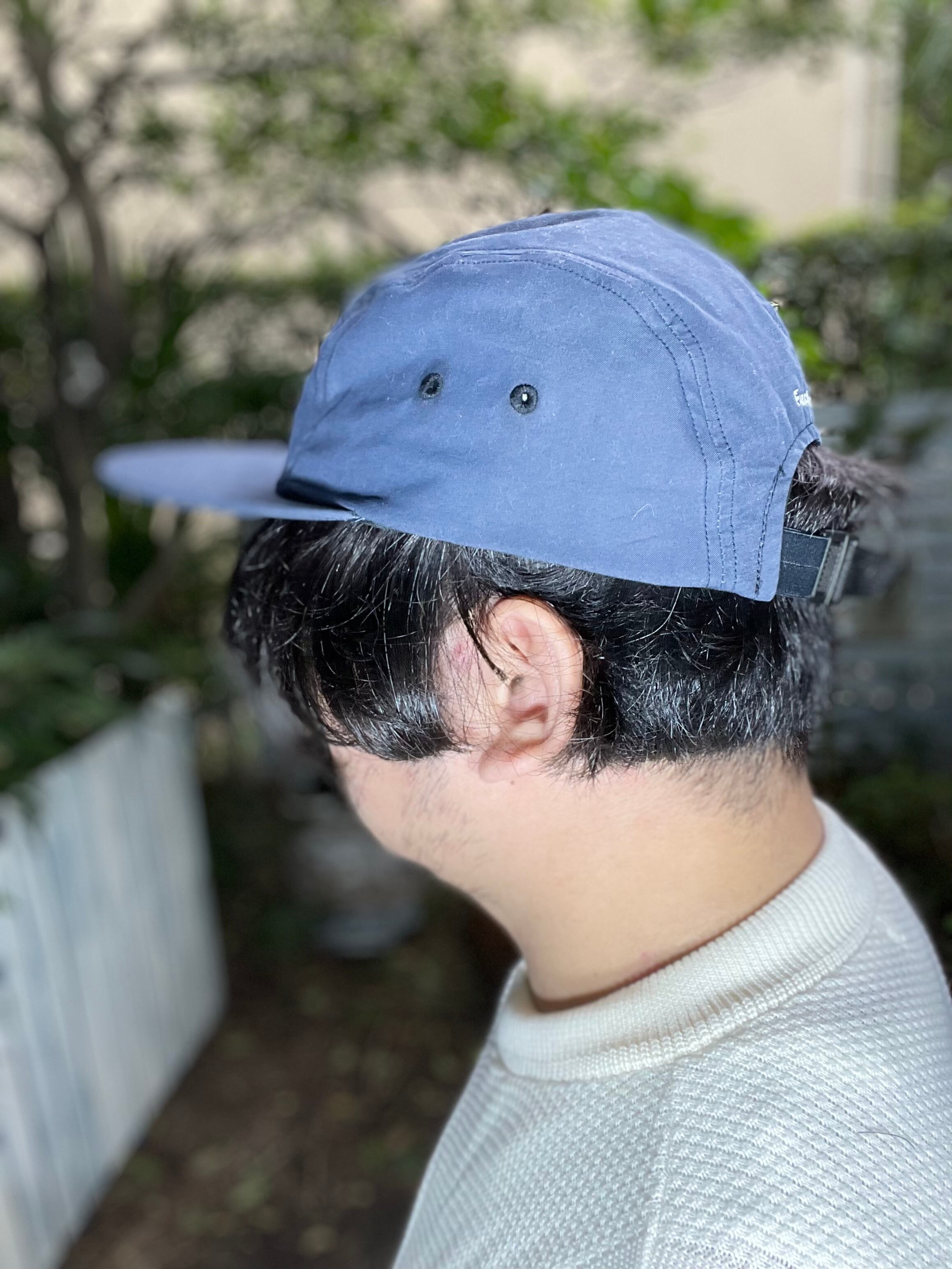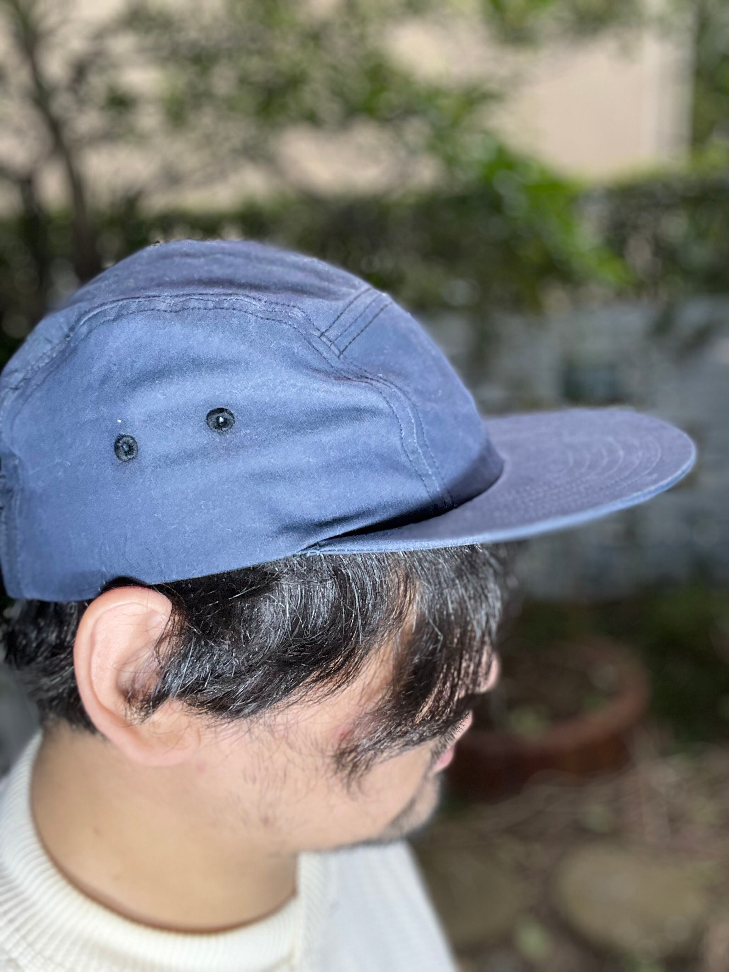 古着のトレンチコートに着目し、ヴィンテージライクなシャンブレーツイル生地を用いてジェットキャップに仕立てました。